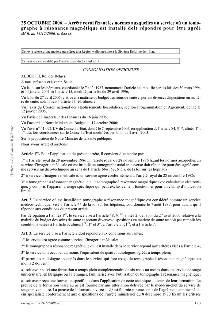 25 OCTOBRE 2006. – Arrêté royal fixant les normes auxquelles un service où un tomographe à résonance magnétique est installé doit répondre pour être agréé (M.B. du 11/12/2006, p. 68848) Ce texte relève d’une matière transférée à la Région wallonne suite à la Sixième Réforme de l’État. Cet arrêté a été modifié par l’arrêté royal du 25 avril 2014. Wallex – Le droit en Wallonie CONSOLIDATION OFFICIEUSE ALBERT II, Roi des Belges, A tous, présents et à venir, Salut. Vu la loi sur les hôpitaux, coordonnée le 7 août 1987, notamment l’article 44, modifié par les lois des 30 mars 1994 et 14 janvier 2002, et l’article 15, modifié par la loi du 29 avril 1996; Vu la loi du 27 avril 2005 relative à la maîtrise du budget des soins de santé et portant diverses dispositions en matière de santé, notamment l’article 57, §6, alinéa 2; Vu l’avis du Conseil national des établissements hospitaliers, section Programmation et Agrément, donné le 12 janvier 2006; Vu l’avis de l’Inspecteur des Finances du 16 juin 2006; Vu l’accord de Notre Ministre du Budget du 17 octobre 2006; Vu l’avis n° 41.092/1/V du Conseil d’Etat, donné le 7 septembre 2006, en application de l’article 84, §1er, alinéa 1er, 1°, des lois coordonnées sur le Conseil d’Etat modifiées par la loi du 2 avril 2003; Sur la proposition de Notre Ministre de la Santé publique, Nous avons arrêté et arrêtons: Article 1er. Pour l’application du présent arrêté, il convient d’entendre par: 1° « l’arrêté royal du 28 novembre 1986 »: l’arrêté royal du 28 novembre 1986 fixant les normes auxquelles un service d’imagerie médicale où est installé un tomographe axial transverse doit répondre pour être agréé comme service médico-technique au sens de l’article 6bis, §2, 6°bis, de la loi sur les hôpitaux; 2° « service d’imagerie médicale »: un service agréé conformément à l’arrêté royal du 28 novembre 1986; 3° « tomographe à résonance magnétique »: le tomographe à résonance magnétique avec calculateur électronique, y compris l’appareil à usage spécifique qui peut exclusivement fonctionner pour un champ d’indication limité. Art. 2. Le service où est installé un tomographe à résonance magnétique est considéré comme un service médico-technique, visé à l’article 44 de la loi sur les hôpitaux, coordonnée le 7 août 1987, pour autant qu’il réponde aux conditions du présent arrêté. Par dérogation à l’alinéa 1er, le service visé à l’article 48, §1er, alinéa 2, de la loi du 27 avril 2005 relative à la maîtrise du budget des soins de santé et portant diverses dispositions en matière de santé ne doit pas remplir les conditions visées à l’article 3, alinéa 1er, 1° et 3°, à l’article 5, §1er, et à l’article 7. Art. 3. Le service visé à l’article 2 doit répondre aux conditions suivantes: 1° le service est agréé comme service d’imagerie médicale; 2° le tomographe à résonance magnétique qui est installé dans le service répond aux critères visés à l’article 4; 3° le service doit occuper au moins l’équivalent de quatre radiologues agréés à temps plein; 4° parmi les radiologues occupés dans le service, qui font usage du tomographe à résonance magnétique, au moins 2 doivent: a) soit avoir suivi une formation à temps plein complémentaire de six mois au moins dans un service de stage universitaire, en Belgique ou à l’étranger, familiarisé avec l’utilisation du tomographe à résonance magnétique; b) soit avoir reçu une formation spécifique dans l’application de cette technique au cours de leur formation. La preuve de la formation visée au a) est fournie par une attestation délivrée par le médecin-chef du service de stage universitaire. La preuve de la formation visée au b) est fournie par une copie de l’agrément comme médecin spécialiste conformément aux dispositions de l’arrêté ministériel du 8 décembre 1980 fixant les critères En vigueur du 21/12/2006 au ... 1/3 spéciaux d’agréation des médecins spécialistes, des maîtres de stages et des services de stage pour la spécialité de radiodiagnostic. Les documents visés au b) sont joints au dossier d’agrément du service. Art. 4. Le tomographe à résonance magnétique ne peut être installé que pour autant qu’il répondre aux critères suivants: 1° l’installation doit être équipée des antennes spécialisées nécessaires aux différents examens; 2° un minimum d’installations de sécurité doit être présent, permettant un contact visuel et acoustique entre le patient et l’examinateur, un monitorage par électrocardiogramme, un dispositif de détection de métaux, un système non ferromagnétique de transport du patient, un système de réanimation adapté, un système anti-incendie adapté; 3° la localisation et l’installation doivent répondre à des prescriptions minimales concernant l’interaction magnétique et la protection des ondes de radiofréquence. Art. 5. §1er. Un tomographe à résonance magnétique ne peut être installé que dans un service d’imagerie médicale situé dans un hôpital et ayant un agrément en application du présent arrêté. Wallex – Le droit en Wallonie §2. A titre exceptionnel et en vue d’une répartition géographique optimale, un tomographe à résonance magnétique peut, par dérogation au §1er, être installé dans un service visé à l’article 1er, §§1er et 4 de l’arrêté royal du 25 octobre 2006 fixant le nombre maximum de services où un tomographe à résonance magnétique est installé qui peuvent être exploités, à bord d’un véhicule qui est stationné à l’hôpital. La dérogation visée à l’alinéa 1er est uniquement autorisée lorsque le service visé est exploité dans le cadre d’une association agréée, et plus particulièrement sur le site de l’un des hôpitaux participan