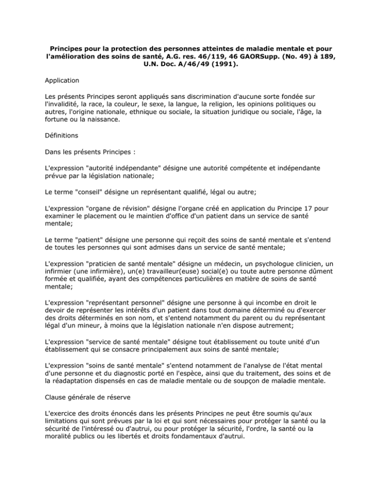 Principes pour la protection des personnes atteintes de maladie mentale et pour l'amélioration des soins de santé, A.G. res. 46/119, 46 GAORSupp. (No. 49) à 189, U.N. Doc. A/46/49 (1991). Application Les présents Principes seront appliqués sans discrimination d'aucune sorte fondée sur l'invalidité, la race, la couleur, le sexe, la langue, la religion, les opinions politiques ou autres, l'origine nationale, ethnique ou sociale, la situation juridique ou sociale, l'âge, la fortune ou la naissance. Définitions Dans les présents Principes : L'expression "autorité indépendante" désigne une autorité compétente et indépendante prévue par la législation nationale; Le terme "conseil" désigne un représentant qualifié, légal ou autre; L'expression "organe de révision" désigne l'organe créé en application du Principe 17 pour examiner le placement ou le maintien d'office d'un patient dans un service de santé mentale; Le terme "patient" désigne une personne qui reçoit des soins de santé mentale et s'entend de toutes les personnes qui sont admises dans un service de santé mentale; L'expression "praticien de santé mentale" désigne un médecin, un psychologue clinicien, un infirmier (une infirmière), un(e) travailleur(euse) social(e) ou toute autre personne dûment formée et qualifiée, ayant des compétences particulières en matière de soins de santé mentale; L'expression "représentant personnel" désigne une personne à qui incombe en droit le devoir de représenter les intérêts d'un patient dans tout domaine déterminé ou d'exercer des droits déterminés en son nom, et s'entend notamment du parent ou du représentant légal d'un mineur, à moins que la législation nationale n'en dispose autrement; L'expression "service de santé mentale" désigne tout établissement ou toute unité d'un établissement qui se consacre principalement aux soins de santé mentale; L'expression "soins de santé mentale" s'entend notamment de l'analyse de l'état mental d'une personne et du diagnostic porté en l'espèce, ainsi que du traitement, des soins et de la réadaptation dispensés en cas de maladie mentale ou de soupçon de maladie mentale. Clause générale de réserve L'exercice des droits énoncés dans les présents Principes ne peut être soumis qu'aux limitations qui sont prévues par la loi et qui sont nécessaires pour protéger la santé ou la sécurité de l'intéressé ou d'autrui, ou pour protéger la sécurité, l'ordre, la santé ou la moralité publics ou les libertés et droits fondamentaux d'autrui. Principe 1 Libertés fondamentales et droits de base 1. Toute personne a droit aux meilleurs soins de santé mentale disponibles, dans le cadre du système de santé et de protection sociale. 2. Toute personne atteinte de maladie mentale ou soignée comme telle doit être traitée avec humanité et dans le respect de la dignité inhérente à la personne humaine. 3. Toute personne atteinte de maladie mentale ou soignée comme telle a le droit d'être protégée contre toute forme d'exploitation économique, sexuelle ou autre, contre les mauvais traitements physiques ou autres et contre les traitements dégradants. 4. Aucune discrimination fondée sur la maladie mentale n'est admise. Le mot "discrimination" s'entend de tout traitement différent, exclusif ou préférentiel ayant pour effet de supprimer l'égalité de droits ou d'y faire obstacle. Les mesures spéciales visant uniquement à protéger les droits des personnes atteintes de maladie mentale ou à améliorer leur état ne doivent pas être considérées comme ayant un caractère discriminatoire. Il n'y a pas discrimination en cas de traitement différent, exclusif ou préférentiel conforme aux dispositions des présents Principes et nécessaire pour protéger les droits de l'homme d'une personne atteinte de maladie mentale ou de toute autre personne. 5. Toute personne atteinte de maladie mentale a le droit d'exercer tous les droits civils, politiques, économiques, sociaux et culturels reconnus dans la Déclaration universelle des droits de l'homme, le Pacte international relatif aux droits économiques, sociaux et culturels, le Pacte international relatif aux droits civils et politiques et d'autres instruments pertinents tels que la Déclaration des droits des personnes handicapées et l'Ensemble de principes pour la protection de toutes les personnes soumises à une forme quelconque de détention ou d'emprisonnement. 6. Toute décision selon laquelle, en raison de sa maladie mentale, une personne n'a pas la capacité juridique et toute décision selon laquelle, en conséquence de cette incapacité, un représentant personnel sera nommé, ne sera prise qu'après que la cause aura été entendue équitablement par un tribunal indépendant et impartial institué par la législation nationale. La personne dont la capacité est en cause a le droit d'être représentée par un conseil. Si la personne dont la capacité est en cause ne s'assure pas elle-même les services d'un tel représentant, ce représentant sera mis à sa disposition sans frais dans la mesure où elle n'a pas les moyens suffisants pour rétribuer ses services. Le conseil ne doit pas représenter dans la même procédure un service de santé mentale ou son personnel et ne doit pas non plus représenter un membre de la famille de la personne dont la capacité est en cause, à moins que le tribunal n'ait la conviction qu'il n'y a pas de conflit d'intérêts. Les décisions concernant la capacité et la nécessité d'un représentant personnel doivent être réexaminées à des intervalles raisonnables prescrits par la législation nationale. La personne dont la capacité est en cause, son représentant personnel, le cas échéant, et toute autre personne intéressée auront le droit de faire appel des décisions en question devant un tribunal supérieur. 7. Quand un tribunal ou un autre organe judiciaire compétent constate qu'une perso