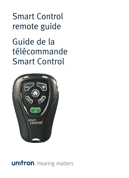 Smart Control remote guide Guide de la télécommande Smart Control Thank you Thank you for choosing Unitron Smart Control remote for your Unitron hearing aids. At Unitron, we care deeply about people with hearing loss. We work closely with hearing healthcare professionals to make advanced, purpose-driven solutions available to everyone. Because hearing matters. Remerciements Merci d’avoir choisi la télécommande Smart Control d’Unitron pour vos instruments auditifs Unitron. Chez Unitron, nous nous dévouons entièrement aux personnes souffrant de perte auditive. Nous travaillons en étroite collaboration avec des audioprothésistes afin de proposer des solutions de pointe, adaptées aux besoins de tous. Parce qu’entendre est important. Your Smart Control remote Hearing healthcare professional: _______________ __________________________________________ Telephone: _________________________________ Model: ____________________________________ Serial number:______________________________ Replacement batteries: One AAA (1.5 Volt), Standard or Rechargeable Warranty: __________________________________ Date of purchase: ___________________________ Quick reference Changing batteries 3 R 2 4 2 L R 6 1 7 8 L 5 9 10 11 Battery size AAA Low battery Warning left and right indicator lights blink alternately for 2 minutes On/off R L Off On 1 2 3 4 5 6 7 8 On-off switch Left-both-right switch Left (blue) indicator light Right (red) indicator light Scroll wheel +/– buttons Home button Telephone (or program) button 9 Program change button 10 LearnNow™ button 11 Battery compartment 1 Votre télécommande Smart Control Audioprothésiste :___________________________ __________________________________________ Téléphone : ________________________________ Modèle : ___________________________________ Numéro de série : ___________________________ Piles de remplacement : Une pile AAA (1,5 V), classique ou rechargeable Garantie : __________________________________ Date de l’achat : ____________________________ Aide-mémoire Remplacement des piles 3 R 2 4 2 L R 6 1 7 8 L 5 9 10 11 Type de pile AAA Avertissement de pile faible les voyants gauche et droit clignotent alternativement pendant 2 minutes Marche/arrêt R L Arrêt Marche 1 Bouton marche/arrêt 2 Bouton gauche/ bilatéral/droit 3 Voyant gauche (bleu) 4 Voyant droit (rouge) 5 Molette 6 Boutons +/– 7 Bouton d’accueil 8 Bouton téléphone (ou programme) 9 Bouton de changement de programme 10 Bouton LearnNowMC 11 Compartiment à pile 1 Table of contents / Table des matières Your Smart Control at a glance ...............................................2 Turning your Smart Control on and off....................................4 Replacing the battery ..............................................................5 Operating instructions.............................................................7 Adjusting your hearing aids with Smart Control.....................8 Accessories ............................................................................14 Caring for your Smart Control................................................15 Cleaning your Smart Control .................................................16 Troubleshooting guide...........................................................17 Warnings ................................................................................18 Aperçu de votre télécommande Smart Control.....................22 Mise en marche et arrêt de votre télécommande Smart Control ................................................................................24 Remplacement de la pile.......................................................26 Instructions d’utilisation .......................................................28 Réglage de vos instruments auditifs avec la télécommande Smart Control .....................................................................30 Accessoires............................................................................37 Entretien de votre télécommande Smart Control .................38 Nettoyage de votre télécommande Smart Control ...............39 Guide de dépannage.............................................................40 Avertissements......................................................................42 Declaration of conformity......................................................47 Your Smart Control at a glance 1 On-off switch - turn your remote control on or off and also lock it to avoid sending unintentional commands 2 Left-both-right switch - allows you to select the hearing aid you want to adjust 3 Left (blue) indicator light - flashes to indicate your left hearing aid is being adjusted 4 Right (red) indicator light - flashes to indicate your right hearing aid is being adjusted 5 Scroll wheel* - allows you to manage the levels of speech and background noise in your hearing aids 6 Volume control buttons* - adjusts the volume of your hearing aids 7 Home button - returns your hearing aids to their startup program 8 Telephone (or program) button - switches the hearing aid to the telephone program 9 Program change button - advances your hearing aid to their next listening program 10 LearnNow™ button - teaches your hearing aids your preferred settings in different listening programs 11 Battery compartment - allows access to change the battery * Control may be customized by your hearing healthcare professional so that the functions of 5 and 6 may be swapped. 2 3 2 4 6 1 7 8 5 9 10 2 R 5 L 1 11 3 Turning your Smart Control on and off Your Smart Control has an On-Off (or travel lock) switch on the left side of the remote. To turn the remote control on, slide the switch into the On or unlocked position . To turn the remote control off, slide the switch into the Off or locked position . Sliding the switch to the Off position will avoid sending unintentional commands to your hearing aids (while the remote is in your handbag or pocket, for example). R L Off On 4 Re