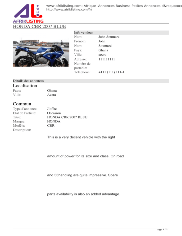 www.afriklisting.com: Afrique -Annonces Business Petites Annonces d’occ http://www.afriklisting.com/fr/ HONDA CBR 2007 BLUE Info vendeur Nom: Prénom: Nom: Pays: Ville: Adresse: Numéro de portable: Téléphone: John Soumaré John Soumaré Ghana accra 111111111 +111 (111) 111-1 Détails des annonces Localisation Pays: Ville: Ghana Accra Commun Type d’annonce: Etat de l’article: Titre: Marque: Modèle: Description: J’offre Occasion HONDA CBR 2007 BLUE HONDA CBR This is a very decent vehicle with the right amount of power for its size and class. On road and 35handling are quite impressive. Spare parts availability is also an added advantage. page 1 / 2 www.afriklisting.com: Afrique -Annonces Business Petites Annonces d’occ http://www.afriklisting.com/fr/ This vehicle is a winner Option de Prix: Prix sur Demande Anneés: 2007 Informations supplémentaires Adresse: Information suppléméntaire / Moyen de Contact / Téléphone: MOYOYO MOTORS MADINA ZONGO JUNCTION Accra (+233) 542984895 page 2 / 2 Powered by TCPDF (www.tcpdf.org)