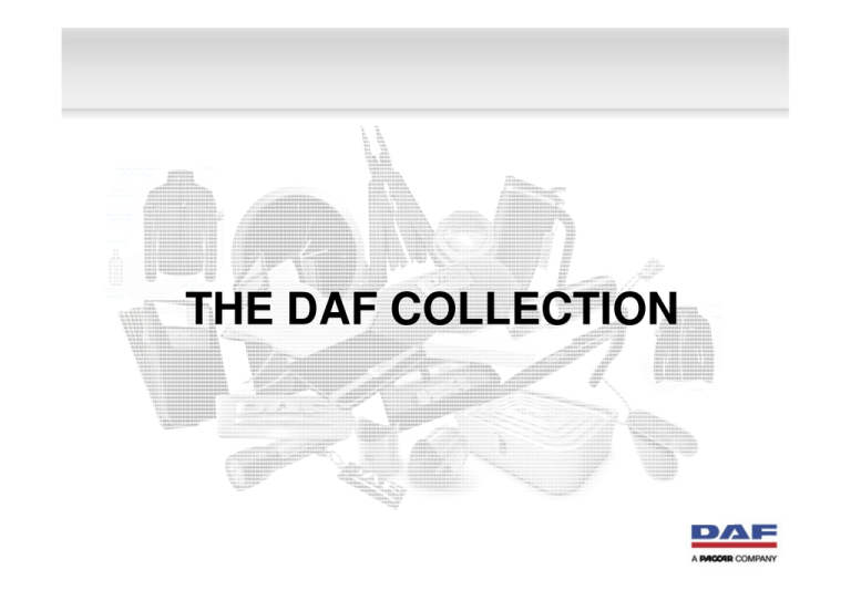 THE DAF COLLECTION Merchandise (1) Sac de voyage DAF Part No M003295 Trousse de toilette DAF Part No M003297 Sacoche DAF Part No M003307 Parapluie DAF Part No M003321 Merchandise (2) Thermos DAF Part No M003300 Thermos taille moyenne DAF Part No M003301 Ceinture DAF Part No M003310 Casquette DAF Part No M003299 Merchandise (3) Bonnet DAF Part No M0033003 Serviette DAF Part No M003302 Écharpe DAF Part No M003304 Porte-monnaie DAF Part No M003306 Merchandise (4) Ballon de football DAF Part No M0033008 Balles de gold DAF (x3) Part No M003317 Lingettes DAF Part No M003296 Porte-clés en métal DAF Part No M003309 Merchandise (4) Édition limitée DAF Part No M003412 Montre classique DAF Part No M003410 Boutons de manchette DAF Part No M003314 Broche en métal DAF Part No M003311 Clothing (1) Veste 2 en 1 DAF Part No’s M003329 M003330 M003331 M003332 M003333 M003334 S M L XL XXL XXXL Veste souple DAF Part No’s M003341 M003342 M003343 M003344 M003345 M003346 S M L XL XXL XXXL Veste chauffeur DAF Part No’s M003335 M003336 M003337 M003338 M003339 M003340 S M L XL XXL XXXL Clothing (2) Sweat à capuche DAF Part No’s M003365 S M003366 M M003367 L M003368 XL M003369 XXL M003370 XXXL Sweat DAF Part No’s M003359 M003360 M003361 M003362 M003363 M003364 S M L XL XXL XXXL Clothing (3) T-shirt blanc DAF Part No’s M003377 M003378 M003379 M003380 M003381 M003382 S M L XL XXL XXXL Polo blanc DAF Part No’s M003371 M003372 M003373 M003374 M003375 M003376 S M L XL XXL XXXL Clothing (4) T-shirt gris DAF Part No’s M003353 M003354 M003355 M003356 M003357 M003358 S M L XL XXL XXXL Polo gris DAF Part No’s M003347 M003348 M003349 M003350 M003351 M003352 S M L XL XXL XXXL Clothing (5) T-shirt DAF Euro 6 Part No’s M003429 M003430 M003431 M003432 M003433 M003434 Polo DAF Euro 6 S M L XL XXL XXXL Part No’s M003435 M003436 M003437 M003438 M003439 M003440 S M L XL XXL XXXL Kids (1) Sac à dos enfant DAF Part No M003318 Peluche DAF Part No M003319 Kit repas enfant DAF Part No M003320 Planche d'autocollants DAF Part No M003312 Kids (2) Casquette de baseball enfant DAF, orange Part No M003415 T-shirt enfant DAF Part No’s M003417 M003418 M003419 M003420 80 92 104 116 Polo enfant DAF Part No’s M003421 M003422 M003423 M003424 Casquette de baseball enfant DAF, bleue Part No M003416 116 128 140 152 Office (1) Pochette en cuir DAF Part No M003313 Porte cartes en cuir DAF Part No M003326 Carnet de notes DAF Part No M003305 Porte cartes professionnel en cuir DAF Part No M003327 Office (2) Stylo à bille caoutchouc DAF Part No M003298 Stylo Cross de luxe homme DAF Part No M003315 Euro 6 Montre sport DAF Part No M003413 Horloge murale DAF Part No M003402 Verre XF DAF Part No M003414 Casquette DAF Euro 6 Part No M003394 Miniatures Miniature Euro 6 WSI Large 1:50 Part No M003395 Miniature Euro 6 Tekno Large 1:50 Part No M003397 Miniature Euro 6 WSI Small 1:87 Part No M003396 Ladies (1) Coupe Alessi Part No M003428 Collier Part No M003427 Coffret cadeau Rituals Part No M003426 (Large) M003441 (Small) Trousse de toilette Rituals Part No M003425 Ladies (2) Montre femme DAF Part No M003411 Écharpe Pashmina DAF Part No M003409 Events (1) Bonbons Part No M003328 Ballons Part No M003322 Boîte surprise Part No M003404 Bouteille d'eau Part No M003406 Porte-clés en PVC doux Part No M003323 Events (1) Briquet Part No M003324 Post-its Part No M003405 Jeu de cartes Part No M003403 Sacs plastique Part No M003342 (Large) M003407 (Medium) Brochure (sample) Brochure available in week 41 Images in Brochure