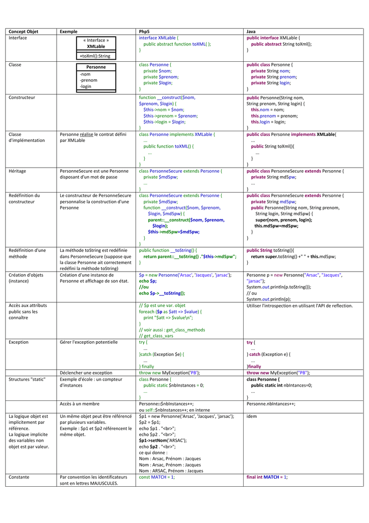 foreach ($p as $att => $value) { print "$att => $value\n"; } // voir aussi : get_class_methods // get_class_vars try { ... }catch (Exception $e) { ... } finally throw new MyException('PB');