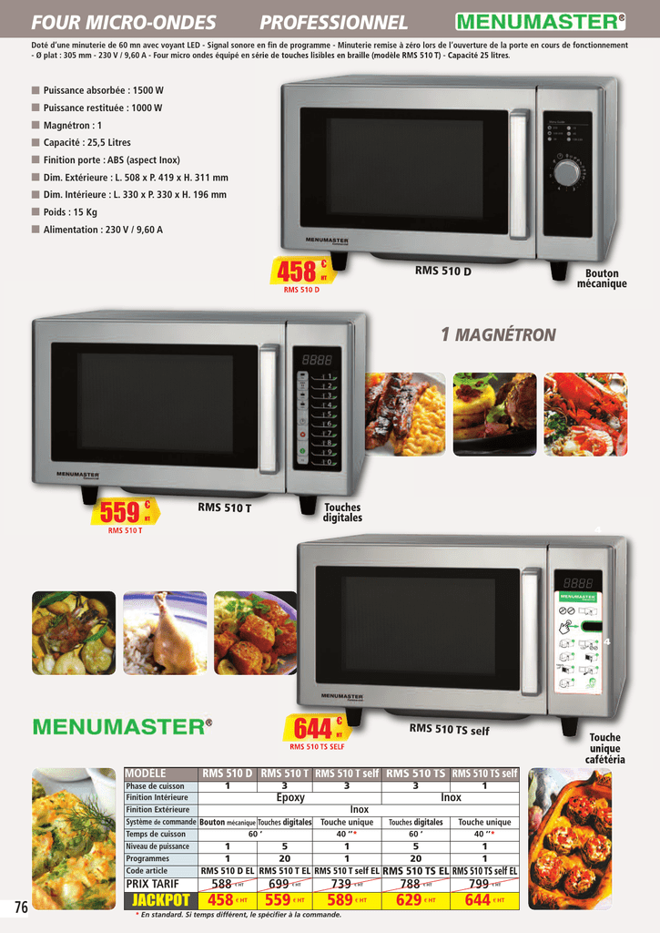 FOUR MICRO-ONDES PROFESSIONNEL Doté d’une minuterie de 60 mn avec voyant LED - Signal sonore en fin de programme - Minuterie remise à zéro lors de l’ouverture de la porte en cours de fonctionnement - Ø plat : 305 mm - 230 V / 9,60 A - Four micro ondes équipé en série de touches lisibles en braille (modèle RMS 510 T) - Capacité 25 litres. n Puissance absorbée : 1500 W n Puissance restituée : 1000 W n Magnétron : 1 n Capacité : 25,5 Litres n Finition porte : ABS (aspect Inox) n Dim. Extérieure : L. 508 x P. 419 x H. 311 mm n Dim. Intérieure : L. 330 x P. 330 x H. 196 mm n Poids : 15 Kg n Alimentation : 230 V / 9,60 A 458 € RMS 510 D HT Bouton mécanique RMS 510 D 1 MAGNÉTRON 559 € HT RMS 510 T Touches digitales 4 RMS 510 T 4 644 € RMS 510 TS self HT Touche unique cafétéria RMS 510 TS SELF MODÈLE RMS 510 D RMS 510 T RMS 510 T self RMS 510 TS RMS 510 TS self Phase de cuisson 1 3 3 Finition Intérieure Epoxy Finition Extérieure Inox Système de commande Bouton mécanique Touches digitales Touche unique Temps de cuisson 60 ‘ 40 ‘’* Niveau de puissance 1 5 1 Programmes 1 20 1 Code article RMS 510 D EL RMS 510 T EL RMS 510 T self EL JACKPOT PRIX TARIF 76 588 458 E HT E HT 699 559 E HT E HT 739 589 * En standard. Si temps différent, le spécifier à la commande. E HT E HT 3 1 Inox Touches digitales 60 ‘ Touche unique 5 20 1 1 40 ‘’* RMS 510 TS EL RMS 510 TS self EL 788 629 E HT E HT 799 644 E HT E HT FOUR MICRO-ONDES PROFESSIONNEL Clavier tactile à 10 chiffres - Jusqu’à 100 réglages de menus - Minuterie dégressive de 60 mn pour chaque phase de cuisson - Doté d’une minuterie de 60 mn avec voyant LED et signal sonore en fin de programme - Lors de l’ouverture de la porte en cours de fonctionnement, la minuterie n’est pas automatiquement remise à zéro et poursuit son décompte dès que la porte est refermée - Ø plat : 305 mm - Four micro-ondes équipé en série de touches lisibles en braille (modèle RMS 511 TS) Version Self sur demande. 659 € MODÈLE HT Puis. restituée RCS 511 DSE RCS 511 DSE RCS 511 DSE RCS 511 TS 1550 W 1100 W Puis. absorbée 1 Magnétron 34 Litres Capacité Phase de cuisson Finition Intérieure Finition Extérieure Finition porte Dim. Extérieure Dim. Intérieure Bouton mécanique 4 Inox Inox Inox L. 559 x P. 483 x H. 349 L. 368 x P. 381 x H. 216 19 Kg Poids 230 V / 13 A Alimentation Système de commande Bouton mécanique Touches digitales Temps de cuisson 10 ‘ 60 ‘ 5 Niveau de puissance 1 100 RCS 511 DSE EL RCS 511 TS EL Programmes Code article JACKPOT 799 PRIX TARIF RCS 511 TS Touches digitales 840 E HT 1030 E HT E HT 840 E HT 659 € HT RCS 511 TS Le four super professionnel pour usage intensif Modèles compacts développant de 1400 à 2100 W - Garantissent des performances tout en puissance pour préparer quelques portions rapides - Durables et compacts - Idéaux pour un usage professionnel - Méthode unique répartissant l’énergie permettant d’obtenir un résultat homogène supérieur qui élimine les points brûlants ou froids résiduels - Conçus pour satisfaire aux exigences et à la cadence intensive des cuisines les plus affairées. MODÈLE DEC 14 E2 DEC 18 E2 DEC 21 E2 2300 W 2900 W 3100 W 1400 W 1800 W 2100 W Puis. absorbée Puis. restituée 2 Magnétron 17 Litres Capacité Phase de cuisson Finition Intérieure Finition Extérieure Finition porte Dim. Extérieure Dim. Intérieure DEC 14 E2 - DEC 18 E2 - DEC 21 E2 Touches digitales 1499 DEC 14 E2 € HT 4 Inox Inox Inox L. 425 x P. 578 x H. 343 L. 330 x P. 305 x H. 171 Poids 30 Kg Alimentation 230 V / 10 A 230 V / 12,6 A 230 V / 13,5 A Système de commande Touches digitales Temps de cuisson 60 ‘ Niveau de puissance 11 Programmes 100 Code article DEC 14 E2 EL JACKPOT 1499 PRIX TARIF 1899 E HT E HT DEC 18 E2 EL 2299 1830 E HT E HT DEC 21 E2 EL 2599 2055 E HT E HT 2 MAGNÉTRONS Entièrement INOX 77 FOUR MICRO-ONDES PROFESSIONNEL Entièrement en acier inox - Clavier tactile à 10 chiffres - Jusqu’à 100 réglages de cuisson - Minuterie dégressive jusuqu’à 60mn - Signal de fin de cuisson réglable - Hublot en verre trempé Eclairage intérieur Filtre à air permanent en série avec rappel de nettoyage du filtre - Modèles empilables pour une meilleure optimisation de l’espace - 5 niveaux de puissance Temps de cuisson maxi : 60mn - 230 V / 12 A - Four micro-ondes équipé en série de touches lisibles en braille 2 MAGNÉTRONS L’OUTIL DU CHEF Entièrement INOX RFS 518 TS 3000 W 1800 W MODÈLE Puis. absorbée Puis. restituée 2 Magnétrons 1739 RFS 518 TS 34 Litres Capacité Phase de cuisson Finition Intérieure Finition Extérieure Finition porte Dim. Extérieure € Dim. Intérieure 4 Inox Inox Inox L. 552 x P. 514 x H. 362 L. 362 x P. 406 x H. 226 29 Kg Poids HT Alimentation Système de commande Temps de cuisson Niveau de puissance Programmes RFS 518 TS Touches digitales 230 V / 12 A Touches digitales 60 ‘ 5 100 RFS 518 TS EL Code article JACKPOT UTILISATION INTENSE 2099 PRIX TARIF 1739 E HT E HT FOUR MICRO-ONDES SUPER PROFESSIONNEL “JETWAVE” Four Grande Vitesse Combiné Adapté aux cafés & bistros, sandwicheries & boulangeries, supermarchés, kiosques, pubs & bars à vin n Cuit 4 fois plus vite qu’un four conventionnel - 100 menus préprogrammables et 11 niveaux de puissance n Carte EZ pour l’organisation des menus n Ouverture de porte à plus de 90° n Front escamotable, filtre à air nettoyable avec rappel “Clean filter” CONVECTION MICRO-ONDES • 2700 W • Réglable entre 65° et 250°C • 1400 W • Antenne en voûte MODÈLE Capacité DS1400E 34 Litres Dim. interne L. 330 x P. 380 x H. 266 Dim. externe L. 502 x P. 616 x H. 460 Puissance Poids Code article JACKPOT PRIX TARIF 5999 € HT DS1400E Absorbée : 3400 W Restituée : 1400 W 43 Kg DS1400E EL 7250 E HT 5999 DS1400E E HT FOUR MICRO-ONDES SUPER PROFESSIONNEL “MXP XPRESS” Le four combine 3 sources de puissances INFRA-ROUGE MICRO-ONDES CONVECTION • 2200 W • D