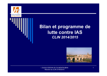 Bilan et programme de lutte contre IAS CLIN 2014/2015 I. DIJOLS EDOHH 82 CH MONTAUBAN Réunion du CLIN 27/05/2015 1 Incidence et prévalence IAS Surveillance REA Inf. multisite Annuelle RAISIN Suivi ISO Ciblée Chirurgie Semestrielle Nationale RAISIN Conso ATB et Résistance An N-1 CCLIN SO Suivi BMR Annuelle Toutes unités Suivi AES Toutes unités Annuelle CCLIN SO Signalement I Nosocomiale En continue Interne+-externe I.. DIJOLS EDOHH 82 CH MONTAUBAN Réunion du CLIN 23/05/2014 2 Indicateurs PHA Consommation PHA en litre/1000 JH 30 25 20 15 10 5 0 2007 2008 2009 2010 2011 2012 2013 2014 ICSHA indicateur publié ETS : 83 % Indicateur annuel par unité en % par rapport à objectif : au minimum 80 % I. DIJOLS EDOHH 82 CH MONTAUBAN Réunion du CLIN 23/05/2014 3 Audit H des mains Port de bijoux et ongles / 07/2014 Toutes unités / 653 observations / Conformité globale gain de 14 % Evolution du taux de conformité du port de bijou entre 2012 et 2014 selon la catégorie professionelle 100% 90% 80% 70% 60% 50% 40% 30% 20% 10% 0% 2012 2014 I. DIJOLS EDOHH 82 CH MONTAUBAN Réunion du CLIN 23/04/2012 4 Indicateurs SARM I. DIJOLS EDOHH 82 CH MONTAUBAN Réunion du CLIN 23/05/2014 5 Analyse des causes bactériémie à SARM acquise dans l’établissement : Indicateur national I. DIJOLS EDOHH 82 CH MONTAUBAN Réunion du CLIN 23/05/2014 6 Indicateurs EBLSE I. DIJOLS EDOHH 82 CH MONTAUBAN Réunion du CLIN 23/05/2014 7 I. DIJOLS EDOHH 82 CH MONTAUBAN Réunion du CLIN 23/05/2014 8 Mise en place des précautions complémentaires 86% 81% 70% 78% 46% NON OUI Signalisation UMP conforme Isolement technique Isolement géographique Prescription médicale PC Formulaire précautions complémentaire dans dossier patient ; Ne pas oublier de lever les mesures ! I. DIJOLS EDOHH 82 CH MONTAUBAN Réunion du CLIN 23/05/2014 9 Pictogramme d’alerte sur DPI pour patient en PC Planning d’hébergement Fenêtre de prescription et du dossier de soins informatisé : dans le bandeau du patient sur fond orange 10 Résultats audit bionettoyage de l’environnement proche des patients (n= 119) 100% 90% 80% 70% 60% 50% 40% 30% 20% 10% 0% Jamais Insuffisant Conforme I. DIJOLS EDOHH 82 CH MONTAUBAN Réunion du CLIN 23/04/2012 11 Signalements internes et externes I. DIJOLS EDOHH 82 CH MONTAUBAN Réunion du CLIN 23/05/2014 12 Signalements internes IAS I. DIJOLS EDOHH 82 CH MONTAUBAN Réunion du CLIN 23/05/2014 Surveillance environnement (1) I. DIJOLS EDOHH 82 CH MONTAUBAN Réunion du CLIN 23/05/2014 14 Prévention Infections Nosocomiales (1) Groupes de travail pérennes 1. BMR et épidémiologie : Signalement dossier informatisé par formulaire ;Procédure dépistage EPC non opérationnelle Environnement : gestion des problématiques liées à l’eau, procédure arrêt inopiné de l’air dans les salles du BO, les travaux en particulier BO Suivi des IAS : Fiche type complété par type d’infection Prévention des AES : Extension KT sscut et bistouris sécurisés / Evaluation du matériel restant à sécuriser / Pb des pots à urines non résolu. Travaux : validation des mesures lors de chantiers ( BO++; Salle de Cardiologie interventionnelle…. EOHH et Pharmacie : Evaluation de DM en place et changement dans le cadre du nouveau marché 2. 3. 4. 5. 6. I. DIJOLS EDOHH 82 CH MONTAUBAN Réunion du CLIN 23/05/2014 15 Prévention Infections Nosocomiales (2) Groupes de travail ponctuels avec les équipes soignantes pour mise en place procédures Voie veineuse centrale Soins de stomie Préparation cutanée de l’opéré Procédures de prise en charge patient suspect Ebola ( PASS, Urgences..) Entretien des respirateur réa et masque VNI Désinfection du bronchoscope en période de garde Soins aux NN et prématurés Bionettoyage des unités de soins ; révision traçabilité I. DIJOLS EDOHH 82 CH MONTAUBAN Réunion du CLIN 23/04/2012 16 Prévention Infections Nosocomiales (3) : 22 FT, MO ou protocoles Révision procédures Création nouvelles procédures : 45 FT, MO ou protocoles I. DIJOLS EDOHH 82 CH MONTAUBAN Réunion du CLIN 23/05/2014 17 Prévention Infections Nosocomiales (2) Participation aux commissions ou groupes travail institutionnels CLAN et groupe de travail HACCP CUS Commission Linge Travaux au bloc opératoire I. DIJOLS EDOHH 82 CH MONTAUBAN Réunion du CLIN 23/04/2012 18 Evaluations des pratiques (1) Réalisées 2014 / Prévus 2015 Audit préparation cutanée de l’opéré Audit bionettoyage de l’environnement proche patient Audit traitement des endoscopes toutes spécialités Audit port de bijoux aux mains et poignets Audit sur mise en place des précautions complémentaires ACP sur AES aux urgences ACP sur contamination d’un bronchoscope Audit traitement des endoscopes toutes spécialités Audit national Précautions complémentaires Gestion des excreta Pose des VVP par observation Sondage urinaire à demeure par auto-questionnaire I. DIJOLS EDOHH 82 CH MONTAUBAN Réunion du CLIN 23/05/2014 19 Formations en hygiène hospitalière (2) Du personnel hospitalier par l’EOHH et correspondants en HH : - Désinfection des mains par friction : plusieurs sessions / 72 participants Journée nationale hygiène des mains : 323 participants Précautions complémentaires : 431 personnels Préparation cutanée de l’opéré : 108 professionnels chirurgies et BO CAT lors d’un AES : 23 personnels SLC, ste, service intérieurs Utilisation des lave bassins ARJO dans 8 unités ; 31 participants Formation des nouveaux arrivants : 9 personnes Utilisation des collecteurs OPCT urgences et UHCD : Précautions complémentaires lors des transferts : 6 brancardiers Signalement des IN / Surveillance ISO : individuel I. DIJOLS EDOHH 82 CH MONTAUBAN Réunion du CLIN 23/05/2014 20 Formations en hygiène hospitalière (1) Hygiène hospitalière et formation continue institutionnelle : 3 correspondants paramédicaux nouvellement nommés CCLIN SO à Toulouse (versus 1 en 2013 et 5 en 2012) Journée régionale des correspondants en HH (21 person