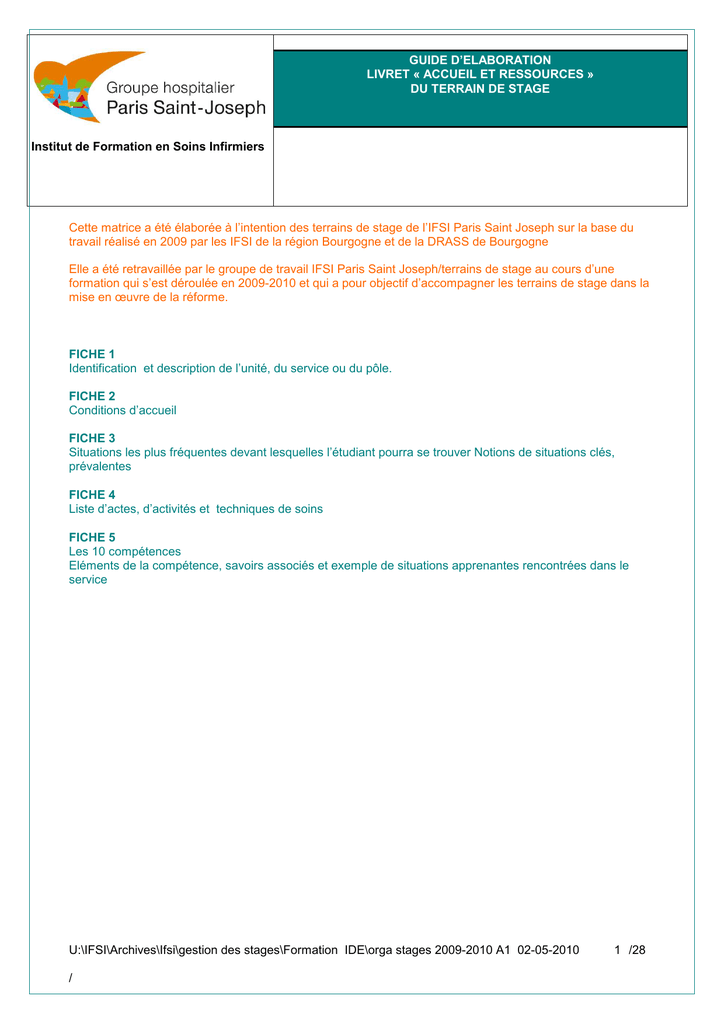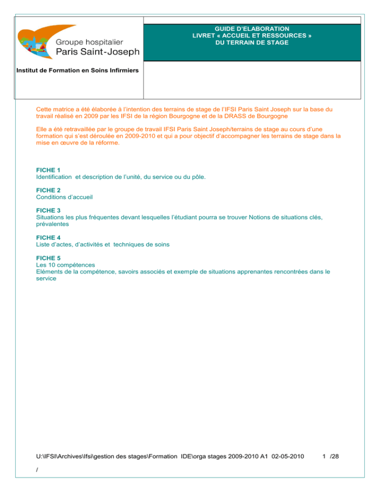 GUIDE D’ELABORATION LIVRET « ACCUEIL ET RESSOURCES » DU TERRAIN DE STAGE DES ETUDIANTS ENNFIRMIERS Institut de Formation en Soins Infirmiers Cette matrice a été élaborée à l’intention des terrains de stage de l’IFSI Paris Saint Joseph sur la base du travail réalisé en 2009 par les IFSI de la région Bourgogne et de la DRASS de Bourgogne Elle a été retravaillée par le groupe de travail IFSI Paris Saint Joseph/terrains de stage au cours d’une formation qui s’est déroulée en 2009-2010 et qui a pour objectif d’accompagner les terrains de stage dans la mise en œuvre de la réforme. GUIDE D’ELABORATION FICHE 1 Identification et description de l’unité, du service ou du pôle. FICHE 2 Conditions d’accueil FICHE 3 Situations les plus fréquentes devant lesquelles l’étudiant pourra se trouver Notions de situations clés, prévalentes FICHE 4 Liste d’actes, d’activités et techniques de soins FICHE 5 Les 10 compétences Eléments de la compétence, savoirs associés et exemple de situations apprenantes rencontrées dans le service U:\IFSI\Archives\Ifsi\gestion des stages\Formation IDE\orga stages 2009-2010 A1 02-05-2010 / 1 /28 FICHE 1 IDENTIFICATION ET DESCRIPTION DU SERVICE, UNITE OU POLE… INTITULE Intitulé du service, de l’unité : Réanimation Chirurgicale Pôle : BAAR (Bloc Anesthésie Ambulatoire Réanimation Etablissement : Groupe Hospitalier Paris Saint Joseph Adresse postale : 185 rue Raymont Losserand 75014 Paris Localisation dans l’établissement : Batiment NDBS Niveau 0 Porte 5 TYPOLOGIE DU STAGE Soins : courte durée X longue durée, de suite et de réadaptation santé mentale et psychiatrie individuels ou collectifs sur lieux de vie Spécialités ou orientation : Réanimation Chirurgicale, accueillant des patients en post-opératoire de tout type de chirurgie. Hospitalisation complète X Ambulatoire Hôpital de semaine Hôpital de jour Autre : précisez: Semestre 1 Semestre 2 Semestre 3 Semestre 4 Semestre 5 Semestre 6 (1 stage de 5 semaines) : (1 stage de 10 semaines) : (1 stage de 10 semaines) : (1 stage de 10 semaines) : (1 stage de 10 semaines) : X (1 stage de 10 semaines) : X + (1 stage de 5 semaines) : Capacité d’accueil : Lits : 10 Places : 10 Organigramme Cadre de pôle : Mail : Nom : Cadre de santé Mail : c charpignonhsj.fr Maître de stage : NOM : Téléphone : Nom :Charpignon Camille Téléphone : 01-44-12-77-54 Tuteurs : NOM : Guymont Hélène, Lerandy Sylvie , Pinault Pierre Charpignon Camille U:\IFSI\Archives\Ifsi\gestion des stages\Formation IDE\orga stages 2009-2010 A1 02-05-2010 / 2 /28 FICHE 2 CONDITIONS D’ACCUEIL Equipe de soins : Particularités / spécificités : Regroupe un grand nombre d’intervenant : Kinésithérapeute, Equipe de Soins Palliatifs, Psychiatre, Infirmière Référente Pansement, Bactèriologistes, Bénévoles… Médecins Nb de personnes 3 ETP Spécificité Cadres de santé 1 Tous les jours sauf week-end et jours féries Intendante ASH 2 AS 1 1 en 10h00 tous les jours et 1 en 8h00 tous les jours sauf week-end et jours fériés En 10h00 tous les jours IDE 5 Tous les jours sauf le dimanche où il n’y en a que 4 Autres professionnels : IDE Formatrice 1 Interne Kinésithérapeute 1 2 Médecin de Garde : Anesthésiste Réanimateur Externe 1 Tous les jours sauf week-end et jours fériés Tous les jours Tous les jours avec un système de garde pour le week-end De 18h00 à 9h00 2 Réanimateurs, 1 Cardiologue 1 ou 2 Horaires de l’équipe infirmière : Horaires de l’étudiant : Matin :7h10 / 19h50 Soir : 19h40 / 7h20 Jour : Nuit : Pas de roulement fixe Alternance jour /nuit Les horaires de l’étudiant seront les mêmes que ceux de l’équipe de jour ou de nuit. Travail de week end possible. Temps de transmission de 10 min le matin et le soir. X Modalités d’encadrement : Date de l’entretien d’accueil : J 2 ou J 3 pour les objectifs de stage Date de l’entretien de mi-parcours : 3 ème semaine et 6 ème semaine Date d’évaluation de fin de stage : Dernière semaine de stage U:\IFSI\Archives\Ifsi\gestion des stages\Formation IDE\orga stages 2009-2010 A1 02-05-2010 / 3 /28 Règles particulières d’organisation : Mise à disposition pour l’étudiant d’un vestiaire dans le service. Tenues jetables pour l’étudiant. Repas : 1 heure possibilité de manger dans le service Accès : Service fermé, code donné à l’étudiant à l’arrivée. U:\IFSI\Archives\Ifsi\gestion des stages\Formation IDE\orga stages 2009-2010 A1 02-05-2010 / 4 /28 FICHE 3 SITUATIONS LES PLUS FREQUENTES DEVANT LESQUELLES L’ETUDIANT POURRA SE TROUVER … NOTIONS DE SITUATIONS CLES, PREVALENTES Mission principale : Soins à visée : - éducative - préventive - diagnostique - curative X - palliative Caractéristiques essentielles de la population accueillie Patient opéré, nécessitant une surveillance post-opératoire. Patient mono ou poly défaillant. Pathologies et/ou situations prévalentes : Dans le service de Réanimation Chirurgicale sont accueillis : - des patients ayant subis une intervention chirurgicale lourde nécessitant une surveillance et un monitorage. Nous accueillons tous types de chirurgie : cardiaque, digestif, urologique, vasculaire, orthopédie, orl, gynécologique. - des patients porteur en pré-op de lourds antécédents : insuffisance cardiaque, insuffisance rénale, nécessitant donc une surveillance plus accrue en post-opératoire. - des patients ayant présenté des complications à l’induction ou en cours d’intervention nécessitant une surveillance rapprochée en post-opératoire (allergie à l’induction, saignement per opératoire…) Les Pré requis : 2.4S1 ; 2 5S3 ; 2.7S4 ; 2.8S3 ; 2.9S5 ; 2.10S1. Protocoles de soins, utilisation de bonnes pratiques (les citer) Dans le service est mis à disposition de l’étudiant : - Tous les protocoles de soins propre au service : sous forme de classeur consultable dans le service par l’étudiant ou des cours donnés par les médec
