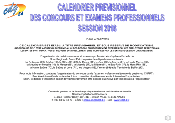 Publié le 22/07/2015 CE CALENDRIER EST ETABLI A TITRE PREVISIONNEL ET SOUS RESERVE DE MODIFICATIONS. UN CONCOURS PEUT ETRE AJOUTE OU SUPPRIME AU VU DES BESOINS EN RECRUTEMENT EXPRIMES PAR LES EMPLOYEURS TERRITORIAUX. LES DATES SONT INDICATIVES ET PEUVENT EVENTUELLEMENT ETRE MODIFIEES PAR LE CENTRE DE GESTION ORGANISATEUR. L’organisation de certains concours et examens professionnels s’opère à l’échelle de l’Inter Région du Grand Est composée des départements suivants : les Ardennes (08), l’Aube (10), la Côte d’Or (21), le Doubs (25), le Jura (39), la Marne (51), la Haute Marne (52), la Meurthe-et-Moselle (54), la Meuse (55), la Moselle (57), la Nièvre (58), le Bas-Rhin (67), le Haut-Rhin (68), la Haute Saône (70), la Saône et Loire (71), les Vosges (88), l’Yonne (89) et le Territoire de Belfort (90). Pour toute information, contactez l’organisateur du concours ou de l’examen professionnel (centre de gestion ou CNFPT). Pour être informé(e) de toute mise à jour, consultez régulièrement le site Internet de l’organisateur. Enfin, le dossier d’inscription papier devra impérativement être déposé ou envoyé par voie postale à l’organisateur. Centre de gestion de la fonction publique territoriale de Meurthe-et-Moselle Service Opérationnel Concours 2, allée Pelletier Doisy–B.P. 340 - 54602 VILLERS-LES-NANCY Tél : 03 83 67 48 20 – Email : [email protected] – Site : www.cdg54.fr 1 Le concours est le principal mode d’accès à la fonction publique. Il garantit l’égalité d’accès aux emplois publics. L’ouverture d’un concours dépend des besoins en recrutement déclarés par les collectivités territoriales et du nombre de lauréats des précédentes sessions du concours toujours à la recherche d’un poste. Les concours sont organisés par les centres de gestion de la fonction publique territoriale ou par le Centre National de la Fonction Publique Territoriale (CNFPT). Certaines collectivités territoriales non affiliées à un centre de gestion peuvent organiser leurs propres concours. La réussite à un concours ne vaut pas recrutement. Il appartient aux lauréats inscrits sur liste d’aptitude de rechercher un emploi en postulant auprès des collectivités territoriales dont l’autorité territoriale est seule investie du pouvoir de nomination. La liste d’aptitude a une valeur nationale. L’inscription sur la liste d’aptitude est valable un an, renouvelable deux fois à la demande de l’intéressé(e), un mois avant le terme de la première année et un mois avant le terme de la deuxième année. Types de concours et conditions générales à remplir pour être candidats: CONCOURS EXTERNE CONDITIONS GENERALES A REMPLIR EXCEPTIONS CONCOURS INTERNE TROISIEME CONCOURS Justifier de l’exercice, Etre fonctionnaire ou agent public pendant une durée de 4 ans au moins, d’une des fonctions publiques soit d'activités professionnelles relevant du secteur privé (Etat, territoriale ou hospitalière), Etre titulaire du ou des diplômes requis (ex : contrat emplois-jeunes, CAE, CES, CEC et autres ou agent en fonction dans une OU contrats de droit privé), organisation internationale. Posséder un niveau de diplôme requis soit de mandats en qualité de membre d'une assemblée Les candidats doivent justifier d’un délibérante d'une collectivité territoriale, certain nombre d’années de services soit d'activités accomplies en qualité de responsable er au 1 janvier de l’année du concours. d'une association. Par dérogation au recrutement après concours, les travailleurs handicapés peuvent intégrer la FPT en étant directement recrutés par une collectivité ou un établissement public territorial en qualité d’agent contractuel dans les emplois de catégories A, B et C pendant une période correspondant à la durée de stage prévue par le statut particulier du cadre d’emplois dans lequel ils ont vocation à être titularisés (décret n° 96-1087 du 10 décembre 1996 relatif au recrutement des travailleurs handicapés dans la fonction publique). Ce mode de recrutement n'est pas ouvert aux personnes qui ont la qualité de fonctionnaire. - Dispense de diplôme : les parents d’au moins 3 enfants qu'ils élèvent ou ont élevés effectivement OU les sportifs de haut niveau ATTENTION : aucune dispense de diplôme pour les professions réglementées (exemples : médecin, assistante sociale…) - Equivalence de diplômes et/ou reconnaissance de l’expérience professionnelle : Dispositif permettant aux candidats qui ne remplissent pas les conditions de diplôme d’obtenir une équivalence en faisant reconnaître un autre diplôme et/ ou une expérience professionnelle. Décret n°2007-196 du 13 février 2007 Les conditions d’accès précises inhérentes à chaque concours sont inscrites dans le décret portant statut particulier du cadre d’emplois concerné et le décret d’organisation. ème ème ème REMARQUE : Les grades suivants sont accessibles sans concours : adjoint administratif de 2 classe, adjoint d’animation de 2 classe, adjoint du patrimoine de 2 classe, agent ème ème ème social de 2 classe, adjoint technique de 2 classe, adjoint technique des établissements d’enseignement de 2 classe 2 Concours (Catégorie) FILIERE ADMINISTRATIVE Conditions à remplir Organisateur(s) Retrait du dossier d’inscription Date limite de dépôt du dossier d’inscription ère Date 1 épreuve(s) CONCOURS EXTERNE Etre titulaire d'un des diplômes requis pour se présenter au concours externe d'accès à l'Ecole Nationale d'Administration CONCOURS INTERNE Etre fonctionnaire ou agent public ou agent en fonction dans une organisation internationale intergouvernementale ET justifier, au 1er janvier de l'année du concours, de quatre ans au moins de services publics effectifs, compte non tenu des périodes de stage ou de formation dans une école ou un établissement ouvrant accès à un grade de la fonction publique. Ad