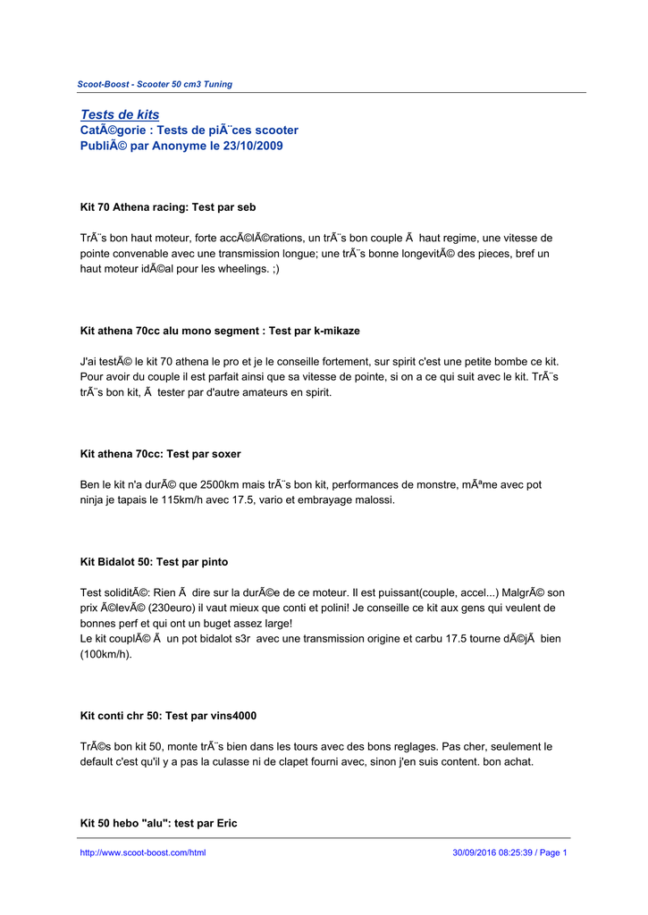 Scoot-Boost - Scooter 50 cm3 Tuning Tests de kits Catégorie : Tests de pièces scooter Publié par Anonyme le 23/10/2009 Kit 70 Athena racing: Test par seb Très bon haut moteur, forte accélérations, un très bon couple à haut regime, une vitesse de pointe convenable avec une transmission longue; une très bonne longevité des pieces, bref un haut moteur idéal pour les wheelings. ;) Kit athena 70cc alu mono segment : Test par k-mikaze J'ai testé le kit 70 athena le pro et je le conseille fortement, sur spirit c'est une petite bombe ce kit. Pour avoir du couple il est parfait ainsi que sa vitesse de pointe, si on a ce qui suit avec le kit. Très très bon kit, à tester par d'autre amateurs en spirit. Kit athena 70cc: Test par soxer Ben le kit n'a duré que 2500km mais très bon kit, performances de monstre, même avec pot ninja je tapais le 115km/h avec 17.5, vario et embrayage malossi. Kit Bidalot 50: Test par pinto Test solidité: Rien à dire sur la durée de ce moteur. Il est puissant(couple, accel...) Malgré son prix élevé (230euro) il vaut mieux que conti et polini! Je conseille ce kit aux gens qui veulent de bonnes perf et qui ont un buget assez large! Le kit couplé à un pot bidalot s3r avec une transmission origine et carbu 17.5 tourne déjà bien (100km/h). Kit conti chr 50: Test par vins4000 Trés bon kit 50, monte très bien dans les tours avec des bons reglages. Pas cher, seulement le default c'est qu'il y a pas la culasse ni de clapet fourni avec, sinon j'en suis content. bon achat. Kit 50 hebo "alu": test par Eric http://www.scoot-boost.com/html 30/09/2016 08:25:39 / Page 1 Après un bon rodage c'est un très bon kit pour tout les jour. Bien règlé on obtient une très bonne patate et une bonne pointe. Même avec un cornet ce kit ne fait pas trop de bruit et en combinaison avec un S2 ou un for race on peut obtenir une pointe très satisfaisante. Kit 70 hebo "alu" : Test par Eric Excellent kit pour la recherche de patate et de pointe. Même en combinaison avec un pot S2, carbu 19, vario multivar on atteint la vitesse de 110km/h très facilement. Il faut par contre monter un vilbrequin reforcé car celui d'origine lachera très vite et riskerait de vous faire serrer. Kit 80 Hebo Manston: Test par Srman54 Très bon kit, je le trouve plus résistant que le polini évolution. Bonne vitesse de pointe, et une superbe accélération. Rien à dire de plus, sinon que chez hebo ils font de très bons kits. Kit 50 malossi fonte : Test par Boudou Ce qui est relativement performant pour le prix (environs 100€), gain de 5-10 km/h par rapport au moteur d’origine et beaucoup de patate. Un bon rapport prix/performance. Certainement moins performant qu’un kit 50 alu mais plus résistant. Le gain de performance est surtout due à ses 6 transfers et a la sortie vers l’échappement qui à été retravaillée. Kit 50 malossi fonte : Test par LoikBoost J'ai monté un kit 50cm3 malossi fonte et jen sui très content niveau qualité prix ca gère. Avant j'avais qu'un pot, ca allait super bien, aucun souci avec. Pour le montage pareil parfait,c'est un kit qui a du mal à sérrer vu qu'il est en fonte comparé à l'aluminium. Je le conseil vivement pour ceux qui hésite. Kit 50 MHR : Test par Rammstein Ce kit 50cc MHR team est tout simplement formidable. J'ai gagné 15 km/h (avec toutes les pièces qui suivent quand même). Le scoot fait un bruit allucinant et l'accélération est plus que allucinante. Kit 50 MHR replica alu : Test par m6skdry Super kit une très très bonne reprise, beau bruit beaucoup d"accélération, je le conseille fortement. C'est vraiment un très bon kit qui peut être utiliser tous les jours, mais surtout bien faire http://www.scoot-boost.com/html 30/09/2016 08:25:39 / Page 2 chauffer. Kit 70 MHR street racer : Test par MHR70 Ce kit est vraiment une merveille. Il développe une très grande puissance avec une très grosse configue (sur bm nitro) un des plus puissant avec le team et le reste chez malossi. Kit 70 MHR big bore : Test par trk6688 Personnellement, je trouve que c'est un très bon kit, mais son prix est vachement élevé, vu ses performances ! (dans les 350-400E) pour le 77 et pour le 87 encore plus... Performances élevées, utilisez le sur route ouvert à vos risques et périls. Kit mhr réplica 70 : Test par Chouchou87 Très bon kit, bonne patate, ca lève tout seule et aussi une bonne pointe (105-110 sur du plat). Par contre il faut les bons réglages et un carbu de 19 au minimum, ainsi qu'un vilo renforcé. Sinon il peut être utilisé tous les jours. Kit 70 polini sport fonte : Test par benoit C'est un kit de bonne qualité , très très bonne résistence ( je l'ai testé sans le faire expres ); bonne acceleration, très coupleux et bonne vitesse de pointe. Je l'ai testé sur mon trekker , j'avais un carbu 17.5 phva, kit admission stage 6, vario doppler s2br et embrayage de même marque. Et il tient sur vilo origine mais j ai changé les roulements + cage à aiguille. Je le conseille vivement sur peugeot et surtout pour les debutants , très bien pour s'initier au montage de pieces sport sur son scoot. Kit 50 fonte TopPerf: Test par Christophe Très bon kit pour tout les jours. Marche très fort à froid. C'est un kit qui est très complet, car il a une super patate et question reprises c'est du tonere (une foi bien réglé). En pointe j'ai gagné presque 10 km/h donc que c'est un très bon kit. Je prend 90 km/h réel sur plat, mais au cul d'une voiture qui vous cache du vent il a pas de mal à prendre 100 km/h. http://www.scoot-boost.com/html 30/09/2016 08:25:39 / Page 3