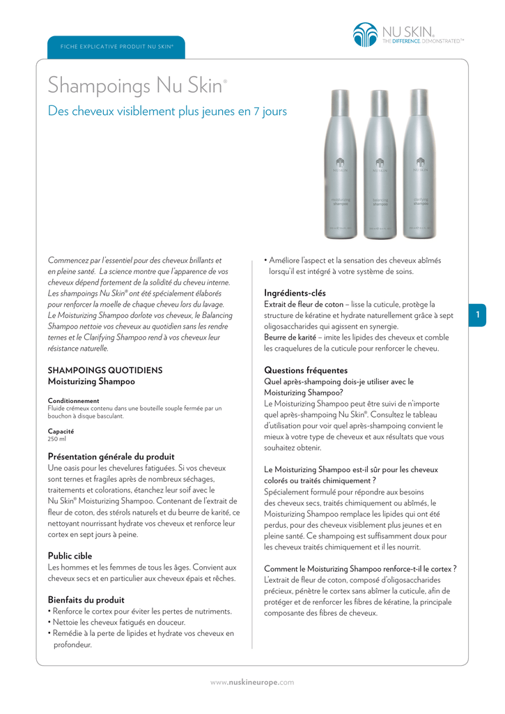 Fiche explicative produit Nu Skin® Shampoings Nu Skin® Des cheveux visiblement plus jeunes en 7 jours Commencez par l’essentiel pour des cheveux brillants et en pleine santé. La science montre que l’apparence de vos cheveux dépend fortement de la solidité du cheveu interne. Les shampoings Nu Skin® ont été spécialement élaborés pour renforcer la moelle de chaque cheveu lors du lavage. Le Moisturizing Shampoo dorlote vos cheveux, le Balancing Shampoo nettoie vos cheveux au quotidien sans les rendre ternes et le Clarifying Shampoo rend à vos cheveux leur résistance naturelle. • Améliore l’aspect et la sensation des cheveux abîmés lorsqu’il est intégré à votre système de soins. SHAMPOINGS QUOTIDIENS Questions fréquentes Moisturizing Shampoo Conditionnement Fluide crémeux contenu dans une bouteille souple fermée par un bouchon à disque basculant. Capacité 250 ml Présentation générale du produit Une oasis pour les chevelures fatiguées. Si vos cheveux sont ternes et fragiles après de nombreux séchages, traitements et colorations, étanchez leur soif avec le Nu Skin® Moisturizing Shampoo. Contenant de l’extrait de fleur de coton, des stérols naturels et du beurre de karité, ce nettoyant nourrissant hydrate vos cheveux et renforce leur cortex en sept jours à peine. Public cible Les hommes et les femmes de tous les âges. Convient aux cheveux secs et en particulier aux cheveux épais et rêches. Bienfaits du produit • Renforce le cortex pour éviter les pertes de nutriments. • Nettoie les cheveux fatigués en douceur. • Remédie à la perte de lipides et hydrate vos cheveux en profondeur. Ingrédients-clés Extrait de fleur de coton – lisse la cuticule, protège la structure de kératine et hydrate naturellement grâce à sept oligosaccharides qui agissent en synergie. Beurre de karité – imite les lipides des cheveux et comble les craquelures de la cuticule pour renforcer le cheveu. Quel après-shampoing dois-je utiliser avec le Moisturizing Shampoo? Le Moisturizing Shampoo peut être suivi de n’importe quel après-shampoing Nu Skin®. Consultez le tableau d’utilisation pour voir quel après-shampoing convient le mieux à votre type de cheveux et aux résultats que vous souhaitez obtenir. Le Moisturizing Shampoo est-il sûr pour les cheveux colorés ou traités chimiquement ? Spécialement formulé pour répondre aux besoins des cheveux secs, traités chimiquement ou abîmés, le Moisturizing Shampoo remplace les lipides qui ont été perdus, pour des cheveux visiblement plus jeunes et en pleine santé. Ce shampoing est suffisamment doux pour les cheveux traités chimiquement et il les nourrit. Comment le Moisturizing Shampoo renforce-t-il le cortex ? L’extrait de fleur de coton, composé d’oligosaccharides précieux, pénètre le cortex sans abîmer la cuticule, afin de protéger et de renforcer les fibres de kératine, la principale composante des fibres de cheveux. www.nuskineurope.com 1 Shampoings Nu Skin® Qu’est-ce qui rend le Moisturizing Shampoo plus hydratant que les autres shampoings Nu Skin® ? Tous les shampoings Nu Skin® contiennent de l’extrait de fleur de coton avec ses oligosaccharides hydratants, mais le Moisturizing Shampoo renferme également du beurre de karité. Le beurre de karité comble les craquelures qui apparaissent sur les cuticules desséchées et imite les lipides naturels des cheveux. Quels shampoing et après-shampoing dois-je utiliser si j’ai des problèmes de pellicules ? Les shampoings et les après-shampoings de la gamme de soins capillaires Nu Skin® ne contiennent pas d’ingrédient pour les problèmes de pellicules. Pour un shampoing antipelliculaire, utilisez l’Epoch® Ava puhi moni Anti-Dandruff Shampoo. Ingrédients 2 Water (Aqua), Ammonium Lauryl Sulfate, Ammonium Laureth Sulfate, Cocamidopropyl Betaine, Gossypium Herbaceum (Cotton) Extract, Butyrospermum Parkii (Shea Butter), Bis-Behenyl/Isostearyl/Phytosteryl Dimer Dilinoleyl Dimer Dilinoleate, Cocodimonium Hydroxypropyl Hydrolysed Wheat Protein, Panthenol, Sodium PCA, Guar Hydroxypropyltrimonium Chloride, PEG/PPG-18/18 Dimethicone, Butylene Glycol, Acrylates Copolymer, Glycol Distearate, Steareth-4, Ammonium Chloride, Citric Acid, Aminomethyl Propanol, Tetrasodium EDTA, Fragrance (Parfum), Methylchloroisothiazolinone, Methylisothiazolinone. Balancing Shampoo Conditionnement Fluide crémeux contenu dans une bouteille souple fermée par un bouchon à disque basculant. Capacité 250 ml Présentation générale du produit Ne privez pas vos cheveux de ce qu’ils méritent. Certains shampoings privent les cheveux de leur hydratation naturelle et les rendent secs, fragiles et ternes. Le Nu Skin® Balancing Shampoo nettoie et hydrate comme il faut tandis que des nutriments-clés, provenant de la fleur de coton, renforcent le cortex. A présent, vous pouvez éliminer les impuretés en douceur, hydrater comme il faut et rendre à vos cheveux la santé de leurs jeunes années en sept jours à peine. Public cible Les hommes et les femmes de tous les âges. Convient aux cheveux normaux à gras ainsi que pour un usage quotidien. Bienfaits du produit • Renforce le cortex pour réduire les pertes de nutriments. • Nettoie les cheveux au quotidien sans les rendre ternes et sans les priver de leur hydratation naturelle. • Convient pour un usage quotidien. • Améliore l’aspect et la sensation des cheveux abîmés lorsqu’il est intégré à votre système de soins. Ingrédients-clés Extrait de fleur de coton – lisse la cuticule, protège la structure de kératine et hydrate naturellement grâce à sept oligosaccharides qui agissent en synergie. Protéine de blé – riche en cystéine (un acide aminé essentiel), contribue à réparer les cheveux abîmés par des traitements chimiques ou par le stress mécanique. Questions fréquentes Quel après-shampoing dois-je utiliser avec le Balancing Shampoo? Le Balancing Shampoo peut être s
