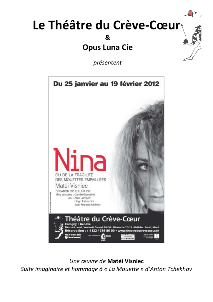 Le Théâtre du Crève-Cœur & Opus Luna Cie présentent Une œuvre de Matéi Visniec Suite imaginaire et hommage à « La Mouette » d’Anton Tchekhov Présentation Texte : Matéi Visniec Mise en scène: Jeu: Nina Treplev Trigorine Camille Giacobino Vidéo: Lumière: Régie générale : Radu Zero Jean-Michel Carrat Eric Faugeron Lieu: Théâtre du Crève-Cœur 16, chemin de Ruth 1223 Cologny / Genève Dates : Du 25 janvier au 19 février 2012 Mercredi au samedi à 20h30, dimanche à 17h15 Relâche : lundi et mardi Aline Gampert Jean-François Michelet Diego Todeschini CONTACTS: Théâtre du Crève-Cœur : Secrétariat : 022. 550.18.45 ou 022.786.93.60 Réservations spectacles : 022.786.86.00 [email protected] www.theatreducrevecoeur.ch Opus Luna Cie : C/O Camille Giacobino 83 rue de Lausanne, 1202 Genève. [email protected] 2 Synopsis « Nina ou de la fragilité des mouettes empaillées » Tchekhov est mort en 1904, pourtant… dans le musée du monde que Matéi Visniec nous propose de visiter, La Mouette de Tchekhov se prolonge. Nous sommes en février 1917. Quinze ans ont passé, dans une maison isolée par la neige, au fin fond de la steppe. Inutile de fermer les portes, il n'y a pas de voisins. Une femme qui connaît les lieux entre: c’est Nina qui revient chez Treplev, un matin à l’aube. Le vent souffle sur cette demeure fantomatique, la table n’a pas bougé, ni la terrible horloge qui marque le temps. Treplev est allé chercher du bois afin de chauffer cette maison vide dans laquelle il passe son temps à écrire. Treplev coupe le bois tout seul, il écrit tout seul, dit-elle. C'est une Nina avec quinze ans de plus qui refait son apparition dans la vie de Treplev, mais quinze années de fragilité et de grâce conservée. Elle a marché longtemps pour revenir. Elle est frigorifiée, un peu déséquilibrée. Curieusement, l'hôte semble à peine surpris… Il l'attendait sans trop y croire, pourtant elle est là ; et voici que ce rescapé de deux tentatives de suicide redevient instantanément le captif de cette femme tyrannique. La mouette empaillée se réanime et la pendule s'arrête. Visniec nous transporte dans l’ancienne demeure d'Arkadina puis dans le parc pour revisiter "le plus beau théâtre du monde ", celui à côté du lac, où Nina a joué jadis la pièce de Treplev. Puis Trigorine, l’homme pour lequel quinze ans plus tôt Nina a quitté Treplev, arrive d'une Moscou en pleine Révolution d'Octobre et les plonge tous trois dans l'angoisse et l'excitation d'un nouveau monde en éruption. En russe, le mot "tchaïka" (la mouette) contient le verbe "tchaïat’": espérer. La mouette morte, présente dans les deux pièces de Tchekhov et de Visniec, qui trône toujours, empaillée, dans la maison d'Arkadina est donc le symbole d’une vie détruite et de la beauté fauchée. La Mouette de Tchekhov, c’est l’illusion en permanent tiraillement avec le désenchantement, l’essor puis la déception. Les personnages sont tournés vers le futur et attendent l'utopique. Nina est une sorte de variation de La Mouette une rêverie et un hommage. Ce que Visniec ose, c'est placer les trois personnages principaux dans un contexte politique explosif et de les laisser se débrouiller avec leur ignorance d'un monde en violente mutation. Désir de meurtre, rivalités, passions éteintes, vies faites d'échecs, illusions brisées, l'auteur libère les trois personnages dans un règlement de compte ravageur, jusqu'à l'épuisement, jusqu'à l'immobilité complète: statues de cire et de glace. C’est un peu Tchekhov. C’est aussi l’histoire d’une révolution jamais terminée. C’est un peu notre monde d'aujourd’hui à l’affût de changement et d’évasion. Mais surtout, surtout, tout cela est une comédie … 3 Auteur Matéi Visniec est né au nord de la Roumanie, le 29 janvier 1956. Dans la Roumanie communiste de Ceausescu, il découvre très vite dans la littérature un espace de liberté. Il se nourrit de Kafka, Dostoïevski, Camus, Beckett, Ionesco, Lautréamont… Il aime les surréalistes, les dadaïstes, les récits fantastiques, le théâtre de l'absurde et du grotesque, la poésie onirique, bref, tout sauf le réalisme socialiste. Il publie ses œuvres théâtrales à partir de 1977, mais elles sont interdites de création par les autorités communistes. La répression est d’ailleurs l’un des moteurs de l’écriture de Matéi Visniec, qui, à l’instar de Brecht, considère le théâtre comme un espace pour agir. À Bucarest, où il étudie l’histoire et la philosophie, il devient un membre très actif de cette génération des années 1980 qui a bouleversé le paysage poétique et littéraire roumain. Il croit en la résistance culturelle et en la capacité de la littérature à démolir le totalitarisme. Avant 1987 il s'affirme en Roumanie avec sa poésie épurée, lucide, caustique. Dès septembre 1987, devenu auteur interdit, il quitte la Roumanie, arrive en France et demande l'asile politique. Il commence alors à écrire des pièces de théâtre en français. Après la chute du régime totalitaire en Roumanie, en décembre 1989, Matéi Visniec devient l'auteur le plus joué du pays avec une trentaine de créations à Bucarest et en province, tant à la radio et à la télévision qu’au théâtre. Le Théâtre National de Bucarest crée "La Machine Tchekhov" et "L'histoire du communisme racontée aux malades mentaux". A ce jour, Matéi Visniec compte de nombreuses créations en France. Il est devenu, depuis 1992, l'un des auteurs les plus joués au Festival d'Avignon off avec une quarantaine de créations. A Paris ses pièces sont jouées au Théâtre du Rond Point, au Studio des Champs Elysées, au Théâtre de l'Est Parisien, au Ciné13 Théâtre, au Théâtre International de Langue Française, au Théâtre du Guichet Montparnasse, au Théâtre de l'Opprimé… Il a été à l'affiche dans une trentaine de pays dont l’Italie (Théâtre 