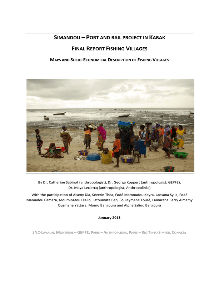 SIMANDOU – PORT AND RAIL PROJECT IN KABAK FINAL REPORT FISHING VILLAGES MAPS AND SOCIO‐ECONOMICAL DESCRIPTION OF FISHING VILLAGES By Dr. Catherine Sabinot (anthropologist), Dr. George Koppert (anthropologist, GEPFE), Dr. Maya Leclercq (anthropologist, Anthropolinks). With the participation of Alseny Dia, Séverin Thea, Fodé Mamoudou Keyra, Lansana Sylla, Fodé Mamadou Camara, Mouminatou Diallo, Fatoumata Bah, Souleymane Touré, Lamarana Barry Almamy Ousmane Yattara, Momo Bangoura and Alpha Saliou Bangoura January 2013 SNC‐LAVALIN, MONTREAL – GEPFE, PARIS – ANTHROPLINKS, PARIS – RIO TINTO SIMFER, CONAKRY