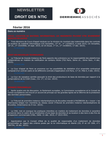 Février 2016 Dans ce numéro FOCUS : LOCATION DE MATERIEL INFORMATIQUE, LES INDEMNITES PEUVENT ETRE SEVEREMENT REDUITES EN JUSTICE • Trois décisions de Cours d’appel rendues sur la révision du montant des indemnités dans les contrats de location de matériel informatique (CA Versailles, 13e ch., n° 13/05623, 6 août 2015, CA Versailles, 16e ch., n° 14/03950, 24 sept. 2015, et CA Douai, 1re ch., n° 14/06933, 17 déc. 2015). En savoir plus DROIT DES NOUVELLES TECHNOLOGIES • Le Tribunal de Grande Instance de Paris apporte des précisions sur la responsabilité des plateformes collaboratives en matière de notification de contenu illicite (TGI Paris, 3ème ch., 2ème Sect., 4 déc. 2015). En savoir plus • La Cour d’appel de Paris se prononce sur les possibilités de résiliation d’un ensemble contractuel composé d’un contrat cadre et de différents contrats d’application (CA Paris, 11e ch. Pôle 5, 4 déc. 2015). En savoir plus • La Cour de cassation semble assouplir le droit des producteurs de base de données par rapport à la jurisprudence de la CJUE (Cass., Civ. 1re, 12 nov. 2015). En savoir plus DONNEES PERSONNELLES • Après quatre ans de discussion, le Parlement européen, la Commission européenne et le Conseil de l’Union européenne ont trouvé un accord de principe sur les grandes lignes de la réforme de la protection des données personnelles. En savoir plus • Le Tribunal de première instance néerlandophone de Bruxelles interdit à FACEBOOK de « tracer » les internautes belges non membres du réseau social (Tribunal de première instance néerlandophone de Bruxelles, Ordonnance du 9 nov. 2015). En savoir plus • La CNIL met en exergue les pratiques interdites en matière de traitement de données à caractère personnel dans le cadre de la constitution d’une base de données et sa location à des tiers à des fins de prospection commerciale (CNIL, Délib. 21 déc. 2015, n° 2015-454). En savoir plus • Appréciation par le Conseil d’Etat de la qualité de responsable d’un traitement de données personnelles au regard des critères posés par la loi informatique et liberté (CE, 9e et 10e SSR, n°+ 384794, 18 déc. 2015). En savoir plus 1 Février 2016 DROIT D’AUTEUR • Modernisation du droit d’auteur en Europe : la Commission européenne propose ses nouvelles mesures. En savoir plus DROIT DES MARQUES • Le projet de réforme du droit des marques en Europe définitivement adopté en fin d’année 2015. En savoir plus FISCALITE • La CJUE considère que le transfert du savoir-faire permettant l’exploitation d’un site internet dans un Etat membre de l’Union européenne à un taux moins élevé de TVA ne constitue pas à lui seul une pratique abusive (CJUE, aff. C-419/14, 17 déc. 2015). En savoir plus DROIT DE LA PRESSE • Le Tribunal de Grande Instance de Paris précise les conditions que doivent revêtir les actes susceptibles d’interrompre la prescription en matière d’infraction de presse (TGI Paris, 17e ch., 16 déc. 2015). En savoir plus 2 FOCUS : LOCATION DE MATERIEL INFORMATIQUE Depuis quelques années déjà, les modalités financières des contrats de location de matériel informatique sont la cible de nombreuses critiques. Notamment ces critiques concernent deux cas de figure fréquemment rencontrés, à savoir : - Lorsque le locataire conserve les matériels au-delà du terme prévu au contrat, une clause prévoit systématiquement l'obligation pour le locataire de payer des indemnités de jouissance d’un montant équivalent aux loyers antérieurement payés (Cas de figure n°1), ou - Lorsque le locataire met un terme anticipé à la location, une clause prévoit systématiquement l'obligation pour le locataire de payer des indemnités de résiliation équivalentes au montant des loyers qui auraient été dus jusqu’au terme du contrat si celui-ci n'avait pas été résilié (cas de figure n°2) Jusqu'à présent, les tribunaux remettaient rarement en cause le montant des indemnités et s'appuyaient sur la force obligatoire de telles clauses dès lors que le locataire y avait valablement consenti. Or récemment, trois décisions rendues par les Cours d'appel de Versailles et Douai ont donné l'occasion aux juges de réviser le montant des indemnités dans les deux cas de figure évoqués après avoir qualifiées les clauses litigieuses de clause pénales. Cas de figure n°1 – Indemnité de jouissance : - Arrêt n°1, CA Versailles, 13ème Ch., 6 août 2015, 13/05623 Dans le premier arrêt, la Cour a considéré que la clause prévoyant une indemnité de jouissance exigible par le loueur lorsqu'un locataire conserve des matériels après le terme de la location est une clause pénale. Ainsi, la cour justifie son raisonnement de la manière suivante : « (l'indemnité en question) représente pour le bailleur une contrepartie du service dont le locataire continue de bénéficier après le terme de la location en conservant les matériels loués » mais qu’elle « vise également à contraindre le locataire à restituer le matériel loué et constitue une évaluation forfaitaire et anticipée du préjudice résultant par le bailleur de l’inexécution de l’obligation de restitution et qu’elle s’applique du seul fait de cette inexécution ; qu’elle remplit donc une fonction tant comminatoire que réparatrice et doit dès lors être qualifiée de clause pénale ». Cas de figure n°2 – Indemnité de résiliation anticipée : - Arrêt n°2, CA Douai, 1ère Chambre Section 1, 17 décembre 2015 - 14/06933 Dans le second arrêt, on retiendra que la Cour a procédé à une analyse de la clause litigieuse en la qualifiant de clause pénale puis en a tiré les conséquences en jugeant que le montant prévu était manifestement excessif au regard du préjudice subi par le loueur. Ainsi, elle indique de manière claire que "la résiliation du contrat met fin à l'obligation de paiement des loyers, qui n'a 