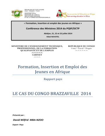 REPUBLIQUE DE COTE D’IVOIRE Union – Discipline – Travail -----------------------MINISTERE D’ETAT MINISTERE DE L’EMPLOI, DES AFFAIRES SOCIALES ET DE LA FORMATION PROFESSIONNELLE « Formation, insertion et emploi des jeunes en Afrique » Conférence des Ministres 2014 du PQIP/DCTP Abidjan, 21, 22 et 23 juillet 2014 Hôtel NOVOTEL MINISTERE DE L’ENSEIGNEMENT TECHNIQUE, PROFESSIONNEL, DE LA FORMATION QUALIFIANTE ET DE L’EMPLOI -=-=-=-=-=CABINET -=-=-=- REPUBLIQUE DU CONGO Unité * Travail * Progrès -=-=-=-=-=-=- Formation, Insertion et Emploi des Jeunes en Afrique Rapport pays LE CAS DU CONGO BRAZZAVILLE 2014 Présenté par : David Wilfrid MBA-NZOO Expert- Pays Sommaire RESUME EXECUTIF 6 INTRODUCTION 8 I. BREF APERCU DU CONTEXTE SOCIO-ECONOMIQUE DU CONGO. II. SYNTHESE DU DIAGNOSTIC DE L’EMPLOI AU CONGO : 2.1. 9 13 Données de base concernant la situation des jeunes vis à vis de l’emploi. 13 2.1.1. Taux des jeunes au Chômage : 13 2.1.2. Taux des jeunes étant ni en éducation, ni en formation, ni en emploi (catégorie des NEET) 13 2.1.3. Taux des jeunes ayant un diplôme de l’enseignement technique : 14 2.1.4. Taux d’insertion des jeunes dans l’économie formelle : 14 2.1.5. Taux d’insertion des jeunes dans l’économie informelle 14 2.1.6. Taux et nombre des jeunes en apprentissage traditionnel ou rénové : 15 2.2. Les données de base concernant le monde du travail Erreur ! Signet non défini. 2.2.1. Répartition des emplois par secteur d’activité Erreur ! Signet non défini. 2.2.2. Secteur primaire : Agriculture, Elevage et Pêche. Erreur ! Signet non défini. 2.2.3. Secteur secondaire : Industrie. Erreur ! Signet non défini. 2.2.4. Secteur tertiaire : Commerce, Tourisme, Transport et Télécommunications Signet non défini. 2.2.5. Erreur ! Répartition par secteur formel et informel (urbain et rural) : Erreur ! Signet non défini. 2.2.6. Répartition des emplois par catégorie (emplois salariés, indépendants, auto- emploi, travailleurs domestiques….).cf pge 85 Enq. 1, 2,3 Tabl. An.4 17 III. LES DIFFICULTES D’ACCES DES JEUNES AU MONDE DU TRAVAIL : 17 3.1. Quels sont les diagnostics portés par votre pays sur la situation de l’emploi des jeunes notamment sur les difficultés qu’ils rencontrent pour accéder à l’emploi ? 18 3.1.1. Quelle est la part des employeurs dans ces difficultés qu’ils rencontrent pour accéder à l’emploi ? 19 3.1.2. L'inadaptation des compétences des jeunes au monde du travail 20 3.1.3. La méconnaissance du marché du travail. 20 3.1.4. La faible qualification des formés 21 3.1.5. Le manque d’investissement dans les secteurs porteurs d’emplois 21 3.1.6. Le manque de dispositifs de suivi et d'insertion des jeunes en recherche d'emploi 21 3.1.7. La faible acquisition des compétences entrepreneuriales par les jeunes 22 3.1.8. Peu de structures d’accompagnement des jeunes 22 3.2. Quels sont les dispositifs en projets ou en cours de réalisation pour améliorer les processus d’accès des jeunes au monde du travail ? 23 IV. LES MESURES EN PROJETS OU EN COURS DANS LE DOMAINE DU DCTP. Erreur ! Signet non défini. 4.1. Quelles sont les reformes en projet ou en cours de réalisation pour actualiser les dispositifs et parcours de formation existants en fonction des compétences requises par le monde économique et professionnel ? Erreur ! Signet non défini. 4.1.2. Quels sont les dispositifs de formation en projet ou en cours de réalisation pour former les jeunes aux métiers et emplois requis par les secteurs stratégiques ou porteurs d’emploi ? 26 4.1.3. Quelles sont les mesures prises pour renforcer les compétences des entrepreneurs et maîtres d’apprentissage du secteur informel afin de les aider à mieux former les jeunes dont ils ont la charge ? 26 4.1.4. Quels sont les partenaires existants ou projetés permettant de mieux associer les acteurs économiques et professionnels à la conception, mise en œuvre et réalisation de parcours de formation ciblés sur les compétences requises par le monde du travail ? 26 4.1.5. Comment définiriez –vous le changement de paradigme à effectuer dans votre pays pour mettre l’accès à l’emploi au cœur des priorités des systèmes d’éducation et de formation ? 27 4.1.6. Quelles autres mesures développez-vous ? 28 V. LES MESURES EN PROJET OU EN COURS POUR FAVORISER LA CREATION D’EMPLOIS : 28 5.1. Les mesures prises pour renforcer les compétences professionnelles des acteurs économiques afin de les aider à développer leurs activités et ainsi à créer davantage d’emplois 28 5.1.1. Les moyens incitatifs existants ou en projet pour encourager les entreprises à embaucher des jeunes et, si nécessaire, à les former. 28 Réponse 5.1- & b5.1.2. : 28 5.1.2. Existe-t-il des investissements ciblés sur le développement des métiers et d’emplois dans les secteurs considérés comme stratégiques et, si oui, quels sont les moyens pour former les jeunes à ces métiers ? 29 5.1.3. Existe-t-il des appuis financiers ou humains afin d’aider les jeunes à créer leurs activités ou à renforcer celles qu’ils ont crées et, si oui, quelle est la nature de ces appuis ? 29 51.4. Existe-t-il dans votre pays des pôles d’innovation ou d’expertise tels que des incubateurs d’entreprise pour jeunes et/ou des centres de gestion et de coaching à destination des entreprises créées par des jeunes ou employant des jeunes ? 30 5.1.5. Existe –t-il des chantiers à haute intensité de main d’œuvre qui ont prévu ou prévoient des mesures spécifiques d’emplois pour les jeunes et, si oui, quelle en est l’ampleur ? 5.1.6. VI. 6.1. Quelles autres mesures développez-vous ? 30 Erreur ! Signet non défini. UNE EXPERIENCE PARTICULIERE SIGNIFICATIVE D’INSERTION OU D’EMPLOI DES JEUNES. Erreur ! Signet non défini. Objectif 6.2. REULTATS ATTENDUS : Erreur ! Signet non défini. Erreur ! Signet non défini. 6.3. Description du Projet : 31 6.4. La couverture,