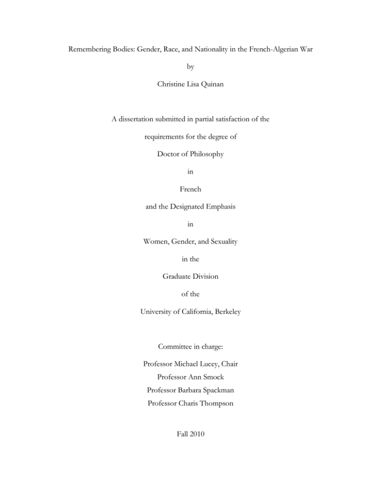Remembering Bodies: Gender, Race, and Nationality in the French-Algerian War by Christine Lisa Quinan A dissertation submitted in partial satisfaction of the requirements for the degree of Doctor of Philosophy in French and the Designated Emphasis in Women, Gender, and Sexuality in the Graduate Division of the University of California, Berkeley Committee in charge: Professor Michael Lucey, Chair Professor Ann Smock Professor Barbara Spackman Professor Charis Thompson Fall 2010 Abstract Remembering Bodies: Gender, Race, and Nationality in the French-Algerian War by Christine Lisa Quinan Doctor of Philosophy in French University of California, Berkeley Professor Michael Lucey, Chair This dissertation interrogates images and narratives of the body during the FrenchAlgerian War, an eight-year conflict that began in 1954 and ended with Algerian independence in 1962. Moving between Algeria and France in my analyses and considering documents from the period in question and from later years that reflect back on it, I analyze literary works, films, memoirs, and a legal case in order to consider how physical violence and trauma produce a variety of forms of psychological and corporeal dissonance and how the repression of personal and collective memories can impact bodies and minds both destructively and productively. An investigation of the workings of the social constructs of gender and sexuality is at the center of this project, and I consistently take an approach that actively engages feminist theoretical perspectives, while also taking into account how other categories like race, class, ethnicity, nationality, and citizenship intersect with gender and sexuality to structure our understanding of embodiment and memory during the French-Algerian War. Given the unique and gendered ways in which bodies respond to violence and consequently hold memories, the French-Algerian War proves to be a compelling case study regarding the transformative and agential power of bodies during periods of resistance. Drawing on disciplines such as cultural studies, feminist sociology, postcolonial studies, social movement theory, and human rights studies, I situate my dissertation at the intersection of theories of embodiment and of memory to investigate the myriad ways in which this war of decolonization was literally and figuratively fought on the bodies of Algerian women. Conversely, through the attention it caused to be paid to the Muslim female body, the war placed the seemingly “neutral” and “unmarked” body of the French, heterosexual, Christian, white, male body in question. In analyses of my primary archive, I also uncover how the process of decolonization sparked a crisis in national identity, as “Frenchness” (what it meant to be French) was constructed, deconstructed, and reconstructed with every turn of the war, particularly as revelations of torture and brutality emerged. Additionally, I propose that this moment posed a crisis in gender and sexuality, as it became a period of reification of certain forms of masculinity and femininity and a contestation and production of others. Finally, I turn to recent works and current events 1 in order to uncover some of the ways in which the French-Algerian War goes on having an impact today. 2 TABLE OF CONTENTS Page ACKNOWLEDGEMENTS ii INTRODUCTION iv CHAPTER 1: Veiling Unveiled: Embodiment and Action in Assia Djebar’s Les enfants du nouveau monde and Les alouettes naïves 1 CHAPTER 2: Torture, Memory, and Film: Alain Resnais’ Absent “Muriel” 41 CHAPTER 3: Technocrats and Tortured Bodies: Simone de Beauvoir and the French-Algerian War 90 CHAPTER 4: Hidden Memories: Retracing October 17, 1961 in Michael Haneke’s Caché and Leïla Sebbar’s La Seine était rouge 137 CONCLUSION 183 BIBLIOGRAPHY 196 i ACKNOWLEDGEMENTS This endeavor dates back many years, even decades, and I don’t know if I will ever be able to name all the countless individuals whose feedback and guidance helped shape this project, nor will I ever be able to name all the friends and family whose love provided me with the support to make it through the arduous, yet always fulfilling, process of completing a doctorate. First and foremost, I would not be here without the support of my family and the encouragement of Prof. Mary Rice-DeFosse, my undergraduate advisor, who first suggested I pursue a Ph.D. I will always strive to be the sort of thoughtful and compassionate mentor she was to me. I will forever be grateful to the Department of French and to the Department of Gender and Women’s Studies for their generous support. My committee has provided me with invaluable guidance that has truly made me a better scholar and teacher. Michael Lucey has always offered me tremendously insightful comments and forced me to push my analysis further. I feel so fortunate to have had such an intellectual role model, and I consistently aspire to be the kind of scholar that Michael is. Ann Smock’s kindness and rigor has been profoundly inspirational, and I will forever appreciate her creative spirit, her modesty, and her generosity. Barbara Spackman’s longtime support and consistent presence has been a comfort to me throughout the ups and downs of graduate school. Charis Thompson’s encouragement, compliments (often undeserved!), and big heart have always kept me going. I could not think of a better group of scholars to work with throughout this project. Additional thanks goes to all professors with whom I have had the fortune of taking classes, including Trinh Minh-ha, Seda Chavdarian, Thomas Kavanagh, Debarati Sanyal, Minoo Moallem, Timothy Hampton, David Hult, Françoise Sorgen-Goldschmidt, Suzanne Guerlac, Susan Maslan, and Karl Britto. Special thanks goes to members of both GWS 220 Seminars I attended, especially Robin Mitchell, Laurel Westbrook, Monica Stufft, and Kelly Rafferty, as well as colleagues from the Dartmouth Institute of French Cultural Studies, particularly Caroline Gates,