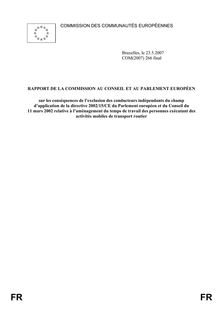 COMMISSION DES COMMUNAUTÉS EUROPÉENNES Bruxelles, le 23.5.2007 COM(2007) 266 final RAPPORT DE LA COMMISSION AU CONSEIL ET AU PARLEMENT EUROPÉEN sur les conséquences de l’exclusion des conducteurs indépendants du champ d’application de la directive 2002/15/CE du Parlement européen et du Conseil du 11 mars 2002 relative à l’aménagement du temps de travail des personnes exécutant des activités mobiles de transport routier FR FR RAPPORT DE LA COMMISSION AU CONSEIL ET AU PARLEMENT EUROPÉEN sur les conséquences de l’exclusion des conducteurs indépendants du champ d’application de la directive 2002/15/CE du Parlement européen et du Conseil du 11 mars 2002 relative à l’aménagement du temps de travail des personnes exécutant des activités mobiles de transport routier 1. INTRODUCTION L’objet de la directive 2002/15/CE1 est de fixer des prescriptions minimales relatives à l’aménagement du temps de travail afin de mieux protéger la sécurité et la santé des personnes qui exécutent des activités mobiles de transport routier ainsi que la sécurité routière, et de rapprocher les conditions de concurrence. La directive est entrée en vigueur le 23 mars 2002 et les États membres disposaient d’un délai de trois ans, prenant fin le 23 mars 2005, pour mettre en œuvre ses dispositions à l’égard des travailleurs mobiles. Conformément à l’article 2, paragraphe 1, de la directive, celle-ci s’applique aux conducteurs indépendants à compter du 23 mars 2009. Entretemps, la Commission devra avoir soumis un rapport au Parlement européen et au Conseil, puis une proposition législative fondée sur ce rapport. Dans le cadre de l’accord de conciliation final conclu entre le Parlement européen et le Conseil sur cette directive, il a été décidé qu’au plus tard deux ans avant cette date, c’est-àdire le 23 mars 2007, la Commission présenterait au Parlement européen et au Conseil un rapport qui analyserait les conséquences de l’exclusion des conducteurs indépendants du champ d’application de la directive, eu égard à la sécurité routière, aux conditions de concurrence, à la structure de la profession ainsi qu’aux aspects sociaux. Le rapport prendrait en compte les conditions prévalant dans chaque État membre en ce qui concerne la structure du secteur des transports et l’environnement de travail de la profession de transporteur routier. Sur la base de ce rapport, la Commission présenterait une proposition ayant pour objectif (a) de fixer les modalités visant à inclure dans le champ d’application de la directive les travailleurs indépendants qui effectuent des activités de transport purement nationales et qui sont soumis à des contraintes spécifiques, ou (b) de ne pas inclure les conducteurs indépendants dans le champ d’application de la directive. L’article 7, paragraphe 2, de la directive prévoit aussi qu’au plus tard le 23 mars 2007 la Commission évalue, dans le cadre du rapport bisannuel qu’elle est tenue de présenter sur la mise en œuvre de la directive, les conséquences des dispositions de la directive concernant le travail de nuit. Le présent rapport remplit donc plusieurs objectifs: il donne un aperçu général de l’état actuel de mise en œuvre de la directive par les États membres; il traite les conséquences possibles de l’exclusion des conducteurs indépendants du champ d’application de la directive; enfin, il évalue les conséquences des dispositions de la directive sur le travail de nuit. La Commission a fait appel à des consultants en décembre 2005 afin d’examiner les trois objectifs précités et, après avoir rédigé des rapports sur chaque État membre, procédé à un 1 FR JO L 80 du 23.3.2002, p. 35. 2 FR examen approfondi des études et données pertinentes, organisé des entretiens avec des représentants des deux parties du secteur, des administrations nationales et des directions générales concernées de la Commission et exploité les réactions obtenues lors de plusieurs réunions avec les représentants du secteur sur les résultats préliminaires obtenus, de présenter leurs conclusions concernant l’exclusion des conducteurs indépendants et les conséquences des dispositions relatives au travail de nuit. Le rapport final est disponible à l’adresse http://ec.europa.eu/transport/road/studies/index_en.htm. 2. MISE EN ŒUVRE DE LA DIRECTIVE PAR LES ÉTATS MEMBRES La majorité des États membres n’ont pas réussi à transposer la directive au cours de la période de transition de trois ans qui était prévue. La Commission a dû ouvrir des procédures d’infraction à l’encontre de onze États membres en mai 2005. Depuis lors, quatre États membres n’ont toujours pas communiqué toutes leurs mesures de transposition. Cela signifie que l’impact de la directive dans certains États membres peut seulement être estimé. La Commission a entamé une correspondance avec les États membres qui lui avaient communiqué leurs mesures de transposition nationales, afin de s’assurer que les définitions et les limites fixées reflètent avec exactitude les dispositions de la directive. Par conséquent, la Commission n’est pas encore en mesure de publier son premier rapport bisannuel, qui aurait dû être présenté en mars 2007. 3. CONSEQUENCES DE L’EXCLUSION DES CONDUCTEURS INDEPENDANTS 3.1. Introduction Le texte définitif de la directive est un compromis délicat qui témoigne du difficile accord de conciliation conclu entre le Parlement européen et le Conseil. L’inclusion des conducteurs indépendants d’ici au 23 mars 2009, une fois remplies les conditions précitées, correspond à un changement d’attitude par rapport à la position commune du Conseil2, dans laquelle était prévue l’exclusion temporaire dans l’attente d’une éventuelle proposition d’inclusion qui aurait été présentée à un stade ultérieur par la Commission. Deux États memb