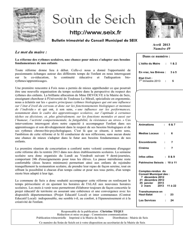 1 0 Soùn de Seich Bulletin trimestriel du Conseil Municipal de SEIX Avril 2013 Numéro 49 Le mot du maire : Dans ce numéro : La réforme des rythmes scolaires, une chance pour mieux s'adapter aux besoins fondamentaux de nos enfants Toute réforme donne lieu à débat. Celle-ci nous a donné l'opportunité de passionnants échanges autour des différents temps de l'enfant en nous interrogeant sur la co-éducation, la continuité éducative et l'adéquation biorythmes/apprentissages. Une première rencontre à Foix nous a permis de mieux appréhender ce que pourrait être une nouvelle organisation du temps scolaire dans la perspective du respect des rythmes des enfants. La brillante allocution de Mme DEVOLVE à la Mairie de Seix, enseignant chercheur à l'Université de Toulouse Le Mirail, spécialisée en ergonomie, nous a éclairés sur les « quatre principaux rythmes biologiques qui ont une influence sur l’état d’éveil du cerveau et donc sur les fonctionnements biologiques et mentaux de l’individu » et qui ont, à son sens, « une influence sur les performances, notamment dans le cadre des apprentissages scolaires, sur l’aptitude à certaines tâches ou décisions, et, plus généralement, sur les fonctions mentales et aussi sur l’humeur, l’activité comportementale, la fatigabilité, la résistance au stress. » Ces interventions interrogent alors notre capacité à accompagner l'enfant dans ses apprentissages et son développement dans le respect de ses besoins biologiques et de ses rythmes chrono-bio-psychologiques. C'est là que se situent, à notre sens, l'ambition de cette réforme et le fil conducteur de nos réflexions, sans aucun doute une chance de mieux s'adapter dans le futur aux besoins fondamentaux de nos enfants. La première réunion de concertation a conforté notre volonté commune d'engager cette réforme dès la rentrée 2013 dans nos deux établissements scolaires. La semaine scolaire sera donc organisée du Lundi au Vendredi suivant 9 demi-journées, comportant 24h d'enseignements pour tous les élèves. La pause méridienne reste confortable (deux heures minimum) permettant ainsi aux enfants de rejoindre tranquillement la restauration scolaire, de prendre leur repas de façon sereine, tout en offrant la possibilité à chacun d'un temps calme et pour nos tous petits, d'un temps sieste bien adapté à leur âge. La commune de Seix a donc souhaité accompagner cette réforme en renforçant le temps périscolaire et en ajustant les horaires de l'ALAE aux nouveaux horaires scolaires. Les mois à venir nous permettront d'élaborer toujours de façon concertée le projet éducatif de territoire en assurant une cohérence et une convergence avec les dispositifs départementaux (Projet Educatif Local) et inter communaux (Contrat Educatif Local) indispensable, me semble t-il, au confort, à l'épanouissement et à la créativité de l'enfant. L’édito du Maire : 1&2 En vrac, les Brèves : 3à5 Etat Civil : er 1 trimestre 2013 : 5 Animations : 6&7 Medias Locaux : 6 Encombrants : 7 Cinéma : 7 Christine TEQUI Infos utiles : 8&9 Patrimoine Seixois : 10 à 11 Comptes-rendus du Conseil Municipal des : 7 décembre 2012 21 décembre 2012 25 janvier 2013 2 mars 2013 11 à 22 Transhumance en Haut-Salat : 23 Les Services 24 Responsable de la publication : Christine TEQUI Rédaction et mise en page : Commission communication Publication trimestrielle Imprimé à la Mairie de Seix Distribution : Mairie de Seix Ce numéro du Soùn de Seich est à votre disposition au secrétariat de la Mairie de Seix : 2 Ainsi je souhaiterais qu'il puisse intégrer des temps d’éveil à l’éducation sportive, culturelle, et artistique mais aussi le « farniente » temps indispensable me semble t-il au confort, à l'épanouissement et à la créativité de l’enfant. Je tiens à remercier tout particulièrement les enseignants, les parents d'élèves, les ATSEM de la Commune, les animateurs périscolaires, l'animateur du local Accueil et les élus pour leur implication et la qualité des débats qui nous ont tous animés, sans jamais perdre l'objet central de notre préoccupation : l'accompagnement de l'enfant dans ses apprentissages. Je suis certaine que nous poursuivrons nos travaux dans cette même perspective et qualité relationnelle, conscients aujourd'hui que 2013 sera une année de transition. Nous devrons l'évaluer et peut être l'adapter si elle ne s'avérait pas complètement satisfaisante. Christine TEQUI A partir de la rentrée scolaire de Septembre 2013, les nouveaux horaires sont donc les suivants : ECOLE MATERNELLE : Le Lundi, Mardi, Jeudi, Vendredi : 8h00 – 9h00 9h00 – 12h00 12h00– 14h00 14h00 – 16h15 16h15 – 18h00 Périscolaire – LEC – Mairie de Seix Temps scolaire – E.N. Périscolaire – LEC – Mairie de Seix Temps scolaire – E.N. Périscolaire – LEC – Mairie de Seix Le Mercredi : 8h00 – 9h00 9h00 – 12h00 12h00 – 12h40 Périscolaire – LEC – Mairie de Seix Temps scolaire – E.N. Périscolaire – LEC – Mairie de Seix ECOLE PRIMAIRE : Le Lundi, Mardi, Jeudi, Vendredi : 8h00 – 9h00 9h00 – 11h45 11h45 – 14h00 14h00 – 16h30 16h30 – 18h00 Périscolaire – LEC – Mairie de Seix Temps scolaire – E.N. Périscolaire – LEC – Mairie de Seix Temps scolaire – E.N. Périscolaire – LEC – Mairie de Seix Le Mercredi : 8h00 – 9h00 9h00 – 12h00 12h00 – 12h40 Périscolaire – LEC – Mairie de Seix Temps scolaire – E.N. Périscolaire – LEC – Mairie de Seix EN VRAC, LES BREVES ... Bienvenue à : 3 Martine et André Milési, nouveaux gérants de CASINO en remplacement de David et Laurence Besombes qui sont partis à Ax-les-Thermes. Ils arrivent de Lamalou-les-bains où ils ont exercé une dizaine d’années. « La Laverie de Patricia » au 4, rue Pujole, laverie tenue par Patricia Ménaspa : - Laverie automatique (libre service) avec des machines de 8 et 18 kg (spéciale grosses pièces) séchoirs – ouvert