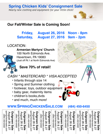 Spring Chicken Kids’ Consignment Sale Nearly new clothing and equipment for your little chick! Our Fall/Winter Sale is Coming Soon! Friday, Saturday, August 26, 2016 Noon - 8pm August 27, 2016 9am - 2pm LOCATION: Armenian Martyrs’ Church 100 North Edmonds Ave. Havertown, PA 19083 (Just off Rt.1 at North Edmonds Ave) Save 70% of retail! CASH * MASTERCARD * VISA ACCEPTED • Infants through size 14 • Spring and Summer clothing • footwear, toys, outdoor equipment • baby gear, maternity items • children’s books,dvds • and much, much more! WWW.SPRINGCHICKENSALE.COM (484) 450-6450 Outgrown Sale August 26 & 27 springchickensale.com (484) 450-6450 Outgrown Sale August 26 & 27 springchickensale.com (484) 450-6450 Outgrown Sale August 26 & 27 springchickensale.com (484) 450-6450 Outgrown Sale August 26 & 27 springchickensale.com (484) 450-6450 Outgrown Sale August 26 & 27 springchickensale.com (484) 450-6450 Outgrown Sale August 26 & 27 springchickensale.com (484) 450-6450 Outgrown Sale August 26 & 27 springchickensale.com (484) 450-6450 Outgrown Sale August 26 & 27 springchickensale.com (484) 450-6450