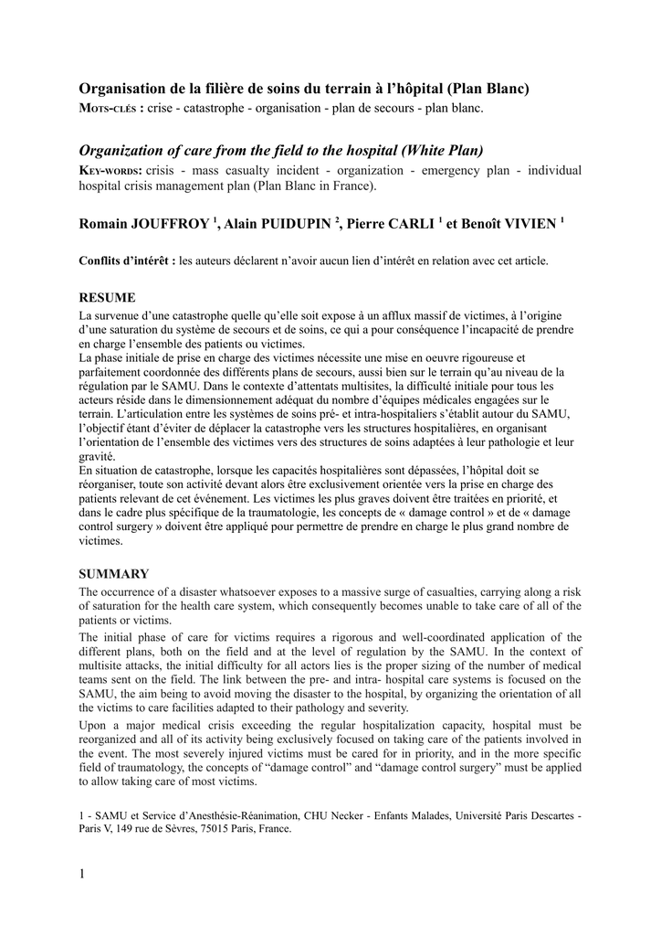 Organisation de la filière de soins du terrain à l’hôpital (Plan Blanc) MOTS-CLÉS : crise - catastrophe - organisation - plan de secours - plan blanc. Organization of care from the field to the hospital (White Plan) KEY-WORDS: crisis - mass casualty incident - organization - emergency plan - individual hospital crisis management plan (Plan Blanc in France). Romain JOUFFROY 1, Alain PUIDUPIN 2, Pierre CARLI 1 et Benoît VIVIEN 1 Conflits d’intérêt : les auteurs déclarent n’avoir aucun lien d’intérêt en relation avec cet article. RESUME La survenue d’une catastrophe quelle qu’elle soit expose à un afflux massif de victimes, à l’origine d’une saturation du système de secours et de soins, ce qui a pour conséquence l’incapacité de prendre en charge l’ensemble des patients ou victimes. La phase initiale de prise en charge des victimes nécessite une mise en oeuvre rigoureuse et parfaitement coordonnée des différents plans de secours, aussi bien sur le terrain qu’au niveau de la régulation par le SAMU. Dans le contexte d’attentats multisites, la difficulté initiale pour tous les acteurs réside dans le dimensionnement adéquat du nombre d’équipes médicales engagées sur le terrain. L’articulation entre les systèmes de soins pré- et intra-hospitaliers s’établit autour du SAMU, l’objectif étant d’éviter de déplacer la catastrophe vers les structures hospitalières, en organisant l’orientation de l’ensemble des victimes vers des structures de soins adaptées à leur pathologie et leur gravité. En situation de catastrophe, lorsque les capacités hospitalières sont dépassées, l’hôpital doit se réorganiser, toute son activité devant alors être exclusivement orientée vers la prise en charge des patients relevant de cet événement. Les victimes les plus graves doivent être traitées en priorité, et dans le cadre plus spécifique de la traumatologie, les concepts de « damage control » et de « damage control surgery » doivent être appliqué pour permettre de prendre en charge le plus grand nombre de victimes. SUMMARY The occurrence of a disaster whatsoever exposes to a massive surge of casualties, carrying along a risk of saturation for the health care system, which consequently becomes unable to take care of all of the patients or victims. The initial phase of care for victims requires a rigorous and well-coordinated application of the different plans, both on the field and at the level of regulation by the SAMU. In the context of multisite attacks, the initial difficulty for all actors lies is the proper sizing of the number of medical teams sent on the field. The link between the pre- and intra- hospital care systems is focused on the SAMU, the aim being to avoid moving the disaster to the hospital, by organizing the orientation of all the victims to care facilities adapted to their pathology and severity. Upon a major medical crisis exceeding the regular hospitalization capacity, hospital must be reorganized and all of its activity being exclusively focused on taking care of the patients involved in the event. The most severely injured victims must be cared for in priority, and in the more specific field of traumatology, the concepts of “damage control” and “damage control surgery” must be applied to allow taking care of most victims. 1 - SAMU et Service d’Anesthésie-Réanimation, CHU Necker - Enfants Malades, Université Paris Descartes Paris V, 149 rue de Sèvres, 75015 Paris, France. 1 2 - Direction Centrale du Service de Santé des Armées, 60 boulevard du Général Marcel Valin, 75509 Paris Cedex 15. Auteur correspondant : Pr. Benoît VIVIEN, SAMU de Paris, Service d’anesthésie-réanimation, 149 rue de Sèvres, 75015 Paris, France. Email : [email protected] INTRODUCTION Les attentats du vendredi 13 novembre 2015 à Paris constituent à la fois l’événement terroriste le plus grave qui se soit produit en France à ce jour, et l’événement le plus complexe que des services d’urgences pré-hospitaliers et intra-hospitaliers aient été amenés à gérer en un laps de temps aussi court. Les attentats de 1995 et 1996 à Paris avaient permis d’appliquer les principes classiques de médecine de catastrophe enseignés depuis plusieurs décennies, avec la mise en œuvre d’une chaine médicale de l’avant, d’un poste médical avancé permettant la catégorisation et les premiers soins aux victimes, et enfin d’une grande noria d’évacuation vers les établissements hospitaliers. Mais lors de chacun de ces attentats, provoqués par des explosifs « artisanaux », le nombre de victimes qui avaient dues être pris en charge simultanément par les équipes de secours et médicales pré-hospitalières, puis dans les hôpitaux, était resté extrêmement limité, de l’ordre de quelques dizaines au maximum. Les attentats terroristes de New York (2001), Madrid (2004), Londres (2005) puis Bombay (2008), ont ouvert la voie de l’hyperterrorisme, caractérisé par un nombre extrêmement élevé de victimes, de l’ordre de plusieurs centaines, et ce simultanément sur plusieurs sites. Si les équipes d’urgences pré-hospitalières et intra-hospitalières s’étaient régulièrement préparées à ce type d’événement lors d’exercices cadres et de mises en situation sur le terrain, les attentats du 13 novembre 2015 à Paris ont représenté la première mise en œuvre réelle des plans de secours qui avaient été élaborés pour faire face à de tels événements. ORGANISATION PRE-HOSPITALIERE Alerte et engagement des premières équipes médicales pré-hospitalières Dès réception de l’alerte initiale par l’un des acteurs de secours (police, pompiers, SAMU), celle-ci doit en premier lieu être confirmée par confrontation des informations entre les différents services. L’objectif est de localiser le plus précisément possible le ou les sites des attentats, afin d’éviter une disp