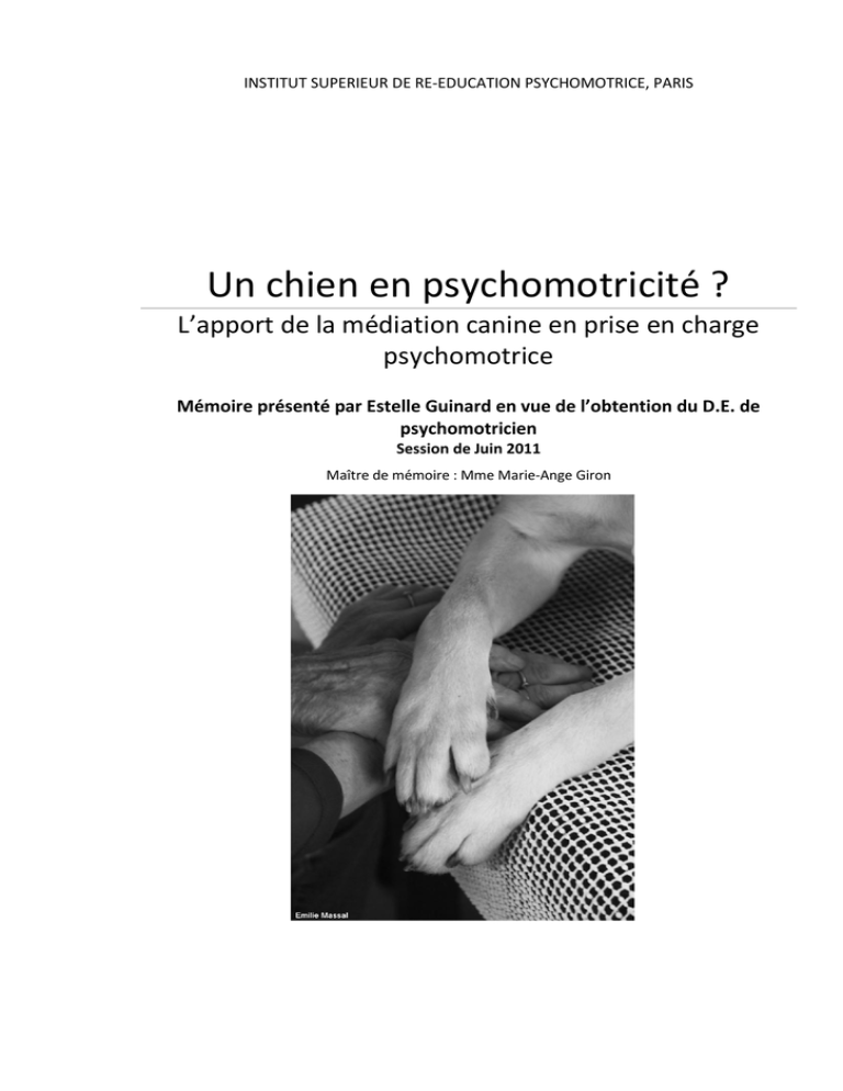 INSTITUT SUPERIEUR DE RE-EDUCATION PSYCHOMOTRICE, PARIS Un chien en psychomotricité ? L’apport de la médiation canine en prise en charge psychomotrice Mémoire présenté par Estelle Guinard en vue de l’obtention du D.E. de psychomotricien Session de Juin 2011 Maître de mémoire : Mme Marie-Ange Giron Un chien en psychomotricité ? L’apport de la médiation canine en prise en charge psychomotrice Remerciements Marie-Ange, maître de stage et de mémoire, pour toutes tes questions qui m'ont fait réfléchir encore plus, toutes nos discussions, pour toutes tes compétences de psychomotricienne. Danièle, pour ton accueil tellement amical, le partage de ta passion, de tes connaissances et de tes compétences. Corine, pour ton dynamisme et le partage de tes connaissances. L'association Parole de chiens et plus particulièrement Isabelle de Tournemire et Catherine Ringuier pour leur aide. L'association Handi’chiens pour son travail et sans qui je n'aurais pas pu concrétiser ce projet. Les enfants de l'I.E.M. et de l'école maternelle et primaire pour leur spontanéité, leur attachement, leur simplicité, pour être des enfants tout simplement. La maison de retraite et l'association Sid’ avenir pour leur ouverture d'esprit. Ma famille qui comprend si bien mes passions et me soutient dans mes projets. Laure, sans qui je n'aurais sûrement pas connu ce métier. Alex, qui m'a fait découvrir la nécessité d'un chien auprès des enfants. Aux coupines pour avoir partagé ces trois années extraordinaires et je suis sûre qu'il y en aura encore beaucoup d'autres. A mes amis, parce que vous êtes précieux. Louis, pour être là malgré la distance. Les « pros » à quatre pattes: Enzo, Polo, Elfe, Tech, Bill, Craquotte et Frosties pour leur travail fait au jour le jour; pour être à la fois chien de famille et chien de travail. Mes chiens, passés et présents, qui ont fait germer tellement de choses. Sommaire I. Introduction……………………………………………………………………………………………………………….p.6 II. Historique des relations hommes-chiens………………………………………………………………….p.8 1. Premières relations hommes-animaux et les débuts de la médiation canine……………..p.8 Les premières traces……………………………………………………………………………………………..…p.8 L’association hommes-chiens…………………………………………………………………………………..p.9 Le chien comme médiateur…………………………………………………………………………………..…p.9 Les premiers travaux concernant la médiation canine……………………………………………p.10 2. Critères de sélection d’un chien médiateur………………………………………………………………p.12 L’élevage…………………………………………………………………………………………………………………p.12 Le caractère du chien……………………………………………………………………………………………..p.13 L’aspect physique du chien…………………………………………………………………………………….p.12 Un bon chien médiateur…………………………………………………………………………………………p.15 III. Médiation canine auprès d’enfants de maternelle....................................................p.16 1. Présentation théorique de la population………………………………………………………………….p.16 Les stades libidinaux de S. Freud…………………………………………………………………………….p.16 Le développement de l’intelligence selon J. Piaget…………………………………………………p.18 Théorie de la maturation……………………………………………………………………………………….p.19 Théorie de l’apprentissage……………………………………………………………………………………..p.20 Théorie de l’attachement……………………………………………………………………………………….p.20 1 2. Approche psychomotrice…………………………………………………………………………………………p.21 La sensorialité………………………………………………………………………………………………………..p.22 La motricité……………………………………………………………………………………………………………p.22 L’espace………………………………………………………………………………………………………………….p.23 Le temps………………………………………………………………………………………………………………..p.24 Le schéma corporel et l’image du corps…………………………………………………………………p.25 Le langage……………………………………………………………………………………………………………..p.26 Le jeu……………………………………………………………………………………………………………………..p.26 3. Illustration clinique…………………………………………………………………………………………………..p.27 Première séance…………………………………………………………………………………………………….p.28 Deuxième séance…………………………………………………………………………………………………..p.28 Troisième séance……………………………………………………………………………………………