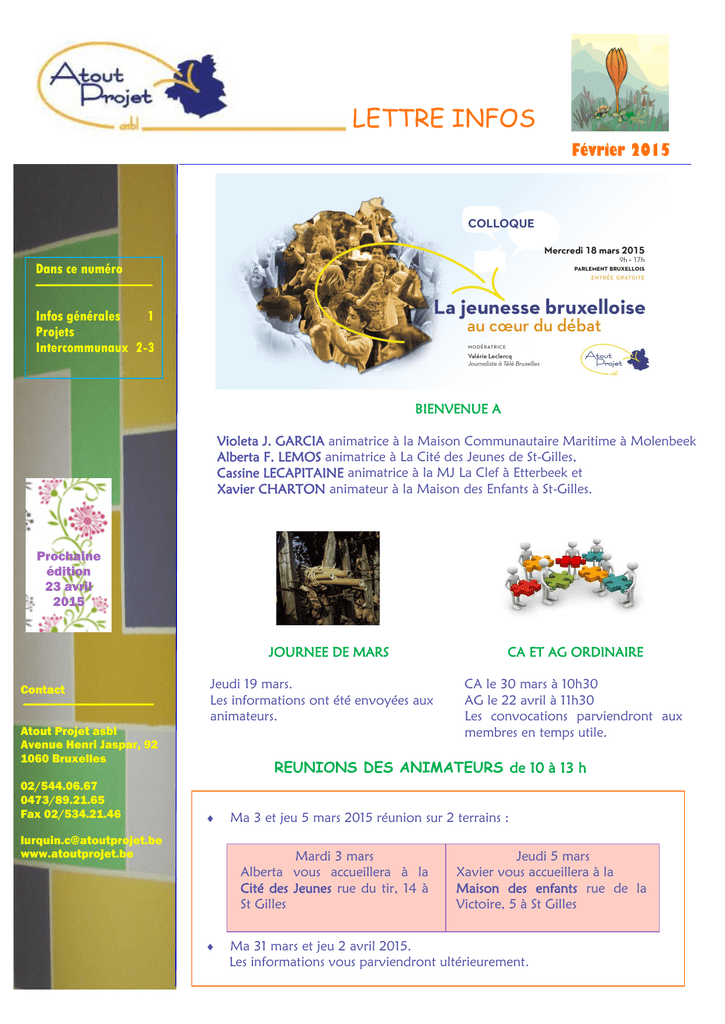 LETTRE INFOS Février 2015 Dans ce numéro ———————— Infos générales 1 Projets Intercommunaux 2-3 BIENVENUE A Violeta J. GARCIA animatrice à la Maison Communautaire Maritime à Molenbeek Alberta F. LEMOS animatrice à La Cité des Jeunes de St-Gilles, Cassine LECAPITAINE animatrice à la MJ La Clef à Etterbeek et Xavier CHARTON animateur à la Maison des Enfants à St-Gilles. Prochaine édition 23 avril 2015 JOURNEE DE MARS Contact ———————————————— Jeudi 19 mars. Les informations ont été envoyées aux animateurs. Atout Projet asbl Avenue Henri Jaspar, 92 1060 Bruxelles 02/544.06.67 0473/89.21.65 Fax 02/534.21.46 CA ET AG ORDINAIRE CA le 30 mars à 10h30 AG le 22 avril à 11h30 Les convocations parviendront aux membres en temps utile. REUNIONS DES ANIMATEURS de 10 à 13 h [email protected] www.atoutprojet.be Ma 3 et jeu 5 mars 2015 réunion sur 2 terrains : Mardi 3 mars Alberta vous accueillera à la Cité des Jeunes rue du tir, 14 à St Gilles Jeudi 5 mars Xavier vous accueillera à la Maison des enfants rue de la Victoire, 5 à St Gilles Ma 31 mars et jeu 2 avril 2015. Les informations vous parviendront ultérieurement. PROJETS INTERCOMMUNAUX 2014-2015 Rue Râle PICX : MQ Le Pavillon à Auderghem et Espace Elan à Watermael-Boitsfort. Les rencontres du mercredi continuent avec joie et curiosité. La vingtaine d’enfants âgés de 6 à 9 ans se sont retrouvés à la MQ Le Pavillon à Auderghem et à l’Espace Elan à Boitsfort. Ils ont continué les ateliers artistiques sur le thème de la ferme et des animaux et ont visité la Ferme Maximilien. Prochaines rencontres : le mercredi 25/03, stage à Pâques du 07 au 10/04, mercredi 29/04 et le Festiv’Arts le 13/05 ! Ferme Maximilien : ateliers sur les 5 sens et le bien-être des animaux à la ferme. Custom’ Zikx : Partenariat Marconi à Forest, La Maison communautaire Maritime à Molenbeek, Le PAS à Uccle et La Maison des Enfants à St-Gilles. L’asbl Le PAS à Uccle, avec Najat, et la Maison communautaire Maritime à Molenbeek, avec Violeta, nous ont fait le plaisir de rejoindre le projet. Gaëlle et Les Tarins à Ganshoren nous quittent. On souhaite à Gaëlle une belle route pleine de projets, et aux Tarins le plaisir de les retrouver pour un prochain PICX. Une quinzaine d’enfants âgés de 7 à 12 ans ont participé aux ateliers du mercredi à Marconi et au stage à Carnaval à l’Espace 1180 à Uccle. Catherine, animatrice de l’asbl Musiques Mosaïques a initié les enfants aux rythmes et aux sons avec l’atelier Amadéo. Les enfants ont également continué à créer leurs propres instruments de musique à base d’objets de récupération et ont participé au défilé de Carnaval de Uccle. Maintenant s’ouvre une nouvelle phase du projet : l’initiation aux percussions corporelles. Prochaines rencontres : 11/03, 25/03, stage à Pâques du 13 au 17/04, mercredis 29/04, 06/05, le Festiv’Arts le 13/05, et la clôture le 20/05. Orgue, tambours et mobile sonore, les instruments du spectacle prennent forme ! Indiana PICX : MQ La Rosée à Anderlecht, Le PAS asbl à Uccle, MJ Malou à WSL, Cité de l'Amitié à WSP. Près de trente enfants continuent de se retrouver les mercredis à Don Bosco ou à la Cité de l’Amitié à WSP. Construction de paraboloïdes hyperboliques (PH) et de totems, grand jeu d’orientation pour découvrir autrement la Cité de l’Amitié, … les enfants ont appris avec beaucoup de curiosité et d’envie et ont travaillé ensemble pour arriver à ces œuvres collectives qui serviront pour le camp. Prochaines rencontres : les mercredis 11/03, 01/04, stage à Pâques du 13 au 17/04, mercredi 29/04 et le Festiv’Arts le 13/05 ! Epreuves dans le jeu d’orientation à la Cité de l’Amitié. 2 PROJETS INTERCOMMUNAUX 2014-2015 Je slam, ça vous jeunes ? : Maison de Quartier Saint-Antoine à Forest, MJ La Cité des Jeunes à StGilles et MQ Dries à Watermael-Boitsfort. Après les ateliers d’écriture à la MQSA (Forest) et les enregistrements en studio à l’Espace Elan (Boitsfort), les ados ont pratiqué un atelier d’expression corporelle et scénique à La Cité des Jeunes (StGilles). Le stage à Carnaval a permis d’accueillir de nouveaux jeunes dans le projet. Ecriture de textes, initiation au beat box, graff à Neerpede et enregistrements ont rythmé cette semaine autour du slam et du hip hop. Prochaines rencontres : Soirée Slam au Théâtre de la Vie le 09/03, Festival Slam à Mons le 28/03, camp à Pâques du 14 au 17/04, préparatifs du FA le 29/04 et le Festiv’Arts le 13/05 ! Big up à Big Ben ! Atelier beat box. Mon PICX de A à Z : MJ La Clef à Etterbeek, AMO Samarcande à Etterbeek, MJ XL'J à Ixelles, Service Jeunesse de Schaerbeek et la Cité de l'Amitié à WSP. Les jeunes se sont retrouvés lors du stage de Carnaval. Ateliers d’organisation de leur camp à la MJ La Clef, activités sportives à Schaerbeek et repérage des lieux (gîte, alentours et activités) du camp à Manensart. Une quinzaine d’ados préparent, parfois avec enthousiasme, parfois avec réticence, leur camp qui se déroulera à Pâques. Les activités choisies et réservées par eux gravitent autour des sports en plein air. Prochaines rencontres : Derniers préparatifs du camp le mercredi 25/03, camp du 07 au 10 avril, préparatifs du FA le 22/04 et le Festiv’Arts le 13/05 ! 3