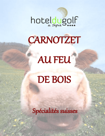 CARNOTZET AU FEU DE BOIS Spécialités suisses Entrées ½ port Crème de légumes de saison Creamy seasonal vegetable soup CHF 9.— Petite salade du buffet (assiette ovale) Salads from the buffet (small oval plate) CHF 8.— Grande salade du buffet (assiette ronde) Salads from the buffet (round plate) CHF 13.— Assiette de viande séchée des Grisons Plate of dried meat from Grisons region CHF 15.— CHF 26.— Assiette campagnarde avec Gruyère, jambon de Parme, salami, viande séchée et lard fumé Mix plate with Gruyère cheese, Parma ham, salami, dried meat and smoked bacon CHF 14.— CHF 25.— Fines tranches de saumon fumé maison au sapin, et sa crème montée framboisine Thin slices of home smoked salmon, creamy raspberry sauce TVA incluse / VAT included CHF 24.— Mets typiques Fondue au fromage moitié-moitié Gruyère et Vacherin Cheese fondue half Gruyère half Vacherin CHF 25.—/pers Fondue au fromage à la tomate fraîche servie avec pommes nouvelles (min.2 pers) Cheese fondue with fresh tomatoes served with jacket potatoes (min.2 people) CHF 28.—/pers Fondue au fromage aux échalotes (min.2 pers) Cheese fondue with shallots (min.2 people) CHF 26.—/pers Fondue au fromage aux bolets (min.2 pers) Cheese fondue with mushrooms (min.2 people) CHF 29.—/pers Raclette de la région au feu de bois à gogo servie avec pommes nouvelles Regional cheese raclette melted on the fire place at discretion Served with jacket potatoes TVA incluse / VAT included CHF 31.—/pers Autres suggestions Fondue Bourguignonne et ses 5 sauces, pommes frites et buffet de salades Meat fondue with 5 sauces, French fries and salad buffet (200g/pers, min.2 pers) CHF48.—/pers + supplément viande 100 g + meat supplement 100 g CHF 15.— Entrecôte de bœuf grillée et son beurre Maître d’hôtel (200 g.) Servie avec garnitures du jour Grilled beef entrecote, Maître d’hôtel butter (200 g.) Served with garnish of the day Filets de perche poêlés façon Meunière au citron et sauce tartare Perch fillets « Meunière » with lemon and tartar sauce CHF 39.— CHF 39.— Servis avec garnitures du jour Served with garnish of the day Spaghetti au coulis de tomates et basilic frais Spaghetti with tomatoes and fresh basil TVA incluse / VAT included CHF 20.— Carte enfants Spaghetti au coulis de tomates et basilic frais Spaghetti with tomatoes and fresh basil CHF 16.— Lasagne vertes traditionnelles maison avec viande de bœuf suisse Homemade green lasagne in traditional style with Swiss beef meat CHF 18.— Entrecôte de bœuf (150 grammes), pommes frites et légume du jour Beef entrecote with French fries and vegetable of the day CHF 19.50 Filets de perche poêlés avec garnitures du jour Perch fillets “Meunière” and garnish of the day CHF 20.— Nuggets de poulet avec garnitures du jour Chicken nuggets and garnish of the day CHF 16.— Portion de frites avec mayonnaise ou ketchup French fries portion with mayonnaise or ketchup CHF TVA incluse/ VAT included 9.— Desserts Ananas frais au Kirsch Fresh pineapple with kirsch CHF 12.— Coupe de salade de fruits frais Fresh fruit salad CHF Coupe fruits rouges et glace vanille Wild red berries and vanilla ice-cream CHF 12.— Tarte maison du jour Homemade tart of the day CHF Crème brûlée aux saveurs d'hiver Crème brûlée with winter flavors CHF 11.— Tarte tatin et sa boule de glace vanille Appel tart tatin and vanilla ice cream CHF 11.— Fondant au chocolat, crème anglaise et son sorbet framboise (20 min.) Chocolate fudge, custard and raspberry sorbet (20 min.) CHF 15.— Coupe de glace Dame Blanche, sauce chocolat et crème chantilly Coupe Denmark (vanilla ice-cream with chocolate sauce and whipped cream) CHF 12.— Coupe Valaisanne à l’abricot et Abricotine Coupe Valaisanne (apricot sorbet with apricot spirit) CHF 14.— Sorbet Colonel au citron et Vodka Coupe Colonel (lemon sorbet with Vodka) CHF 14.— Coupe de glace 2 boules Vanille, mocca, chocolat, fraise, citron, abricot, poire, pomme, framboise Vanilla, mocha, chocolate, strawberry, lemon, apricot, pear, apple, raspberry TVA incluse / VAT included CHF 9.50 8.— 6.—