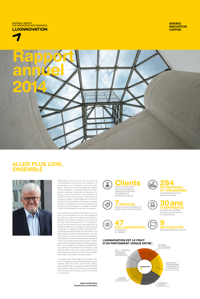 Rapport annuel 2014 ALLER PLUS LOIN, ENSEMBLE «Résolument tournés vers la mise en œuvre et la concrétisation économique du «Triangle de la connaissance» au Luxembourg, nous nous appliquons – dans chacune de nos actions et ce depuis 30 ans maintenant – à renforcer le lien entre l’enseignement supérieur, la recherche et l’innovation. On dit souvent que «la recherche, c’est transformer de l’argent en savoir et l’innovation, c’est transformer du savoir en argent». Notre mission est d’inciter ces transformations en facilitant l’émergence de projets innovants. L’expertise et le soutien qu’apportent les équipes de Luxinnovation au quotidien favorisent l’accès des entreprises de toute taille à l’innovation. On ne crée pas une culture d’innovation en un jour. Mais on peut décider, en un jour, de s’engager et de mettre en place une nouvelle dynamique pour atteindre des objectifs ambitieux. Le succès de la phase pilote du programme «Fit for Innovation» prouve qu’avec de bons outils, l’innovation peut se traduire rapidement en croissance économique et en emplois. Au regard du nombre croissant d’entreprises désireuses de bénéficier de notre soutien, nous allons passer à la phase d’implémentation, étendre notre champ d’action et permettre aux entreprises d’améliorer leurs performances et leurs capacités à innover. Les projets phares lancés, durant l’année, par les Clusters illustrent également cette dynamique. Enfin, avec la perspective de devenir prochainement une agence de financement de l’innovation, nous serons à même d’offrir de nouveaux services et un accompagnement renforcé tout au long de la chaîne d’innovation et de création de valeur ajoutée. Clients START-UP INNOVANTES PETITES, MOYENNES ET GRANDES ENTREPRISES ORGANISMES DE RECHERCHE PUBLICS 7SERVICES DÉDIÉS AU DÉVELOPPEMENT DE VOTRE CAPACITÉ D’INNOVATION 47 COLLABORATEURS 23 FEMMES ET 24 HOMMES LUXINNOVATION EST LE FRUIT D’UN PARTENARIAT UNIQUE ENTRE : 284 ENTREPRISES ET ORGANISMES ACCOMPAGNÉES EN 2014 DONT 60 % DE PME 30 ans D’EXPÉRIENCE AU CŒUR DU SYSTÈME NATIONAL DE RECHERCHE ET D’INNOVATION 9 NATIONALITÉS REPRÉSENTÉES DANS L’ÉQUIPE MINISTÈRE DE L’ÉCONOMIE FEDIL — BUSINESS FEDERATION LUXEMBOURG L’innovation est un effort collectif. Pour réussir, il faut pouvoir s’appuyer sur des partenaires fiables et expérimentés. Selon Henry Ford, «se réunir est un début, rester ensemble est un progrès et travailler ensemble est la réussite». Alors nous continuerons à rassembler nos forces parce que si seul on va plus vite, ensemble on va plus loin». MINISTÈRE DE L’ENSEIGNEMENT SUPÉRIEUR ET DE LA RECHERCHE CHAMBRE DES MÉTIERS Raymond Schadeck Président de Luxinnovation CHAMBRE DE COMMERCE 2014 EN BREF Financements nationaux 129 dossiers ont été acceptés et soumis par 87 entreprises différentes dont 47 PME. (chiffres provisoires au 31 décembre 2014). Sont ici pris en compte tous les projets RDI financés par les lois RDI et ENVIRONNEMENT du Ministère de l’Économie. Répartition des entreprises financées selon leur taille Répartition des 129 dossiers : Répartition des dossiers selon les différents régimes d’aides : 111 dossiers 54% PME 46% GRANDES ENTREPRISES Répartition des dossiers selon leur thématique LOI RDI RECHERCHE / INNOVATION déposés par 73 entreprises dont : EcoInnovation 5 7 dossiers R&D soumis par 36 entreprises et 5 33 dossiers innovation soumis par 30 entreprises 21 dossiers minimis (dont 6 Fit diagnostic) par 16 entreprises (dont 6 entreprises impliquées dans le programme Fit for Innovation) Études de faisabilité Innovation de procédés et d’organisation dans les services 29% 11 47% Services de conseil en innovation Protection de la propriété intellectuelle Jeunes entreprises innovantes 8 Space 7 R&D Minimis (dont 6 Fit diagnostic) 18 dossiers 1% 57 2 Materials & Production Technologies 22% 1% ICT 21 BioHealth Nombre de start-up et d’entreprises artisanales financées dans le cadre des lois RDI et ENVIRONNEMENT LOI ENVIRONNEMENT ENVIRONNEMENT déposés par 15 entreprises différentes 4 start-up 2 9 entreprises artisanales 8 Investissements 10 Études 16 partenariats PUBLIC-PRIVÉ (recherche collaborative et contractuelle) dans le cadre des projets soutenus par la loi RDI 02 ACTIVITÉS 2014 Financements européens Horizon 2020 : contrats signés en 2014 25 projets remportés par des organisations luxembourgeoises POUR UN TOTAL DE Total du retour financier national des participations luxembourgeoises dans le cadre des programmes européens de recherche et d’innovation en 2014 par secteur 6,25 millions € Public : 5.539.942€ Privé : E TAUX DE SUCCÈS L des projets luxembourgeois pour les appels 2014 est de Autre : 19,71 %, soit le deuxième meilleur taux enregistré en Europe 19 participants uniques ont obtenu des projets Une dizaine d’entreprises ont fait appel à l’aide Fit4Horizon2020 pour les aider à monter un projet H2020 4.334.565 € 684.246 € 10.558.753 € 41 projets Université du Luxembourg 3 5 Autres Active and Assisted Living (AAL) participations luxembourgeoises ont été 3 enregistrées lors de ce premier challenge. 1 participation du LIST a été retenue pour cofinancement. EUREKA 2 participations luxembourgeoises au 1 programme EUREKA ont été recensées en 2014 dont 7 ont été enregistrées pour les deux appels à projets du programme Eurostars 2 lancés en 2014 et 5 participations au Cluster ITEA2(1). Enterprise Europe Network (EEN) 44 clients conseillés 2 4 entreprises et laboratoires de recherche publics aidés dans la publication de 6 profils technologiques débouchant sur 3 accords de partenariat avec la Belgique et la France. 36 participants ont par ailleurs honoré 147 rendez-vous d’affaires lors des 5 événements organisés par l’équipe EEN de Luxinnovation. Innovation dans l’artisanat 0 idées de RDI identifiées provenant 