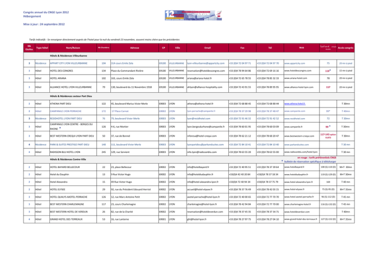 Congrès annuel du CNGE Lyon 2012 Hébergement Mise à jour : 24 septembre 2012 Tarifs indicatifs - Se renseigner directement auprès de l'hotel pour la nuit du vendredi 23 novembre, souvent moins chère que les précédentes Nb Etoiles Type hôtel Nom/Raison Adresse Nb Chambres CP Ville Email Fax Tél Web Tarif en € simple- double Accès congrès Hôtels & Résidences Villeurbanne 3 Résidence APPART CITY LYON VILLEURBANNE 104 314 cours Emile Zola 69100 VILLEURBANNE [email protected] +33 (0)4 72 04 97 71 +33 (0)4 72 04 97 70 www.appartcity.com 3 Hôtel HOTEL DES CONGRES 134 Place du Commandant Rivière 69100 VILLEURBANNE [email protected] +33 (0)4 78 94 64 86 +33 (0)4 72 69 16 16 www.hoteldescongres.com 3 Hôtel HOTEL ARIANA 102 163, cours Emile Zola 69100 VILLEURBANNE [email protected] +33 (0)4 72 65 78 55 +33 (0)4 78 85 32 33 3 Hôtel ALLIANCE HOTEL LYON VILLEURBANNE 79 130, boulevard du 11 Novembre 1918 69100 VILLEURBANNE [email protected] +33 (0)4 72 43 91 55 75 20 mn à pied 110* 15 mn à pied www.ariana-hotel.com 78 20 mn à pied +33 (0)4 78 89 95 95 www.alliance-hotel-lyon.com 117 20 mn à pied Hôtels & Résidences secteur Part Dieu 2 Hôtel ATHENA PART DIEU 122 45, boulevard Marius Vivier Merle 69003 LYON [email protected] +33 (0)4 72 68 88 45 +33 (0)4 72 68 88 44 www.athena-hotel.fr 2 Hôtel CAMPANILE LYON PERRACHE 172 17 Place Carnot 69002 LYON [email protected] +33 (0)4 78 37 29 98 +33 (0)4 78 37 48 47 www.campanile.com 99* T 40mn 3 Résidence RESIDHOTEL LYON PART DIEU 76 79, boulevard Vivier Merle 69003 LYON [email protected] +33 (0)4 72 91 46 32 +33 (0)4 72 91 42 52 www.residhotel.com 72 T 30mn 126 4-6, rue Mortier 69003 LYON [email protected] +33 (0)4 78 60 01 95 +33 (0)4 78 60 03 09 www.campanile.fr 99 * T 30mn CAMPANILE LYON CENTRE - BERGES DU T 30mn 3 Hôtel 3 Hôtel BEST WESTERN CREQUI LYON PART DIEU 50 37, rue de Bonnel 69003 LYON [email protected] +33 (0)4 78 62 21 12 +33 (0)4 78 60 20 47 www.bestwestern-crequi.com 4 Résidence PARK & SUITES PRESTIGE PART-DIEU 140 111, boulevard Vivier Merle 69003 LYON [email protected] +33 (0)4 72 84 10 41 +33 (0)4 72 84 10 40 www.parkandsuites.com T 30 mn 4 Hôtel RADISSON BLU HOTEL LYON 245 129, rue Servient 69003 LYON [email protected] +33 (0)4 78 63 55 20 +33 (0)4 78 63 55 00 www.radissonblu.com/hotel-lyon T 30 mn RHONE * 117-143 option 91473 T 30mn en rouge : tarifs préférentiels CNGE Hôtels & Résidences Centre-Ville * bulletin de réservation spécifique à télécharger 2 Hôtel HOTEL BAYARD BELLECOUR 22 23, place Bellecour 69002 LYON [email protected] +33 (0)4 72 40 95 51 +33 (0)4 78 37 39 64 www.hotelbayard.fr 100 (S)-110 (D) M+T 30mn 2 Hôtel Hotel du Dauphin 13 9 Rue Victor Hugo 69002 LYON [email protected] +33(0)4 42 40 20 84 +33(0)4 78 37 18 34 www.hoteldudauphin.fr 119 (S)-129 (D) M+T 30mn 2 Hôtel Hotel Alexandra 15 49 Rue Victor Hugo 69002 LYON [email protected] +33(0)4 72 40 94 34 +33(0)4 78 37 75 79 www.hotel-alexandra-lyon.fr 169 T 40 mn 2 Hôtel HOTEL ELYSEE 29 92, rue du Président Edouard Herriot 69002 LYON [email protected] +33 (0)4 78 37 76 49 +33 (0)4 78 42 03 15 www.hotel-elysee.fr 75 (S)-95 (D) M+T 35mn 3 Hôtel HOTEL QUALYS AXOTEL PERRACHE 126 12, rue Marc-Antoine Petit 69002 LYON [email protected] +33 (0)4 72 40 00 65 +33 (0)4 72 77 70 70 www.hotel-axotel-perrache.fr 96 (S)-112 (D) T 45 mn 3 Hôtel BEST WESTERN CHARLEMAGNE 117 23, cours Charlemagne 69002 LYON [email protected] +33 (0)4 78 42 94 84 +33 (0)4 72 77 70 00 www.charlemagne-hotel.fr 116 (S)-132 (D) T 45 mn 3 Hôtel BEST WESTERN HOTEL DE VERDUN 26 82, rue de la Charité 69002 LYON [email protected] +33 (0)4 78 37 45 35 +33 (0)4 78 37 34 71 www.hoteldeverdun.com 4 Hôtel GRAND HOTEL DES TERREAUX 53 16, rue Lanterne 69001 LYON [email protected] +33 (0)4 78 27 97 75 +33 (0)4 78 27 04 10 www.grand-hotel-des-terreaux.fr T 40mn 127 (S)-152 (D) M+T 35mn Congrès annuel du CNGE Lyon 2012 Hébergement > hotels Accor uniquement HOTELS ACCOR Nb Etoiles Type hôtel Nom/Raison Nb Chambres Adresse CP Ville Email Fax Tél Web Tarif en euros Accès congrès Hôtels & Résidences Villeurbanne 4 Hôtel MERCURE LYON CHARPENNES 96 7, place Charles Hernu 69100 VILLEURBANNE [email protected] +33 (0)4 78 89 10 14 +33 (0)4 72 44 46 46 www.mercure.com 149 (S) -159 (D) T1 - 14 mn 112 T1 30 mn 141 (S)-151 (D) T1 25 mn 112 T1 30mn 180 (S)-190 (D) T1 25 mn Hôtels & Résidences secteur Part Dieu 2 Hôtel IBIS PART DIEU GARE 144 3 Place Renaudel 69003 LYON [email protected] +33 (0)4 78 60 42 85 +33 (0)4 78 95 42 11 www.ibishotel.com 3 Hôtel ALL SEASONS LYON PART DIEU 99 54, rue de la Villette 69003 LYON [email protected] +33(0) 4 72 68 25 49 +33 (0)4 72 68 25 40 www.accorhotels.com 3 Hôtel IBIS LYON PART DIEU LES HALLES 216 78, rue de Bonnel 69003 LYON [email protected] +33 (0)4 78 60 13 00 +33 (0)4 78 62 98 89 www.ibishotel.com 4 Hôtel MERCURE LYON PART DIEU 108 50, rue de la Villette 69003 LYON +33 (0)4 72 68 25 29 +33 (0)4 72 68 25 20 www.accorhotels.com 4 Hôtel NOVOTEL LYON PART DIEU 124 47, boulevard Marius Vivier Merle 69212 LYON +33 (0)4 72 13 51 99 +33 (0)4 72 13 51 51 www.novotel.com/0735 [email protected] 180 (S)-190 (D) T1 30 mn * Hôtels & Résidences Centre-Ville 3 Hôtel IBIS LYON CENTRE PERRACHE 123 28, cours de Verdun-Perrache 69002 LYON [email protected] +33 (0)4 78 37 02 58 +33 (0)4 78 37 56 55 www.ibishotel.com 102 T1 45mn 4 Hôtel MERCURE GRAND HOTEL CHATEAU PERRACHE 111 12, cours de Verdun Rambaud 69002 LYON [email protected] +33 (0)4 72 77 15 08 +33 (0)4 72 77 15 00 www.mercure.com 152 T1 45mn en rouge : tarifs préférentiels CNGE * bulletin de réservation spécifique à télécharger