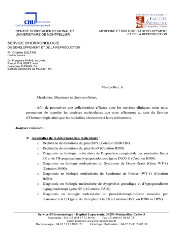 CENTRE HOSPITALIER REGIONAL ET UNIVERSITAIRE DE MONTPELLIER MEDECINE ET BIOLOGIE DU DEVELOPPMENT ET DE LA REPRODUCTION SERVICE D'HORMONOLOGIE DU DEVELOPPEMENT ET DE LA REPRODUCTION Pr. Charles SULTAN Chef de Service Dr. Françoise PARIS, MCU-PH Pascal PHILIBERT, AHU Françoise AUDRAN, PA Barbara CRASTES de PAULET, PA Montpellier, le Mesdames, Messieurs et chers confrères, Afin de poursuivre une collaboration efficace avec les services cliniques, nous nous permettons de rappeler les analyses moleculaires que nous effectuons au sein du Service d’Hormonologie ainsi que les modalités nécessaires à leurs réalisations. Analyses réalisées : Anomalies de la détermination testiculaire : o Recherche de mutations du gène SRY (Cotation B300 HN) o Recherche de mutations du gène Sox9 (Cotation B500) o Diagnostic en biologie moléculaire de l'hypoplasie congénitale des surrénales liée à l'X et de l'Hypogonadisme hypogonadotrope (gène DAX-1) (Cotation B500). o Diagnostic en biologie moléculaire du Syndrome de Denys-Drash (Gène WT-1) (Cotation B500). o Diagnostic en biologie moléculaire du Syndrome de Frasier (WT-1) (Cotation B500). o Diagnostic en biologie moléculaire de dysgénésie gonadique et d'hypogonadisme hypogonadotrope (gène SF1) (Cotation B500). o Diagnostic en biologie moléculaire du pseudohermaphrodisme masculin par résistance à la LH (gène du Récepteur à la LH) (Cotation B500 ou B700 en DPN) Service d'Hormonologie - Hopital Lapeyronie, 34295 Montpellier Cedex 5 Secrétariat : Tel +33 (0)4 67 33 86 96 Fax +33 (0)4 67 04 85 73 email: [email protected] Hormonologie : 04 67 33 83 30/83 29 Génétique Moléculaire : 04 67 33 83 29/83 28 Résistance aux androgènes : o Diagnostic en biologie moléculaire du pseudohermaphrodisme masculin par insensibilité aux androgènes (gène du récepteur aux androgènes) (Cotation B500 ou B700 en DPN). o Diagnostic en biologie moléculaire du pseudohermaphrodisme masculin par déficit en 5-alpha-réductase (Cotation B500 ou B700 en DPN). Anomalies de la puberté : o Recherche de mutation activatrice de la protéine Gs en position R201 dans le syndrome de MacCune Albright (Cotation B300 HN). o Recherche de mutation inhibitrice de la protéine Gi (Cotation B300 HN). o Diagnostic en biologie moléculaire de la testotoxicose (gène du Récepteur à la LH) (Cotation B500 ou B700 en DPN). Diagnostic en biologie moléculaire des dysplasies septo-optiques (gène HESX-1) (Cotation B500). Diagnostic du syndrome de « Mayer-Rokitansky-Kuster-Hauser » associé à une hyperandrogénie (Recherche de mutation du gène Wnt4) (Cotation B500). Diagnostic en biologie moléculaire de la maladie de Kennedy (Détermination du nombre de glutamine, CAG, du gène des Récepteurs aux androgènes) (Cotation B500) Détection de marqueurs du chromosome Y associés au syndrome de turner (SRY, Amilogénine, Sy90, Dys 132,...) (Cotation B300 HN). Conditions de réalisation et demande de renseignements : Les analyses de biologie moléculaire sont des investigations lourdes et parfois complexes, aussi nous vous prions de nous adresser, en même temps que les prélèvements, des renseignements cliniques, biologiques et radiologiques détaillés, ainsi que tout élément suceptible d’argumenter votre demande. Pour cela, nous fournissons en annexe 1 un compte rendu type ( pour le pseudohermaphrodisme masculin) qu’il sera nécessaire de nous renvoyer en même temps que l'ADN du patient. Service d'Hormonologie - Hopital Lapeyronie, 34295 Montpellier Cedex 5 Secrétariat : Tel +33 (0)4 67 33 86 96 Fax +33 (0)4 67 04 85 73 email: [email protected] Hormonologie : 04 67 33 83 30/83 29 Génétique Moléculaire : 04 67 33 83 29/83 28 Aspects règlementaires : Références : décret n° 2000-570 du 23 juin 2000 fixant les conditions de prescription et de réalisation de l'examen des caractéristiques génétiques d'une personne à des fins médicales. Il est rappelé qu’il est obligatoire de faire signer une feuille de consentement éclairé à la réalisation d’études génétiques aux patients ou aux parents pour les patients mineurs. Ce consentement sera conservé par le médecin demandeur de l’analyse qui devra nous fournir une attestation certifiant d'une part avoir informé le patient des caractéristiques de la maladie recherchée, des moyens de la détecter et des possibilités de prévention et de traitement (Voir modèle en annexe 2). Cette attestation est remise au praticien agréé réalisant l’examen ; le double de celle-ci est versée au dossier médical de la personne concernée (article R-145-15-4 et 5 CSP). Le laboratoire agréé réalisant les examens doit : • disposer de la prescription et de l'attestation du prescripteur • adresser le compte-rendu d'analyse, signé par un praticien responsable agréé, exclusivement au médecin prescripteur des examens génétiques (article R-14514-14) Nous vous prions donc de nous faire parvenir avec les éléments précédents et les prélèvements : • • Une ordonnance comportant uniquement les nom, prénom et date de naissance du patient ainsi que les analyses demandées sans autre information concernant la pathologie Un bon de prise en charge établi par l'établissement demandeur Conditions de prélèvement et d’acheminement : Les prélèvements doivent étre impérativement adressés en début de semaine de façon à éviter les problèmes d’acheminement du courrier en fin de semaine (risque de dégradation de l’ADN). • ADN déjà extrait Envoi à température ambiante par Colissimo ou Chronopost 10 µg minimum • Sang : Envoi à température ambiante par Colissimo ou Chronopost 2 tubes de 5 ml de sang total sur EDTA (2 ml minimum pour les nouveaux-nés) Les tubes de sang total peuvent être conservés avant envoi à +4°C (pas de congélation) pendant quelques jours pour éviter un envoi trop tardif dans la semaine Service d'Hormonologie - Hopital Lapeyronie, 34295 Montpellier Cedex 5 Se