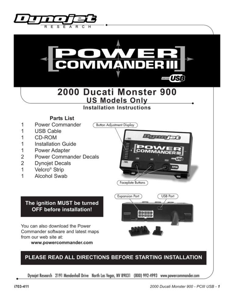 2000 Ducati Monster 900 US Models Only Installation Instructions Parts List Button Adjustment Display Power Commander USB Cable CD-ROM Installation Guide Power Adapter Power Commander Decals Dynojet Decals Velcro® Strip Alcohol Swab 1 1 1 1 1 2 2 1 1 Faceplate Buttons Expansion Port USB Port The ignition MUST be turned OFF before installation! You can also download the Power Commander software and latest maps from our web site at: www.powercommander.com PLEASE READ ALL DIRECTIONS BEFORE STARTING INSTALLATION Dynojet Research 2191 Mendenhall Drive North Las Vegas, NV 89031 (800) 992-4993 www.powercommander.com i703-411 2000 Ducati Monster 900 - PCIII USB - 1 Remove the seat. 2 Lift fuel tank. 3 Unplug connector from ECU (Fig. A). 4 Plug male connector from PCIII into ECU (Fig. B). 5 Plug female connector from PCIII into male connector from original harness (Fig. C). 6 Run PCIII cable under fuel tank and along frame rail to the area under the seat. Fig. A 1 Stock Connector Fig. C Fig. B ECU i703-411 www.powercommander.com 2000 Ducati Monster 900 - PCIII USB - 2 Mount PCIII unit to rear most area under seat using provided self adhesive velcro (Fig. D). Fig. D 7 i703-411 www.powercommander.com 2000 Ducati Monster 900 - PCIII USB - 3
