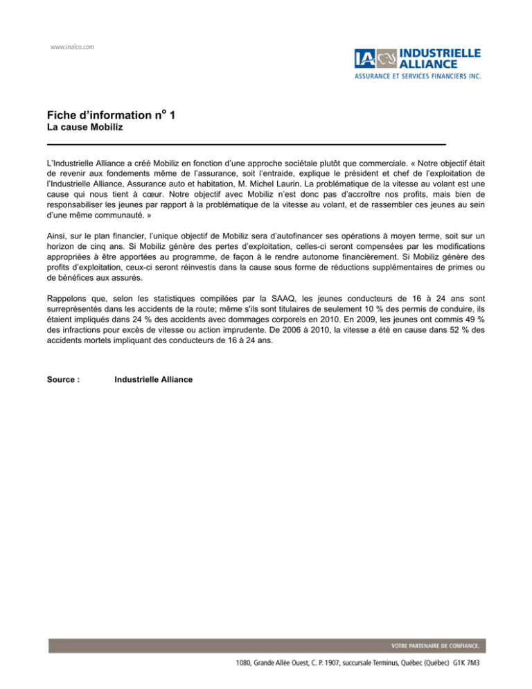Fiche d’information no 1 La cause Mobiliz L’Industrielle Alliance a créé Mobiliz en fonction d’une approche sociétale plutôt que commerciale. « Notre objectif était de revenir aux fondements même de l’assurance, soit l’entraide, explique le président et chef de l’exploitation de l’Industrielle Alliance, Assurance auto et habitation, M. Michel Laurin. La problématique de la vitesse au volant est une cause qui nous tient à cœur. Notre objectif avec Mobiliz n’est donc pas d’accroître nos profits, mais bien de responsabiliser les jeunes par rapport à la problématique de la vitesse au volant, et de rassembler ces jeunes au sein d’une même communauté. » Ainsi, sur le plan financier, l’unique objectif de Mobiliz sera d’autofinancer ses opérations à moyen terme, soit sur un horizon de cinq ans. Si Mobiliz génère des pertes d’exploitation, celles-ci seront compensées par les modifications appropriées à être apportées au programme, de façon à le rendre autonome financièrement. Si Mobiliz génère des profits d’exploitation, ceux-ci seront réinvestis dans la cause sous forme de réductions supplémentaires de primes ou de bénéfices aux assurés. Rappelons que, selon les statistiques compilées par la SAAQ, les jeunes conducteurs de 16 à 24 ans sont surreprésentés dans les accidents de la route; même s'ils sont titulaires de seulement 10 % des permis de conduire, ils étaient impliqués dans 24 % des accidents avec dommages corporels en 2010. En 2009, les jeunes ont commis 49 % des infractions pour excès de vitesse ou action imprudente. De 2006 à 2010, la vitesse a été en cause dans 52 % des accidents mortels impliquant des conducteurs de 16 à 24 ans. Source : Industrielle Alliance Fiche d’information no 2 L’utilisation de la télématique en assurance auto Il existe déjà, ailleurs dans le monde, des programmes d’assurance auto dont la tarification est basée sur le kilométrage ou sur le comportement des conducteurs. Ces programmes, généralement appelés « pay as you drive », ajoutent à leur tarification traditionnelle un critère basé sur kilométrage réel parcouru par l’automobiliste, tel que mesuré par un module de type GPS. Certains programmes, surtout en Europe, ont également commencé à utiliser la télématique pour détecter les comportements du conducteur. Pour la première fois au Canada, Mobiliz utilise cette technologie dans un programme destiné spécifiquement aux jeunes conducteurs. L’appareil télématique de Mobiliz utilise la technologie GPS pour détecter, à chaque seconde d’utilisation du véhicule, les données de localisation, de vitesse, de freinages brusques et d’accélérations forcées. Ce module d’environ 4,5 cm X 5 cm est installé sous le tableau de bord de la voiture et n’est donc pas apparent. Son installation prend généralement moins de 30 minutes et est gratuite dans les quelque 220 centres d’installation accrédités de Mobiliz, provenant des réseaux Belron (Lebeau, Duro) et Uniban (VitroPlus et le Docteur du Pare-Brise). Les données de comportement détectées sont transmises par voie cellulaire. Dans le cas où le réseau cellulaire n’est pas accessible ou hors de portée, les données sont stockées et transmises au moment du retour d’accès au réseau. Dans les rares cas où le réseau GPS n’est pas disponible (par exemple dans un tunnel), les données de comportement ne sont pas détectées et le conducteur n’est donc pas pénalisé en cas de comportements déviants. Par ailleurs, les ententes conclues par Mobiliz avec les réseaux Belron (Lebeau, Duro) et Uniban (VitroPlus et le Docteur du Pare-Brise), permettent de desservir plus de 90 % de la population québécoise. Il n’est donc pas plus difficile de faire installer son appareil Mobiliz que de faire réparer son pare-brise. L’installation est gratuite pour l’assuré Mobiliz. L’assuré domicilié à plus de 50 km d’un installateur accrédité sera avisé à l’avance lors de l’achat de sa police d’assurance. Le nouvel assuré Mobiliz bénéficie d’une période de 10 jours pour faire installer son appareil. Il sera toutefois assuré entre l’achat de la police et l’installation de l’appareil et ne sera pas pénalisé pour ses comportements au cours du premier mois (il pourra toutefois bénéficier des rabais liés à un comportement exemplaire). L’appareil télématique consomme moins de 23 milliampères. Une protection antidécharge a été prévue pour que l’appareil se mette automatiquement en mode économie d’énergie lorsqu’il détecte un voltage de batterie faible afin d’éviter des désagréments. Dans le cas d’un changement de véhicule, l’assuré Mobiliz peut faire installer un nouvel appareil gratuitement. Il n’est donc pas nécessaire pour l’assuré de faire désinstaller son appareil original et de le faire réinstaller dans son nouveau véhicule. L’assuré qui désire annuler sa police n’a pas à faire retirer l’appareil télématique de sa voiture, mais la transmission des données sera désactivée. Source : Industrielle Alliance Fiche d’information no 3 Les comportements de conduite et leur impact sur la prime mensuelle de Mobiliz La prime de Mobiliz varie en fonction de quatre comportements, soit : le kilométrage réel, les excès de vitesse, les freinages brusques et les accélérations forcées. Mobiliz n’applique pas une politique de tolérance zéro. Ainsi, il est possible d’avoir un comportement déviant, particulièrement dans le cas d’un freinage brusque (pour éviter un obstacle, par exemple) sans pour autant perdre son statut de conducteur émérite. C’est lorsque ces comportements s’avèrent trop fréquents que l’assuré augmente son risque d’accident. Chaque mois, l’assuré Mobiliz pourra comparer sa conduite globale à celle de la communauté. Dans le cas d’une conduite exceptionnelle, l’assuré pou