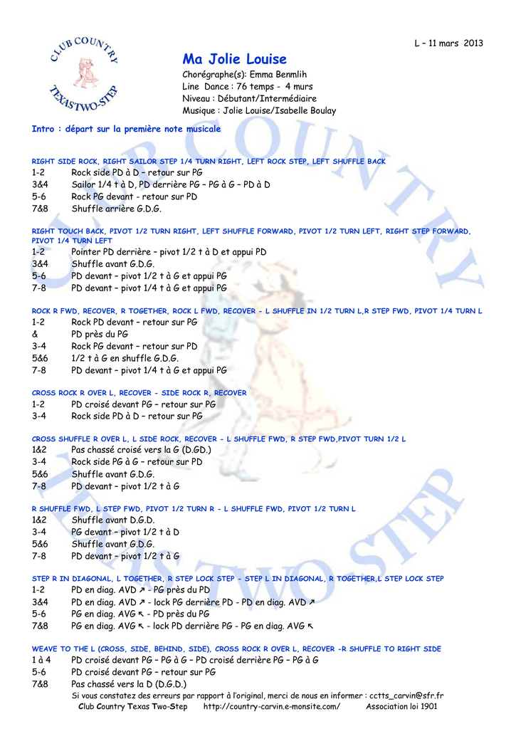Ma Jolie Louise L – 11 mars 2013 Chorégraphe(s): Emma Benmlih Line Dance : 76 temps - 4 murs Niveau : Débutant/Intermédiaire Musique : Jolie Louise/Isabelle Boulay Intro : départ sur la première note musicale RIGHT SIDE ROCK, RIGHT SAILOR STEP 1/4 TURN RIGHT, LEFT ROCK STEP, LEFT SHUFFLE BACK 1-2 3&4 5-6 7&8 Rock side PD à D – retour sur PG Sailor 1/4 t à D, PD derrière PG – PG à G – PD à D Rock PG devant - retour sur PD Shuffle arrière G.D.G. RIGHT TOUCH BACK, PIVOT 1/2 TURN RIGHT, LEFT SHUFFLE FORWARD, PIVOT 1/2 TURN LEFT, RIGHT STEP FORWARD, PIVOT 1/4 TURN LEFT 1-2 3&4 5-6 7-8 Pointer PD derrière – pivot 1/2 t à D et appui PD Shuffle avant G.D.G. PD devant – pivot 1/2 t à G et appui PG PD devant – pivot 1/4 t à G et appui PG ROCK R FWD, RECOVER, R TOGETHER, ROCK L FWD, RECOVER - L SHUFFLE IN 1/2 TURN L,R STEP FWD, PIVOT 1/4 TURN L 1-2 & 3-4 5&6 7-8 Rock PD devant – retour sur PG PD près du PG Rock PG devant – retour sur PD 1/2 t à G en shuffle G.D.G. PD devant – pivot 1/4 t à G et appui PG CROSS ROCK R OVER L, RECOVER - SIDE ROCK R, RECOVER 1-2 3-4 PD croisé devant PG – retour sur PG Rock side PD à D – retour sur PG CROSS SHUFFLE R OVER L, L SIDE ROCK, RECOVER - L SHUFFLE FWD, R STEP FWD,PIVOT TURN 1/2 L 1&2 3-4 5&6 7-8 Pas chassé croisé vers la G (D.GD.) Rock side PG à G – retour sur PD Shuffle avant G.D.G. PD devant – pivot 1/2 t à G R SHUFFLE FWD, L STEP FWD, PIVOT 1/2 TURN R - L SHUFFLE FWD, PIVOT 1/2 TURN L 1&2 3-4 5&6 7-8 Shuffle avant D.G.D. PG devant – pivot 1/2 t à D Shuffle avant G.D.G. PD devant – pivot 1/2 t à G STEP R IN DIAGONAL, L TOGETHER, R STEP LOCK STEP - STEP L IN DIAGONAL, R TOGETHER,L STEP LOCK STEP 1-2 3&4 5-6 7&8 PD en diag. AVD PD en diag. AVD PG en diag. AVG PG en diag. AVG - PG près du PD - lock PG derrière PD - PD en diag. AVD - PD près du PG - lock PD derrière PG - PG en diag. AVG WEAVE TO THE L (CROSS, SIDE, BEHIND, SIDE), CROSS ROCK R OVER L, RECOVER -R SHUFFLE TO RIGHT SIDE 1à4 5-6 7&8 PD croisé devant PG – PG à G – PD croisé derrière PG – PG à G PD croisé devant PG – retour sur PG Pas chassé vers la D (D.G.D.) Si vous constatez des erreurs par rapport à l’original, merci de nous en informer : [email protected] Club Country Texas Two-Step http://country-carvin.e-monsite.com/ Association loi 1901 Ma Jolie Louise - suite WEAVE TO THE R (CROSS, SIDE, BEHIND, SIDE), CROSS ROCK L OVER R, RECOVER -L SHUFFLE TO LEFT SIDE 1à4 5-6 7-8 PG croisé devant PD – PD à D – PG croisé derrière PD – PD à D PG croisé devant PD – retour sur PD Pas chassé vers la G (G.D.G.) R JAZZ BOX - CROSS R OVER L - UNWIND TO THE LEFT IN A FULL TURN (END WEIGHT ON L) 1à4 5-6 7-8 Jazz box, PD croisé devant PG – PG derrière – PD à D – PG devant PD croisé devant PG – PAUSE Dérouler en un tour complet à G, terminer en appui PG FINAL On termine en faisant le bloc de 4 comptes, suivi du cross shuffle Droit Ajouter : 1/4 t à D, PG derrière - 1/2 t à D, PD devant - pour terminer sur le mur de départ Souriez et recommencez. Si vous constatez des erreurs par rapport à l’original, merci de nous en informer : [email protected] Club Country Texas Two-Step http://country-carvin.e-monsite.com/ Association loi 1901