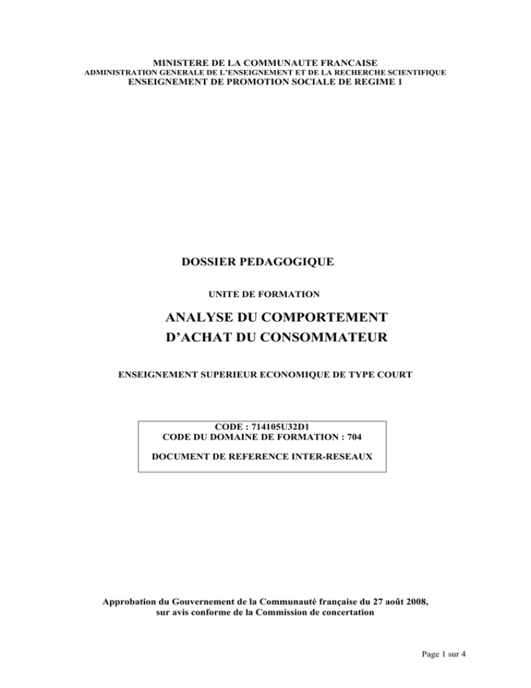 MINISTERE DE LA COMMUNAUTE FRANCAISE ADMINISTRATION GENERALE DE L’ENSEIGNEMENT ET DE LA RECHERCHE SCIENTIFIQUE ENSEIGNEMENT DE PROMOTION SOCIALE DE REGIME 1 DOSSIER PEDAGOGIQUE UNITE DE FORMATION ANALYSE DU COMPORTEMENT D’ACHAT DU CONSOMMATEUR ENSEIGNEMENT SUPERIEUR ECONOMIQUE DE TYPE COURT CODE : 714105U32D1 CODE DU DOMAINE DE FORMATION : 704 DOCUMENT DE REFERENCE INTER-RESEAUX Approbation du Gouvernement de la Communauté française du 27 août 2008, sur avis conforme de la Commission de concertation Page 1 sur 4 ANALYSE DU COMPORTEMENT D’ACHAT DU CONSOMMATEUR ENSEIGNEMENT SUPERIEUR ECONOMIQUE DE TYPE COURT 1. FINALITES DE L’UNITE DE FORMATION 1.1. Finalités générales Conformément à l’article 7 du décret de la Communauté française du 16 avril 1991 organisant l’Enseignement de promotion sociale, cette unité de formation doit : ♦ concourir à l’épanouissement individuel en promouvant une meilleure insertion professionnelle, sociale et culturelle et scolaire; ♦ répondre aux besoins et demandes en formation émanant des entreprises, des administrations, de l’enseignement et d’une manière générale des milieux socioéconomiques et culturels. 1.2. Finalités particulières L’unité de formation vise à permettre à l’étudiant : ♦ d’analyser le marché en se basant sur les attitudes et le comportement d’achat du consommateur ; ♦ de mettre en œuvre les nouvelles stratégies d’anticipation du développement de l’organisation en tenant compte des facteurs environnementaux. 2. CAPACITES PREALABLES REQUISES 2.1. Capacités ♦ résumer les idées essentielles d’un texte d’intérêt général et les critiquer ; ♦ produire un message structuré qui exprime un avis, une prise de position devant un fait, un événement, … (des documents d’information pouvant être mis à sa disposition). 2.2. Titre pouvant en tenir lieu C.E.S.S. Page 2 sur 4 3. HORAIRE MINIMUM DE L’UNITE DE FORMATION 3.1. Dénomination des cours Classement Code U CT B CT B P Analyse du marché et comportement d’achat du consommateur Facteurs environnementaux et d’innovation 3.2. Part d’autonomie Total des périodes 4. Nombre de périodes 48 16 16 80 PROGRAMME L’étudiant sera capable : face à des situations concrètes de la vie professionnelle mettant en œuvre des stratégies marketing différenciées, 4.1. Analyse du marché et comportement d’achat du consommateur ♦ d'analyser les mécanismes de la consommation et le comportement d’achat du consommateur au travers notamment des notions suivantes : ♦ approches positive et interprétative du comportement du consommateur, approche par les valeurs et la personnalité, ♦ typologie des besoins du consommateur, de ses motivations et conceptualisation de son implication, ♦ différents concepts de style de vie, ♦ relation entre attitudes et comportements, ♦ facteurs sociaux et culturels, ♦ rôles maritaux dans les décisions et processus de consommation, cycles de vie familiale, ♦ prise de décision et de traitement de l’information : ➢ stratégies et actes de décision du consommateur, ➢ identification des critères de choix. 4.2. Facteurs environnementaux et d’innovation ♦ de mettre en place une démarche anticipative en utilisant les moyens de contrôle et de pilotage de l’organisation ; ♦ d’analyser la situation économique actuelle afin de formuler une problématique d’anticipation ; ♦ d’analyser les cinq grandes phases de la démarche proactive : ♦ le diagnostic global de l’activité, ♦ la détermination d’un enjeu à terme, ♦ l’étude de la faisabilité rétro projetée sur le présent, ♦ l’analyse de la cohérence entre la situation présente et la situation « enjeu », ♦ la fixation des objectifs de progrès et des indicateurs de pilotage ; ♦ de mettre en œuvre, dans le cadre d'une démarche d'innovation, les différentes méthodes de créativité. Page 3 sur 4 5. CAPACITES TERMINALES Pour atteindre le seuil de réussite, l’étudiant sera capable : face à des situations concrètes de la vie professionnelle mettant en œuvre des stratégies marketing différenciées, ♦ d’analyser le comportement d’achat du consommateur ; ♦ d’expliciter la démarche proactive et de proposer une stratégie de développement de l’organisation. Pour la détermination du degré de maîtrise, il sera tenu compte des critères suivants : ♦ ♦ ♦ ♦ 6. le degré de pertinence des choix opérés, la finesse de l'analyse, la qualité de l’argumentation, le degré de précision et la clarté dans l’emploi des termes techniques. CHARGE(S) DE COURS Un enseignant ou un expert. L’expert devra justifier de compétences issues d’une expérience professionnelle actualisée et reconnue dans le domaine en relation avec le programme de formation du présent dossier pédagogique. 7. CONSTITUTION DES GROUPES OU REGROUPEMENT Aucune recommandation particulière. Page 4 sur 4
