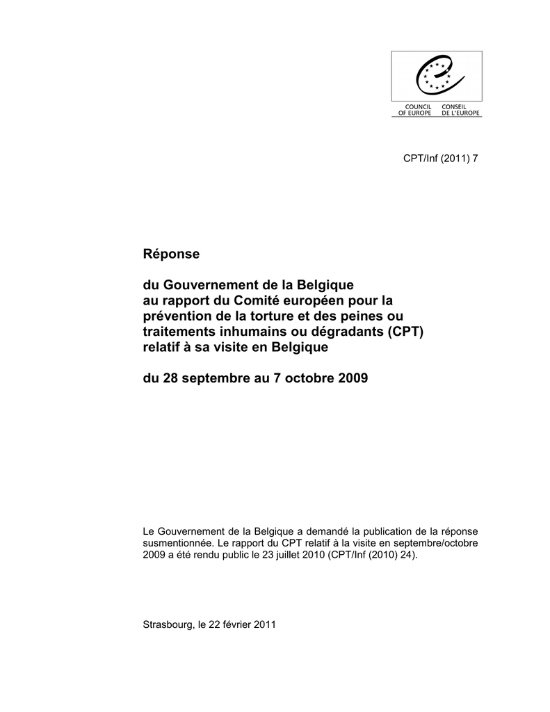 CPT/Inf (2011) 7 Réponse du Gouvernement de la Belgique au rapport du Comité européen pour la prévention de la torture et des peines ou traitements inhumains ou dégradants (CPT) relatif à sa visite en Belgique du 28 septembre au 7 octobre 2009 Le Gouvernement de la Belgique a demandé la publication de la réponse susmentionnée. Le rapport du CPT relatif à la visite en septembre/octobre 2009 a été rendu public le 23 juillet 2010 (CPT/Inf (2010) 24). Strasbourg, le 22 février 2011 -3- Réponse des autorités belges au rapport du Comité européen pour la prévention de la torture et des peines ou traitements inhumains ou dégradants (CPT) relatif à sa visite en Belgique du 28 septembre au 7 octobre 2009 -4- INTRODUCTION Conformément à l’article 7 de la Convention européenne pour la prévention de la torture et des peines ou traitements inhumains ou dégradants, une délégation du Comité européen pour la prévention de la torture a effectué une cinquième visite en Belgique du 28 septembre au 7 octobre 2009. Celle-ci faisait partie du programme de visite périodique pour l’année 2009. Lors de cette visite, plusieurs types d’établissements (établissement des forces de l’ordre, établissements pénitentiaires, une institution psychiatrique, un centre de rétention pour étrangers, une institution pour mineurs handicapés) ont été visités. C’est avec un souci de coopération totale vis-à-vis de la délégation qui s’est rendue en Belgique que les autorités belges ont envisagé cette visite. Ainsi, les membres du Comité pour la prévention de la torture et des peines ou traitements inhumains ou dégradants ont pu visiter tous les lieux sollicités et y rencontrer à la fois des personnes privées de liberté, des responsables ou des membres du personnel. Au début de la visite, la délégation du CPT a également eu des échanges avec des représentants politiques et des autorités administratives dont la liste se trouve en annexe du rapport du CPT. Faisant suite au Rapport au gouvernement de la Belgique relatif à la visite effectuée en Belgique par le Comité européen pour la prévention de la torture et des peines ou traitements inhumains ou dégradants, adopté par le CPT le 16 avril 2010, la présente contribution fournit des informations sur la manière dont le Gouvernement belge met en œuvre les remarques qui lui ont été adressées. La structure du présent rapport est basée sur celle présente dans le rapport du CPT. Les autorités belges se sont efforcées de répondre aux observations du CPT dans la mesure du possible. Il faut toutefois observer que l’absence de gouvernement fédéral pleinement en fonction au niveau fédéral depuis sa démission le 22 avril 2010 a une implication importante sur la mise en œuvre des observations émises par le CPT ; de telles circonstances faisant obstacle à la prise d’initiatives politiques. Le Gouvernement ne manquera pas de communiquer au CPT les informations utiles qui interviendraient après le dépôt de ce rapport, à sa demande. -5- A. Consultation et coopération Commentaires Le CPT demande aux autorités belges de rappeler formellement à l'ensemble des fonctionnaires de la police fédérale et locale, quel que soit leur grade, ainsi qu'à tous les membres du service de sécurité du Ministère de la Justice, les compétences et le mandat des délégations du CPT qui effectuent des visites. Il serait en outre hautement souhaitable que les rapports de visite du CPT fassent partie intégrante du programme de formation initiale et continue des fonctionnaires de police en Belgique (paragraphe 6). En ce qui concerne les Services de Police, un courrier d’information relatif aux missions et mandats du CPT est adressé lors de la préparation des visites du CPT, à chaque zone de la police locale et entité opérationnelle de la police fédérale. Les autorités de ces zones et entités se chargent à leur tour d’en informer leurs membres du personnel, au moyen par exemple de notes internes comme c’est le cas pour la zone de Bruxelles Midi (note interne n° 112/2009 – Annonce de la visite possible du Comité européen pour la prévention de la torture et des peines ou traitements inhumains ou dégradants). Par ailleurs, l’existence et les missions du CPT sont rappelées dans des modules de formation, tels que par exemple le cours d’éthique et déontologie dispensé lors de la formation de base. Enfin, le Commissaire général de la Police fédérale et le Président de la Commission permanente de la Police locale veilleront à ce que les recommandations du CPT soient communiquées à tous les services de Police. Le nouveau centre de connaissance pour la police intégrée constitue également à cet égard un outil de communication. En ce qui concerne les agents de l’Ordre judiciaire, une lettre explicative qui annonçait la visite de la délégation du CPT en 2009 et qui précisait le rôle et les compétences du CPT a été envoyée le 11 février 2009 à tous les chefs de corps et les gestionnaires des bâtiments où se trouvent les complexes cellulaires. Cette initiative sera reconduite avant la prochaine visite. Etablissements de la police Mauvais traitements Recommandations Qu’il soit rappelé aux fonctionnaires de police qu’au moment de procéder à une interpellation, l'usage de la force doit être limité à ce qui est strictement nécessaire ; de surcroît, dès l'instant où la personne interpellée a été maîtrisée, rien ne saurait jamais justifier qu’elle soit frappée (paragraphe 13) ; La formation de base des membres du cadre opérationnel des Services de Police comprend plusieurs modules qui abordent l’usage de la force, tant d’un point de vue théorique que pratique. Un rappel des principes légaux régissant l’usage de la force par les policiers, à savoir la légalité, la subsidiarité et la proportionnalité, est opéré dans chacun de ces modules