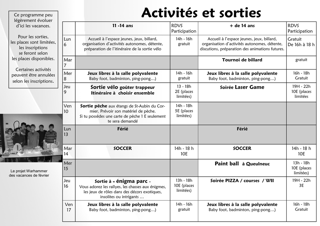 Activités et sorties Ce programme peu légèrement évoluer d’ici les vacances. Pour les sorties, les places sont limitées, les inscriptions se feront selon les places disponibles. Certaines activités peuvent être annulées selon les inscriptions. Le projet Warhammer des vacances de février Lun 6 11 -14 ans RDVS Participation Accueil à l’espace jeunes, jeux, billard, organisation d’activités autonomes, détente, préparation de l’itinéraire de la sortie vélo 14h - 16h gratuit Mar 7 + de 14 ans RDVS Participation Accueil à l’espace jeunes, jeux, billard, Gratuit organisation d’activités autonomes, détente, De 16h à 18 h discutions, préparation des animations futures. Tournoi de billard gratuit Mer 8 Jeux libres à la salle polyvalente 14h - 16h gratuit Jeux libres à la salle polyvalente 16h - 18h Gratuit Jeu 9 Sortie vélo goûter trappeur 13 - 18h 2E (places limitées) Soirée Laser Game 19H - 22h 10E (places limitées Ven 10 Sortie pêche aux étangs de St-Aubin du Cor- 14h - 18h 5E (places limitées) Baby foot, badminton, ping-pong…) Itinéraire à choisir ensemble mier. Prévoir son matériel de pèche. Si tu possèdes une carte de pèche 1 E seulement te sera demandé Lun 13 Férié Mar 14 SOCCER Férié 14h - 18 h 10E Mer 15 Jeu 16 Ven 17 Baby foot, badminton, ping-pong…) SOCCER 14h - 18 h 10E Paint ball à Queulneuc 13h - 18h 10E (places limitées) Sortie à « énigma parc » 13h - 18h 10E (places limitées) Soirée PIZZA / courses / WII 19H - 22h 3E Jeux libres à la salle polyvalente 14h - 16h gratuit Jeux libres à la salle polyvalente 16h - 18h Gratuit Vous adorez les rallyes, les chasses aux énigmes, les jeux de rôles dans des décors exotiques, insolites ou intrigants … Baby foot, badminton, ping-pong…) Baby foot, badminton, ping-pong…)