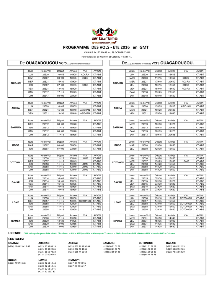 PROGRAMME DES VOLS - ETE 2016 en GMT VALABLE DU 27 MARS AU 29 OCTOBRE 2016 Heures locales de Niamey et Cotonou = GMT + 1 De OUAGADOUGOU vers…(Destinations ci-dessous) ABIDJAN ACCRA BAMAKO De…(Destinations ci-dessous) vers OUAGADOUGOU. Jours No de Vol Départ Arrivée VIA AVION Jours No de Vol Départ Arrivée LUN 2J520 10H45 14H05 ACCRA XT-ABT LUN 2J520 14H45 16H15 MAR 2J507 08H00 10H35 BOBO XT-ABT MAR 2J508 11H15 13H50 BOBO XT-ABT MER 2J521 15H30 17H00 XT-ABT MER 2J521 17H40 20H40 ACCRA XT-ABT JEU 2J507 07H00 09H35 JEU 2J508 10H15 12H50 BOBO XT-ABT VEN 2J521 13H30 15H00 XT-ABT VEN 2J521 15H40 18H40 ACCRA XT-ABT SAM 2J517 17H15 18H45 XT-ABT SAM 2J518 19H25 20H55 XT-ABT DIM 2J517 08H00 09H30 XT-ABT DIM 2J518 10H10 11H40 XT-ABT Jours No de Vol Départ Arrivée Jours No de Vol Départ Arrivée VIA AVION LUN 2J520 10H45 12H05 LUN 2J520 13H05 16H15 ABIDJAN XT-ABT MER 2J521 15H30 18H40 ABIDJAN XT-ABT MER 2J521 19H20 20H40 XT-ABT VEN 2J521 13H30 16H40 ABIDJAN XT-ABT VEN 2J521 17H20 18H40 XT-ABT Jours No de Vol Départ Arrivée VIA AVION Jours No de Vol Départ Arrivée MER 2J512 08H00 09H20 XT-ABS MER 2J513 10H00 11H20 XT-ABS BOBO VIA XT-ABT ABIDJAN AVION XT-ABT ACCRA BAMAKO VIA AVION XT-ABT VIA AVION JEU 2J512 17H15 18H35 XT-ABT JEU 2J513 19H15 20H35 XT-ABT SAM 2J512 08H00 09H20 XT-ABT SAM 2J513 10H05 11H25 XT-ABT DIM 2J512 17H15 18H35 XT-ABT DIM 2J513 19H15 20H35 XT-ABT Jours No de Vol Départ Arrivée Jours No de Vol Départ Arrivée MAR 2J507 08H00 08H50 XT-ABT MAR 2J508 13H00 13H50 XT-ABT JEU 2J507 07H00 07H50 XT-ABT JEU 2J508 12H00 12H50 XT-ABT No de Vol 2J558 2J557 2J558 2J558 2J558 Départ 11H15 11H15 11H15 11H15 11H15 Arrivée 13H40 12H45 13H40 13H40 13H40 VIA LOME COTONOU Jours LUN MER JEU SAM DIM AVION XT-ABS XT-ABS XT-ABS XT-ABS XT-ABS COTONOU Jours LUN MER JEU SAM DIM No de Vol 2J558 2J557 2J558 2J558 2J558 Départ 14H20 13H25 14H20 14H20 14H20 Arrivée 15H50 15H50 15H50 15H50 15H50 No de Vol 2J514 2J514 2J514 2J514 2J514 Départ 16H45 16H45 16H45 16H45 16H45 Arrivée 19H35 19H35 19H35 19H35 19H35 VIA DAKAR Jours LUN JEU VEN SAM DIM No de Vol 2J515 2J515 2J515 2J515 2J515 Départ 07H30 07H30 07H30 07H30 07H30 Arrivée 10H20 10H20 10H20 10H20 10H20 VIA DAKAR Jours MER JEU VEN SAM DIM AVION XT-ABS XT-ABS XT-ABS XT-ABS XT-ABS No de Vol 2J558 2J557 2J558 2J558 2J558 Départ 11H15 11H15 11H15 11H15 11H15 Arrivée 12H30 13H55 12H30 12H30 12H30 VIA LOME Jours LUN MER JEU SAM DIM No de Vol 2J558 2J557 2J558 2J558 2J558 Départ 13H10 14H35 13H10 13H10 13H10 Arrivée 15H50 15H50 15H50 15H50 15H50 VIA COTONOU LOME Jours LUN MER JEU SAM DIM AVION XT-ABS XT-ABS XT-ABS XT-ABS XT-ABS No de Vol 2J530 2J530 2J530 2J530 Départ 12H15 13H30 13H00 13H00 Arrivée 13H10 14H25 13H55 13H55 NIAMEY Jours MER JEU SAM DIM No de Vol 2J531 2J531 2J531 2J531 Départ 13H50 15H05 14H35 14H35 Arrivée 14H45 16H00 15H30 15H30 VIA NIAMEY Jours MER JEU SAM DIM BOBO LEGENDE VIA LOME LOME LOME AVION AVION XT-ABS XT-ABS XT-ABS XT-ABS XT-ABS AVION XT-ABS COTONOU XT-ABS XT-ABS XT-ABS XT-ABS VIA AVION XT-ABT XT-ABT XT-ABT XT-ABT BOBO VIA VIA LOME COTONOU COTONOU COTONOU OUA = Ouagadougou -- BOY = Bobo Dioualasso -- ABJ = Abidjan -- NIM = Niamey -- ACC = Accra -- BKO = Bamako -- DKR = Dakar -- LFW = Lomé -- COO = Cotonou CONTACTS: OUAGA: ABIDJAN: ACCRA: BAMAKO: COTONOU: DAKAR: (+226) 25 49 23 41 à 47 (+225) 20 32 89 19 (+225) 20 32 20 65 (+225) 21 58 72 22 (+225) 07 00 95 63 (+233) 302 76 88 92-94 (+233) 302 76 44 65 (+233) 265 74 16 63 (+223) 20 21 01 78 (+223) 20 21 07 74 (+223) 72 19 24 88 (+229) 21 31 68 28 (+229) 21 30 98 65 (+229) 21 30 05 85 (+229) 64 48 78 78 (+221) 33 822 22 25 (+221) 33 822 22 26 (+221) 78 162 62 20 BOBO: LOME: NIAMEY: (+226) 20 97 13 48 (+228) 22 61 18 44 (+228) 22 61 18 45 (+228) 22 61 18 46 (+228) 90 1227 82 (+227) 20 73 90 55 (+227) 90 90 65 17 AVION AVION XT-ABS XT-ABS XT-ABS XT-ABS XT-ABS AVION XT-ABT XT-ABT XT-ABT XT-ABT