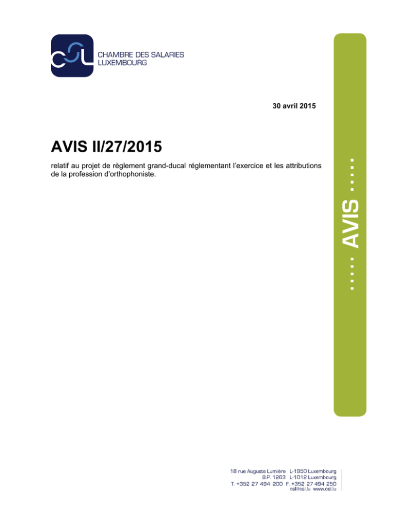 30 avril 2015 AVIS II/27/2015 relatif au projet de règlement grand-ducal réglementant l’exercice et les attributions de la profession d’orthophoniste. 2/5 Par lettre du 18 mars 2015, Mme Lydia Mutsch, ministre de la Santé, a soumis à l’avis de la Chambre des salariés (CSL) un projet de règlement grand-ducal réglementant l’exercice et les attributions de la profession d’orthophoniste. 1. L’objet du projet 1. Le projet de règlement grand-ducal a pour objectif de réglementer l’exercice et les attributions de la profession de santé réglementée de l’orthophoniste. 2. Cette profession trouve sa base légale dans la loi du 18 novembre 1967 portant réglementation de certaines professions paramédicales, et a été reprise dans la loi du 26 mars 1992 sur l’exercice et la revalorisation de certaines professions de santé. Actuellement, c’est le règlement grand-ducal de 1970 qui règle les études et les attributions de l’orthophoniste. 3. Vu son ancienneté et considérant que le projet de règlement constitue une refonte intégrale des dispositions relatives à la profession d’orthophoniste, le gouvernement a par ailleurs prévu d’abroger le règlement grand-ducal du 30 juin 1970. 2. Le contenu du projet 2.1. La reconnaissance des diplômes étrangers 4. Le projet de règlement grand-ducal fait abstraction de la procédure de reconnaissance des diplômes étrangers. Le gouvernement argumente que la reconnaissance des qualifications professionnelles est désormais réglée au niveau de l’Union européenne, via la directive 2005/36/CE, et que la reconnaissance des titres de formation d’orthophoniste doit se faire sur base de la loi du 19 juin 2009 ayant pour objet la transposition de cette directive. 5. L’exposé des motifs du projet ajoute que la formation d’orthophoniste est exclusivement délivrée à l’étranger et qu’une liste d’exigences en matière du contenu des formations n’a pas lieu de figurer dans le texte du projet. 2.2. La mise à jour des missions et attributions de l’orthophoniste 6. Le gouvernement a jugé que l’énumération des attributions professionnelles contenue dans le règlement grand-ducal de 1970 est trop superficielle et qu’elle ne prend pas adéquatement en compte les détails spécifiques indispensables à l’inventaire des actes professionnels incombant aux orthophonistes. 7. De surcroît, il estime que la liste du règlement de 1970 doit être complétée par certains actes essentiels de la pratique orthophonique actuelle. La terminologie doit ainsi être mise à jour et les troubles orthophoniques doivent être déclinés et nommés compte tenu de tous les détails nécessaires. La liste des actes professionnels des orthophonistes doit, toujours selon l’exécutif luxembourgeois, être adaptée à l’évolution des méthodologies rééducatives. 8. Vu la procédure de reconnaissance des qualifications professionnelles mise en place par la directive 2005/36/CE, et considérant que le Luxembourg n’offre pas de formation universitaire en orthophonie, le gouvernement estime grande l’importance d’une liste détaillée et explicite des attributions professionnelles. 3/5 En effet, c’est autour de ce profil professionnel détaillé que se décline la procédure de reconnaissance des qualifications professionnelles obtenues à l’étranger, ainsi que le constat d’éventuelles différences substantielles au niveau de la formation par rapport au profil professionnel exigé. 9. En conséquence, par rapport au texte de 1970, le projet de règlement a voulu mieux détailler la définition de l’orthophoniste et mentionner aussi, à côté du traitement, la prévention et l’évaluation des troubles du langage. En outre, le texte du projet décline le langage dans ses composantes principales que sont la voix, l’articulation, la parole, la déglutition, l’audition, la compréhension, et précise également que l’orthophoniste traite les troubles du langage oral et écrit. 2.3. La communication avec le médecin-prescripteur 10. Le texte soumis pour avis dégage certains actes de l’obligation d’une ordonnance médicale préalable, notamment le bilan orthophonique initial, les épreuves d’évaluation du langage organisées par un service étatique ou agréé par l’État, ainsi que les audiométries de dépistage nécessaires dans le cadre de bilans ou traitements orthophoniques. 11. Le projet stipule également que, dans le cadre d’un traitement orthophonique, le bilan initial, comprenant le diagnostic orthophonique, un plan de soins et les objectifs du traitement proposé, doit être communiqué au médecin prescripteur. En outre, l'orthophoniste doit notamment adresser, à l'issue de la dernière séance, un rapport orthophonique au médecin-prescripteur. 2.4. L’introduction des langues de rééducation aux niveaux de l’autorisation d’exercer et du titre professionnel 12. Cet élément est le changement majeur par rapport à l’ancien texte, étant donné qu’il introduit le concept de langues de rééducation. 13. Le gouvernement a considéré que l’objet de la prise en charge orthophonique étant la rééducation du langage oral et écrit, la parfaite maîtrise de la langue de rééducation est matière inhérente et incompressible à tout acte thérapeutique de l’orthophoniste. 14. Ainsi, par analogie avec la loi du 13 juin 2013 sur la profession d’avocat, des conditions de maîtrise linguistique spécifiques et dérogatoires sont, dans le projet de règlement grand-ducal, prévues pour les orthophonistes dont les compétences sont de facto limitées aux langues pour lesquelles ils peuvent attester d’une maîtrise parfaite. 15. Le gouvernement juge que, vu la liberté d’établissement et la reconnaissance des diplômes étrangers et vu le contexte économique, le pourcentage d’orthophonistes étrangers établis au Grand-Duché de Luxembourg est en constante progressio