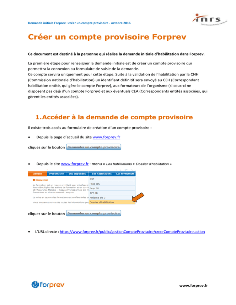 Demande initiale Forprev : créer un compte provisoire ‐ octobre 2016 Créer un compte provisoire Forprev Ce document est destiné à la personne qui réalise la demande initiale d’habilitation dans Forprev. La première étape pour renseigner la demande initiale est de créer un compte provisoire qui permettra la connexion au formulaire de saisie de la demande. Ce compte servira uniquement pour cette étape. Suite à la validation de l’habilitation par la CNH (Commission nationale d’habilitation) un identifiant définitif sera envoyé au CEH (Correspondant habilitation entité, qui gère le compte Forprev), aux formateurs de l’organisme (si ceux‐ci ne disposent pas déjà d’un compte Forprev) et aux éventuels CEA (Correspondants entités associées, qui gèrent les entités associées). 1. Accéder à la demande de compte provisoire Il existe trois accès au formulaire de création d’un compte provisoire : Depuis la page d’accueil du site www.forprev.fr cliquez sur le bouton Depuis le site www.forprev.fr : menu « Les habilitations > Dossier d’habilitation » cliquez sur le bouton L’URL directe : https://www.forprev.fr/public/gestionCompteProvisoire/creerCompteProvisoire.action www.forprev.fr Demande initiale Forprev : créer un compte provisoire ‐ octobre 2016 2. Renseigner la demande de compte provisoire Pour renseigner la demande de compte provisoire, il faut renseigner les champs « Nom », « Prénom », « Adresse mail », « Confirmation de l’adresse mail », et répondre à la question. Une adresse mail ne peut être utilisée qu’une fois pour créer un compte provisoire. Si vous êtes amené à créer un deuxième compte provisoire, vous devrez utiliser une nouvelle adresse mail. Renseignez les champs de ce formulaire en relisant attentivement pour éviter les erreurs de saisie, de l’adresse mail en particulier. Puis cliquez sur , pour recevoir un e‐mail émis par NO‐REPLY‐ [email protected]. Cet email est émis instantanément et contient le mot de passe nécessaire à la connexion sur l’environnement provisoire de saisie de la demande d’habilitation. www.forprev.fr Demande initiale Forprev : créer un compte provisoire ‐ octobre 2016 3. Réception des identifiants de connexion L’identifiant (ou login) est l’adresse mail renseignée lors de la demande de compte provisoire. www.forprev.fr