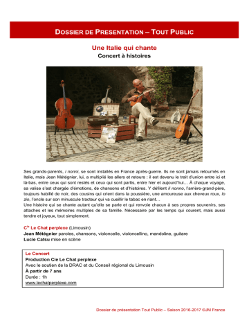 DOSSIER DE PRESENTATION – TOUT PUBLIC Une Italie qui chante Concert à histoires Ses grands-parents, i nonni, se sont installés en France après-guerre. Ils ne sont jamais retournés en Italie, mais Jean Métégnier, lui, a multiplié les allers et retours : il est devenu le trait d’union entre ici et là-bas, entre ceux qui sont restés et ceux qui sont partis, entre hier et aujourd’hui… À chaque voyage, sa valise s’est chargée d’émotions, de chansons et d’histoires. Y défilent il nonno, l’arrière-grand-père, toujours habillé de noir, des cousins qui crient dans la poussière, une amoureuse aux cheveux roux, lo zio, l’oncle sur son minuscule tracteur qui va cueillir le tabac en riant… Une histoire qui se chante autant qu’elle se parle et qui renvoie chacun à ses propres souvenirs, ses attaches et les mémoires multiples de sa famille. Nécessaire par les temps qui courent, mais aussi tendre et joyeux, tout simplement. Cie Le Chat perplexe (Limousin) Jean Métégnier paroles, chansons, violoncelle, violoncellino, mandoline, guitare Lucie Catsu mise en scène Le Concert Production Cie Le Chat perplexe Avec le soutien de la DRAC et du Conseil régional du Limousin À partir de 7 ans Durée : 1h www.lechatperplexe.com Dossier de présentation Tout Public – Saison 2016-2017 ©JM France A PROPOS DU CONCERT «Je crois plus que jamais que parler de la "double culture" est important, de la transmission, du sens des choses, de génération en génération… par les mots, et les musiques… Ce spectacle touche en douceur ceux qui ont reçu et ceux qui transmettent ; ceux qui sentent en eux le mélange des histoires, des influences, des origines, les bretons comme les turcs, les lorrains comme les "ritals"…Cette évocation, même modeste, dépasse l'Italie, elle invoque les parents, les grands-parents, les paroles entendues et transmises "mine de rien"…Elle perpétue l'enfance et donne un sens au chemin à venir !» Ma grand-mère disait toujours : «Se vuoi sapere dove si deve andare, non si deve dimenticare da dove vieni : si tu veux savoir où tu dois aller, tu ne dois pas oublier d'où tu viens.» Des comptines traditionnelles aux textes poétiques de Fabrizio De Andre (le Brassens Italien), en passant par Sergio Franchi (dont toutes les italiennes étaient amoureuses), Jean Métégnier mélange avec espièglerie l'italien et le français, évoquant son enfance, à moitié français, à moitié italien. L’EQUIPE ARTISTIQUE JEAN METEGNIER Jean Métégnier a rejoint la Cie Le chat perplexe en 2002. Il est avant tout musicien, mais un musicien pour qui la parole est une évidence, une nécessité. Dire, raconter, partager. Il glisse mine de rien des mots entre les notes pour nous conduire sur son chemin. Il a aujourd'hui envie d'interroger sa propre histoire et développer sa réflexion sur la double culture. Jean Métégnier a tout d’abord appris la musique sans le savoir, au côté de la Nonna Maria qui chantait à tue-tête dans son jardin. En grandissant il a eu envie de tâter de la musique « pour de vrai » : la guitare et le violoncelle au Conservatoire. Instrumentiste, puis chef de chœur, il a également travaillé 12 ans auprès des enfants comme musicien intervenant. Au sein du Chat perplexe, il a joué dans le spectacle « Les Poilus » d’après un texte de Joseph Delteil au côté de Lucie Catsu, sur des partitions de Gabriel Fauré et Camille St-Saëns. Il a également accompagné régulièrement au violoncelle les contes de Lucie Catsu dans les spectacles « Histoire de voir la lune » et « Le Salon de Sieste ». Dossier de présentation – Saison 2016-2017 ©JM France LUCIE CATSU, METTEUR EN SCENE Un brin de malice au creux des yeux, Lucie Catsu met dans ses mots, dans sa voix toute la générosité de ce qu'elle a envie de partager. Elle raconte comme elle chante, et elle chante simplement avec sincérité. Ses histoires sont souvent insolites, chargées de sensualité, de poésie et d'humour. Elle porte ses personnages dans ses mains, dans son corps et c'est avec une infinie tendresse qu'elle nous invite à les rencontrer. Raconter est au-delà du plaisir, c'est une nécessité : nécessité de partager des émotions, de partager un moment de vie, de croiser des destinées réelles et inventées, celles de personnages et de ceux qui sont venus écouter… De sa rencontre avec des musiciens explorateurs (Nicolas Gotro et Estelle Coquin) naît la Compagnie Le chat perplexe. Ensemble ils créent depuis 1998 des spectacles insolites et émouvants, s'amusant à mélanger et à explorer des genres très différents : conte, théâtre d'objet, musique, littérature, chant… LE PROGRAMME MUSICAL TOUT PUBLIC Le spectacle fait entendre plusieurs extraits musicaux. Y sont insérés des passages en langue française, ou parlé, etc... Chants traditionnels napolitains Coscine di pollo, Piove piove Différentes versions de Bella Ciao (chant populaire italien) Fabrizio de Andre Via del campo, Storia di Marinella Claudio Villa La Signora di trent'anni fa Sergio Franchi Torna a Surriento Comptines italiennes La Fiera de l'est, Cavaluccio, La Gallina... Extraits instrumentaux : violoncelle solo (Bach sarabande en sol M), mandoline (chorus Bella Ciao) Dossier de présentation – Saison 2016-2017 ©JM France CITATIONS PRESSE « Des portraits musicaux drôles et souvent très tendres, de toute une famille restée en Italie… Le français et l’italien se mêlent sans cesse pour finalement ne faire plus qu’une seule langue, peuplée de personnages attachants et chantants, qui empruntent aux deux cultures. » « Jean Métégnier installe sa valise et ses instruments pour nous emmener de l’autre côté des Alpes. [...] La guitare et la mandoline savent se faire délicatement tendres mais toniques aussi. Ça swingue tout à fait «al dente» ! » « Avec espièglerie, mais aussi beaucoup de sensibilité, il nous emmène au-delà des Alpes, mélangean
