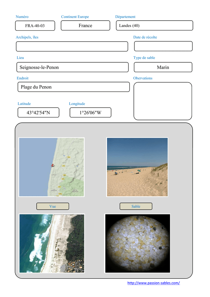 Numéro Continent Europe France FRA-40-03 Département Landes (40) Archipels, îles Date de récolte Lieu Type de sable Seignosse-le-Penone Marin Endroit Obervations Plage du Penon Latitude Longitude 43°42'54"N 1°26'06"W Carte Photo Vue Sable http://www.passion-sables.com/