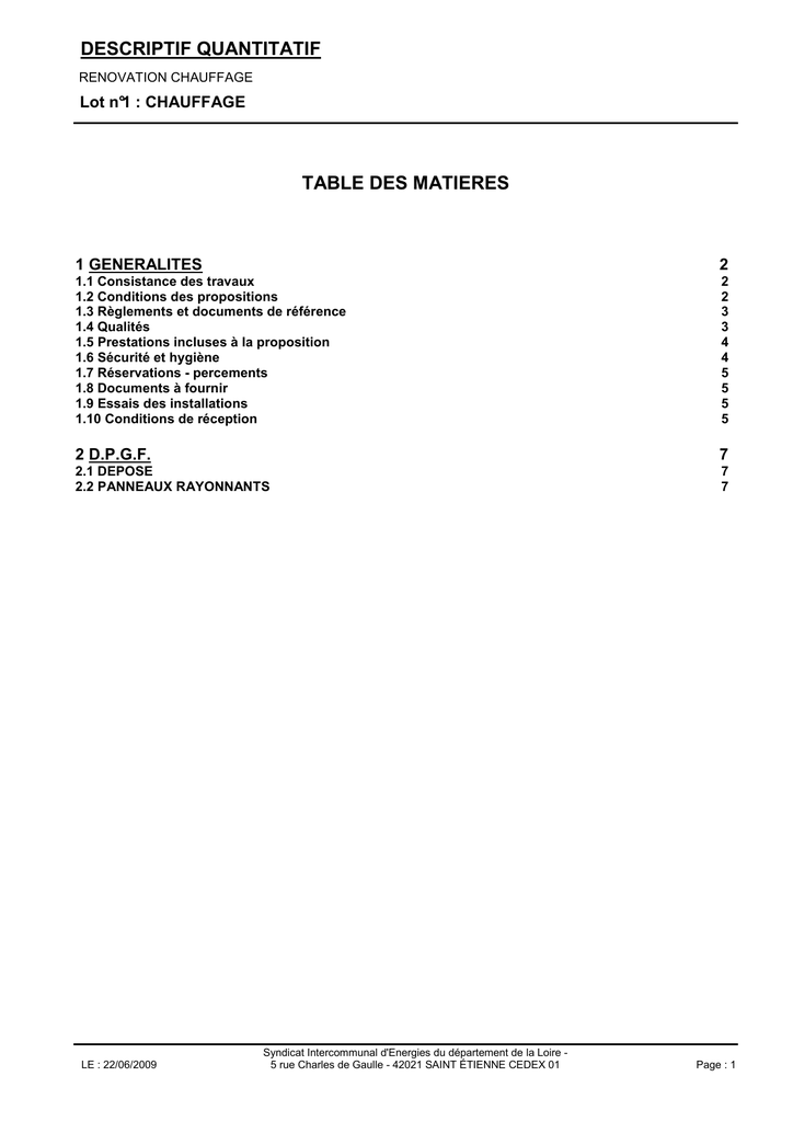 DESCRIPTIF QUANTITATIF RENOVATION CHAUFFAGE Lot n°1 : CHAUFFAGE TABLE DES MATIERES 1 GENERALITES 2 1.1 Consistance des travaux 1.2 Conditions des propositions 1.3 Règlements et documents de référence 1.4 Qualités 1.5 Prestations incluses à la proposition 1.6 Sécurité et hygiène 1.7 Réservations - percements 1.8 Documents à fournir 1.9 Essais des installations 1.10 Conditions de réception 2 2 3 3 4 4 5 5 5 5 2 D.P.G.F. 7 2.1 DEPOSE 2.2 PANNEAUX RAYONNANTS 7 7 LE : 22/06/2009 Syndicat Intercommunal d'Energies du département de la Loire 5 rue Charles de Gaulle - 42021 SAINT ÉTIENNE CEDEX 01 Page : 1 DESCRIPTIF QUANTITATIF RENOVATION CHAUFFAGE Lot n°1 : CHAUFFAGE 1 GENERALITES 1.1 Consistance des travaux A00_06_ Les travaux consistent à rénover le système de chauffage de la salle des Arts Martiaux de la commune de Saint Galmier. Ils consistent notamment à: • la dépose du chauffage existant la fourniture et pose d'un système radiant à eau chaude. 1.2 Conditions des propositions A00_08_ Le programme de l'opération est exprimé par les différents plans du dossier. Ces plans nécessitent des indications complémentaires portées dans les documents qui suivent. Il est précisé que tous les travaux et fournitures qui sont le complément indispensable des ouvrages projetés pour le parfait achèvement de l'ensemble des travaux faisant l'objet du présent C.C.T.P. sont dus par l'Entrepreneur dans le cadre du marché, même s'ils ne figurent pas ou ne sont pas définis dans les pièces du marché. Le C.C.T.P. même matériellement dissocié constitue une pièce contractuelle unique visée au CCAP. En aucun cas l'Entrepreneur ne pourra arguer de sa méconnaissance du dossier pour prétendre à une dérogation à son prix forfaitaire. En l'absence de prix unitaires ou des indications ci dessus, les offres seront considérées non conformes Les variantes et options seront à chiffrer à part, et feront l'objet d'une notice explicative permettant de pouvoir apprécier efficacement la valeur des propositions. Cette notice fera ressortir les avantages économiques d'installation ou d'exploitation en parfaite conformité avec les clauses du présent C.C.T.P. La méthode utilisée dans le présent C.C.T.P. et le Cadre de Décomposition du Prix Global et Forfaitaire ont pour objet de guider et de faciliter le travail d'analyse des Entrepreneurs, sans pour autant décharger ceux-ci d'un travail de réflexion personnel pour lequel, ils doivent apporter la connaissance de leur spécialité pour l'étude et la réalisation du projet dans un parfait achèvement conformément aux règlements en vigueur et aux règles de l'art. Les quantités du présent dossier sont données à titre indicatif. Le C.C.T.P. tous corps d'état est à la disposition des entreprises. Avant la remise de son offre, le soumissionnaire vérifiera sous sa propre responsabilité, les opérations mentionnées au devis descriptif, et complétera, le cas échéant, par tous les moyens en son pouvoir, renseignements pris auprès du Maître d'Oeuvre, etc... afin de prévoir dans son prix, l'ensemble des travaux et installations nécessaires au complet achèvement des travaux. Le soumissionnaire devra signaler, le cas échéant, les omissions, imprécisions ou contradictions qu'il pourrait relever dans les documents écrits et plans techniques du dossier d'appel d'offres et demander des éclaircissements nécessaires. Une omission n'aura pas pour effet de soustraire l'Entrepreneur à l'obligation d'exécution des ouvrages en état de fonctionnement, tels qu'ils sont dessinés ou écrits, pour le montant forfaitaire du marché. LE : 22/06/2009 Syndicat Intercommunal d'Energies du département de la Loire 5 rue Charles de Gaulle - 42021 SAINT ÉTIENNE CEDEX 01 Page : 2 DESCRIPTIF QUANTITATIF RENOVATION CHAUFFAGE Lot n°1 : CHAUFFAGE 1.3 Règlements et documents de référence A00_10_ Les travaux du présent lot sont soumis aux prescriptions de l'ensemble des textes officiels français (lois, décrets, arrêtés, circulaires...) et les règlements, règles, normes et textes officiels concernant le type de bâtiment considéré. Bien que ces différents textes ne soient pas matériellement joints au marché, ils sont considérés comme acceptés par l'Entrepreneur comme textes contractuels et faisant partie intégrante du marché. Ces textes comprennent notamment, sans que la liste figurant ci-dessous soit limitative : Le règlement de construction et textes d'application, avec tous les arrêtés d'application. Règles TH K et TH G - Arrêté du 23 Juin I978, Tous les D.T.U. sans exception, règles D.T.U. et prescriptions ayant valeur de D.T.U. conformément à la liste arrêtée par le C.S.T.B. à la date de la remise de l'offre et notamment le DTU : . . . . . . . . • • • • • • • • 21.1Conduits de fumée, 65. Installation de chauffage, 65.10 Canalisations sous pression, 65.11 Dispositifs de sécurité, 65.3 Installation de sous station d'échange, 65.6 Panneaux chauffants tubes métalliques enrobés, 65.8 Panneaux chauffants tubes de synthèse enrobés, 65.9 Installation de transport de chaleur Le Règlement Sanitaire Départemental Type, Le règlement de sécurité contre les risques d'incendie et de panique dans les établissements recevant du public. (Arrêtés du 25 Juin I980) ainsi que tous les arrêtés et textes modificatifs, L'ensemble des normes françaises homologuées par l'Association Française de Normalisation (AFNOR) dont en particulier la norme NF 03.001, Fiches d'agréments et avis techniques du C.S.T.B. Règlements de sécurité incendie de l'Assemblée Plénière des Sociétés d'Assurances Incendie (APSAI). La norme UTE n° 12.100 - Décret n° 62.1454 du 14 Novembre I962 relatif à la protection des personnes dans les établissements qui mettent en œuvre des courants électriques, La norme NFC n° 15.100 - Règles des installations électriques à basse tension de mai 1991 et ses additi