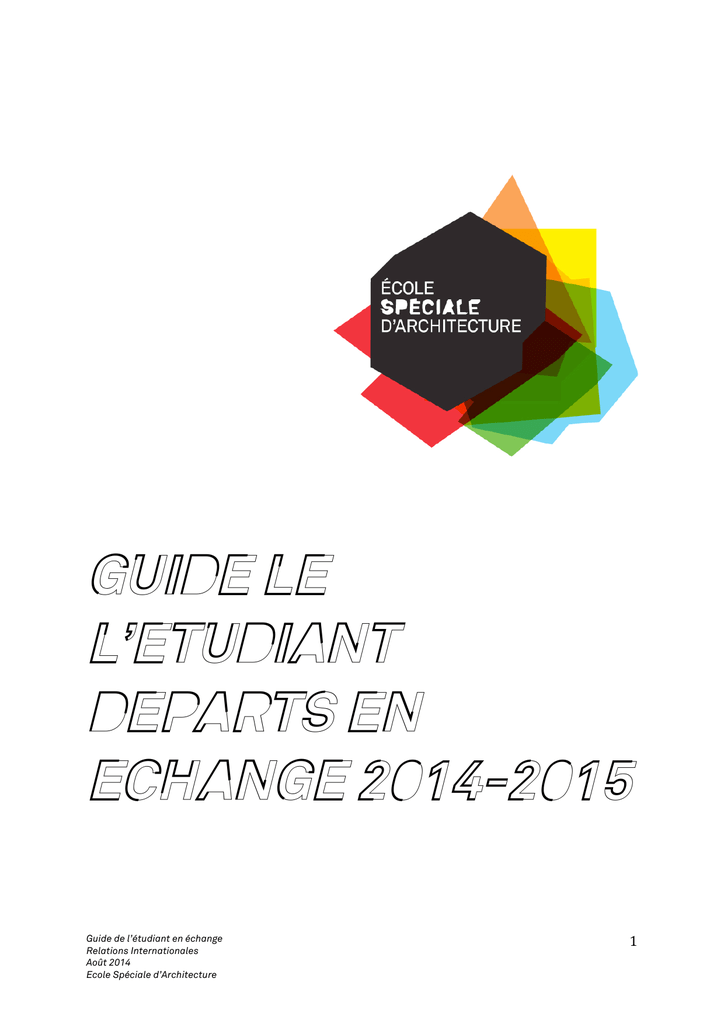 GUIDE LE L’ETUDIANT DEPARTS EN ECHANGE 2014-2015 Guide de l’étudiant en échange Relations Internationales Août 2014 Ecole Spéciale d’Architecture 1 SPECIALE ET INTERNATIONALE « S’ouvrir au monde pour une école d’architecture c’est ouvrir son enseignement au questionnement, à la critique, à l’écho d’un monde en mutations et d’un métier qui doit s’impliquer dans ces changements. Etudiants de 42 nationalités différentes, enseignants recrutés partout dans le monde, colloques, 3ème cycles internationaux, échanges sur les 5 continents sont autant de reflets de cette ouverture et de la diversité qui anime l’école. A travers ces projets, l’Ecole Spéciale souhaite que ses architectes, ses urbanistes, ses chercheurs en devenir, découvrent et questionnent une planète épuisée, « urbanisée », enfermée entre présent et passé et pour laquelle nous leur souhaitons d’inventer les réponses qui s’imposent. » Etudier à l’étranger Objectifs Les étudiants de l’école sont incités à effectuer un semestre dans l’une de nos universités ou écoles partenaires lors de leur deuxième semestre de Master. Ces séjours d’études se font dans un cadre réglementé (programme européen Socrate Erasmus ou convention bilatérale), qui permet à l’étudiant de valider les enseignements suivis à l’étranger dès lors que ceux-ci ont reçu la validation des instances de l’institution partenaire. L’objectif de ces échanges est pédagogique. Le semestre en échange n’est pas un semestre de coupure ou un plus, il fait parti à l’ESA, de votre formation et doit s’envisager comme tel. Le choix de partir et de votre destination doit donc s’appuyer sur des éléments tels que (liste non exhaustive) : -‐ le type d’enseignement donné au sein de l’école partenaire -‐ la complémentarité ou la particularité du programme du semestre d’échange par rapport au programme de l’ESA. -‐ votre projet de diplôme ou de post diplôme Guide de l’étudiant en échange Relations Internationales Août 2014 Ecole Spéciale d’Architecture 2 I Echanges dans l’Union Européenne Le programme ERASMUS Qu'est-ce que le programme Erasmus ? Erasmus contribue à la réalisation d'un espace européen de l'enseignement supérieur en poursuivant plusieurs objectifs opérationnels dont : * l'amélioration de la qualité et l'accroissement du volume de la mobilité étudiante et enseignante en Europe * L'amélioration de la qualité et l'accroissement du volume de la coopération multilatérale entre établissements d'enseignement supérieur (EES), et depuis 2007, entre établissements d'enseignement supérieur et entreprises * la transparence et la compatibilité des qualifications acquises dans l'enseignement supérieur et la formation professionnelle supérieure en Europe. Premier grand programme européen, Erasmus favorise les actions de mobilité en Europe pour les étudiants (périodes d'études ou de stage), le personnel enseignant (mission d'enseignement), ainsi que l'ensemble des personnels des établissements d'enseignement supérieur (périodes de formation). Erasmus facilite également la coopération entre établissements d'enseignement supérieur par l'élaboration de programmes intensifs, de réseaux et de projets multilatéraux. En France, aujourd'hui, la totalité des universités françaises participent à Erasmus ainsi que la plupart des établissements d'enseignement supérieur non universitaires. 1. Présentation du programme Erasmus Conditions de nationalité : Tout étudiant régulièrement inscrit dans un établissement d'un des pays participants/tout personnel employé par une structure d'un pays participant est éligible pour bénéficier du programme Erasmus . Tout étudiant qui entreprend un programme d'études dans une université partenaire (avec laquelle L’ESA a signé une convention bilatérale Erasmus) au titre du programme Erasmus bénéficie des conditions suivantes : - exonération des droits d’inscription dans l’université d'accueil (pour les cours, les examens, l’utilisation d’un laboratoire, l’accès à la bibliothèque, etc.). Toutefois l’université d'accueil peut demander que les étudiants prennent en charge les coûts d’assurance, d’adhésion à des syndicats d’étudiants et d’utilisation de matériels divers tels que photocopies, produits de laboratoire... sur la même base que celle des étudiants locaux. - l’étudiant conserve le paiement intégral des bourses et prêts nationaux et paye les droits d’inscription à son établissement d’origine - la période d'étude à l’étranger doit bénéficier d’une reconnaissance académique complète. En d’autres termes, l’université d’origine est disposée à reconnaître que la période d'études à l’étranger (y compris les examens ou autre forme d’évaluation) remplacera une période d'études comparable dans l’université d’origine même si le programme est différent. Guide de l’étudiant en échange Relations Internationales Août 2014 Ecole Spéciale d’Architecture 3 Les universités partenaires et l’étudiant doivent convenir d’un programme d'études avant le départ de celui-ci à l’étranger. A la fin de la période d'étude à l’étranger, l’université d'accueil doit fournir à l’étudiant visiteur et à l’université d’origine un certificat qui confirme que le programme convenu a été suivi, ainsi qu’un relevé de notes. Erasmus : Stage Le programme Erasmus /Stage propose de financer des stages dans 31 pays d’Europe. Pour monter son dossier et postuler à un stage Erasmus, il faut : - avoir au minimum deux années d’enseignement supérieur, - avoir la nationalité d'un des 27 états de l'UE (ou Islande, Liechtenstein, Norvège ou Turquie); - partir au minimum 3 mois en stage - que le stage soit un stage obligatoire crédité d’ECTS L'étudiant déclare ne bénéficier, pour la