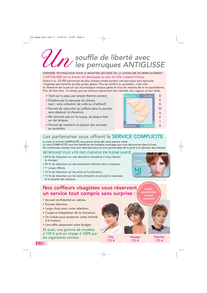 20 pages pour couv 3 31/05/10 Un 14:58 Page 2 souffle de liberté avec les perruques ANTIGLISSE DERNIÈRE TECHNOLOGIE POUR LE MAINTIEN SÉCURISÉ DE LA CHEVELURE DE REMPLACEMENT : L'ANTIGLISSE est un brevet NJ développé au sein du Pôle Création France. Grâce à lui, 35 000 personnes de plus chaque année portent une perruque sans éprouver l'angoisse permanente qu'elle puisse glisser. Plus de confort au quotidien, c'est vital : la chevelure est la parure qui accompagne chaque geste et tous les instants de la vie quotidienne. Plus de bien-être : le temps que les cheveux reprennent leur densité, leur vigueur et leur éclat. • Tient sur la peau par simple thermo-contact, Sécurité Confort Douceur Liberté D E R M A F I X • N'altère pas la repousse du cheveu (sain : sans utilisation de colle ou d'adhésif), • Permet de retoucher sa coiffure dans la journée, sans déplacer la chevelure, • Ne remonte pas sur la nuque, se plaque bien sur les tempes, • Permet de maintenir la plupart des activités au quotidien. Les partenaires vous offrent le SERVICE COMPLICITE La carte et le livret COMPLICITÉ vous seront remis dès votre premier achat. La carte COMPLICITÉ vous fera bénéficier de multiples avantages que vous découvrirez dans le livret. De nombreuses remises vous sont réservées pour un suivi personnalisé de la perte à la repousse des cheveux. RETROUVEZ PLUS VITE DES CHEVEUX EN PLEINE SANTÉ. ut c COUPE, ADAPTATION & SUIVI GRATUITS p om ris ! FAIT to A FORF IT tout c Voyage 125 € du City 125 € Prof ite z Accueil confidentiel en cabine, Écoute attentive, Large choix pour votre sélection, Coupe et Adaptation de la chevelure, Un turban pour préserver votre intimité à la maison, • Une offre respectant votre budget. 2 FO R ris ! • • • • • Et aussi, une gamme de modèles à 125 € pris en charge à 100% par les organismes sociaux. du p om Nos coiffeurs visagistes vous réservent un service tout compris sans surprise : Prof ite z • 30 % de réduction sur une deuxième chevelure si vous désirez la changer, • 30 % de réduction sur des extensions Volume et/ou Longueur, • 1re coupe offerte, • 15 % de réduction sur les soins et la coloration, • 15 % de réduction sur les soins stimulant et activant la repousse et la beauté des cheveux. Paprika 125 € 20 pages pour couv 3 31/05/10 14:58 Page 3 Jill Concept D Nouvelle fibre, découvrez ses avantages en page 6 Solweg Concept C Nos modèles existent dans des coloris nombreux et variés. 3 3 20 pages pour couv 3 31/05/10 14:58 Page 4 Elisabeth Concept D Veronique Concept D 4 Emeraude Concept D Trois classiques au montage hyper confortable. 20 pages pour couv 3 31/05/10 14:58 Page 5 City Paprika Concept A Edwige Concept C+ Concept A Lea Concept C+ 5 20 pages pour couv 3 31/05/10 14:59 Page 6 LES AVANTAGES DE LA FIBRE Pré-coiffée, coloris stable et entretien facile. Les atouts du cheveu Retrouvez une vraie sensation cheveu en réalisant votre shampoing à température du bain. Changer de coiffure c’est possible, recréer un look avec les rouleaux chauffants ou un fer à friser (température moyenne). C’est ça la fibre EASY BRUSH Sally Adelaide Concept A Concept A Fidji Concept A Point sommet mono 6 20 pages pour couv 3 31/05/10 14:59 Page 7 Toute la collection à découvrir en pages 18 et 19 92 coiffures en styles différents. Linda Concept C Très prochainement ce nouveau style glamour. Jasmin Concept C 7 20 pages pour couv 3 31/05/10 14:59 Page 8 CÔTÉ 100% CHEVEUX, PLUS PRÈS DU NATUREL Papyrus Concept C Seringa Concept D 8 Hevea Concept D Hevea Version recoupée Concept D Version recoupée 20 pages pour couv 3 31/05/10 14:59 Page 9 Cybille Concept D Un carré féminin Une coiffure dégradée le flou naturel 9 20 pages pour couv 3 31/05/10 14:59 Page 10 Karina Concept AC+ Sveltana Concept C , Mod in Concept C Wendy Concept C Milly Concept C 10 Valeriane Concept C 20 pages pour couv 3 31/05/10 14:59 Page 11 Flower Concept D Joe Concept AC+ Karly Concept C+ Carole Concept C Paule Concept C Berenice Concept C 11 20 pages pour couv 3 31/05/10 14:59 Page 12 Clara Concept B Eleonore Concept B Astrid Concept B Les Ultra LIGHT moins de 40 grammes 12 20 pages pour couv 3 31/05/10 14:59 Page 13 Barbara Concept C Emilia Concept C Maya Concept C Zazie Concept A 13 20 pages pour couv 3 31/05/10 14:59 Page 14 Maddy Elodia Concept C Concept A Voyage Concept A Concept A 14 20 pages pour couv 3 31/05/10 14:59 Page 15 Changez de Look ! Linotte Concept A Picadilly Concept A Nera Concept A Thaya Concept A 15 20 pages pour couv 3 31/05/10 14:59 Page 16 Stella Concept A Adeline Concept A Capucine Concept C 16 20 pages pour couv 3 31/05/10 14:59 Page 17 Les tons unis du brun au blond foncé Noir Exp. C1 2/4 Exp. C2 4/6 Exp. C3 6/8 Exp. C4 8 Exp. C5 10 Exp. C10 12 Exp. C14 8/33-27T Exp. C5D 8/135 Exp. C9 8A/12 Exp. C6 8A/14/26 Exp. C7 10-14H Exp. C11 10-23T Exp. BC1 K Exp. LP2 14/26/27 &27/8 S8 Exp. B1 24-18T Exp. B4 30/15/25 Exp. B40 24-18T/234 Exp. B7 14/26 Exp. B10 les blonds dorés du foncé au clair les blonds méchés reflets cendrés 14 Exp. B3 234 Exp. B11 12/23 Exp. BC2 234/23A Exp. B13 23A/26 Exp. B18 22-24M Exp. B25 23A Exp. B19 88R Exp. B17 12-22H Exp. BC2A 17/101 Exp. BC4 14A/24 Exp. BC14 14A/24/23A Exp. BC6 22/24 & 24/14 Exp. BC5 24 Exp. BC15 24/23A Exp. BC16 24-60M Exp. BG1 6133 Exp. R3 33 Exp. R7 133/29 & 133 Exp. R4 BR3/5/L5 Exp. R22 33-32T/8 Exp. R8 33-32T Exp. R9 33-27T/135 & 33-27T Exp. R15 30/KN7 Exp. R19 W33/28 Exp. R23 33-32T/FL Exp. R5 24D 123 L29 Exp. R30 13H240 Exp. R25 40 Exp. G0 37 Exp. G1 44 Exp. G2 51 Exp. G5 56 Exp. G6 De l’auburn au roux vif et au cuivré clair 33-27T Exp. R13 24D 123T Exp. R28 38 Exp. G7 44/60A Exp. G4 E Exp. LP1 Des gris foncés au blanc 43 Exp. G10 H48-38-36 Exp. G21 101 Exp. BG2 37/38 S 56/60 Exp. G3 Des gris méchés ou dégradés 60 Exp. GB H56-58-36 Exp. G20 51-56-60H Exp. G13 56/60 Exp. G12 24/60 Exp. G14 44-51-56H Exp. G9 66 Coloris 20 pages pour couv 3 C