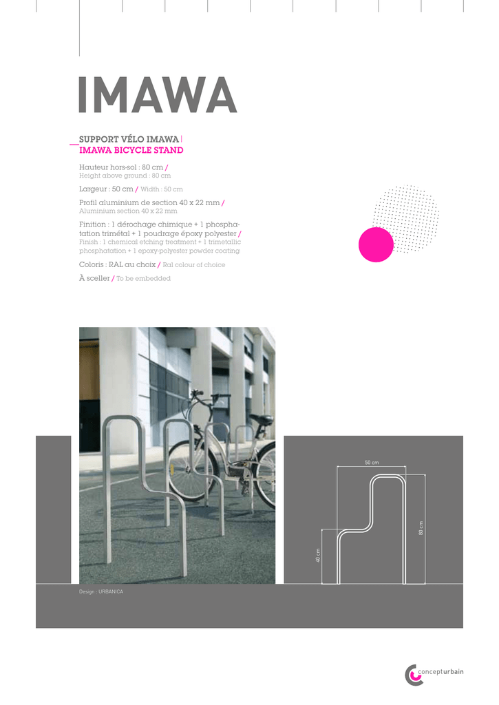imawa SUPPORT VÉLO IMAWA IMAWA BICYCLE STAND Hauteur hors-sol : 80 cm / Height above ground : 80 cm Largeur : 50 cm / Width : 50 cm Profil aluminium de section 40 x 22 mm / Aluminium section 40 x 22 mm Finition : 1 dérochage chimique + 1 phosphatation trimétal + 1 poudrage époxy polyester / Finish : 1 chemical etching treatment + 1 trimetallic phosphatation + 1 epoxy-polyester powder coating Coloris : RAL au choix / Ral colour of choice À sceller / To be embedded 40 cm 80 cm 110 cm 50 cm Design : Urbanica