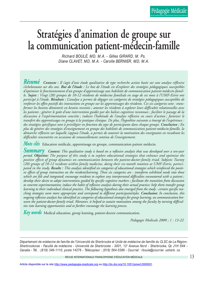 Pédagogie Médicale REVUE INTERNATIONALE FRANCOPHONE D’ÉDUCATION MÉDICALE Stratégies d’animation de groupe sur la communication patient-médecin-famille Richard BOULÉ, MD, M.A. - Gilles GIRARD, M. Ps. Diane CLAVET, MD, M.A. - Carolle BERNIER, MD, M.A. Résumé Contexte : Il s’agit d’une étude qualitative de type recherche action basée sur une analyse réflexive s’échelonnant sur dix ans. But de l’étude : Le but de l’étude est d’explorer des stratégies pédagogiques susceptibles d’optimiser le fonctionnement d’un groupe d’apprentissage aux habiletés de communication patient-médecin-famille. Sujets : Vingt (20) groupes de 10-12 résidents de médecine familiale en stage de six mois à l’UMF-Estrie ont participé à l’étude. Résultats : L’analyse a permis de dégager six catégories de stratégies pédagogiques susceptibles de renforcer les effets positifs des interactions en groupe sur les apprentissages des résidents. Ces six catégories sont : transformer les besoins démontrés en besoins ressentis ; amener les résidents à explorer leurs difficultés relationnelles avec les patients ; générer le goût d’une intervention guidée par des balises cognitives reconnues ; faciliter le passage de la discussion à l’expérimentation concrète ; induire l’habitude de l’analyse réflexive en cours d’action ; favoriser le transfert des apprentissages en groupe à la pratique clinique. De plus, l’hypothèse suivante a émergé de l’expérience : des stratégies spécifiques sont à privilégier en fonction du type de participants dans chaque groupe. Conclusion : En plus de générer des stratégies d’enseignement en groupe des habiletés de communication patient-médecin-famille, la démarche réflexive sur laquelle s’appuie l’étude, a permis de soutenir la motivation des enseignants en recadrant les difficultés rencontrées en occasions de renouvellement continu de l’enseignement. Mots clés Education médicale, apprentissage en groupe, communication patient médecin. Summary Context: This qualitative study is based on a reflexive analysis that was developed over a ten-year period. Objective: The purpose of this study is to explore educational strategies that enhance and optimize the positive effects of group dynamics on communication between the patient-doctor-family triad. Subjects: Twenty (20) groups of 10-12 residents within family medicine, doing their six-month rotation at UMF-Estrie, participated in the study. Results : This analysis identified six categories of educational strategies which reinforced the positive effects of group interaction on the residents’learning. These six categories are : transform exhibited needs into those which are felt and integrated; encourage residents to explore any interpersonal difficulties encountered with a patient ; develop their desire to adopt interventions guided by specific cognitive markers ; facilitate the transition from discussion to concrete experimentation; induce the habit of reflexive analysis during their actual practice; help them transfer group learning to their individual clinical practice. The following hypothesis also emerged from the study : certain specific teaching strategies seem more appropriate and correspond to different participants’styles. Conclusion: In conclusion, this ongoing reflexive analysis has identified six categories of educational strategies for group learning, on communication between the patient-doctor-family triad. Moreover, it helped to sustain motivation among the faculty by turning difficulties into learning opportunities and to further encourage the learning process. Key words Medical education, group learning, patient-doctor communication. Pedagogie Medicale 2000 ; 1 : 13-22. Département de médecine de famille de l’Université de Sherbrooke et Unité de médecine de famille du CLSC de La RégionSherbrookoise - Faculté de médecine - Université de Sherbrooke - 3001, 12e Avenue Nord - Sherbrooke, Qc J1H 5N4 Canada - Tél. : (819) 346-1110, poste 14276 - Télécopieur : (819) 564-5386 - Courriel : rboule@courrier. usherb. ca REVUE INTERNATIONALE FRANCOPHONE D’ÉDUCATION MÉDICALE Article disponible sur le site http://www.pedagogie-medicale.org ou http://dx.doi.org/10.1051/pmed:2000001 13 Recherche et Perspectives Introduction La communication efficace avec les patients a des impacts démontrés sur divers indicateurs de santé 1. Son apprentissage constitue un objectif important de la formation en médecine de famille. Des ateliers de formation à la communication avec les patients et leur famille, inspirés de l’approche systémique 2 et centrée sur le patient,3,4 sont offerts aux résidents de plusieurs programmes. La littérature en pédagogie médicale propose peu de modèles d’enseignement en petit groupe de résidents, privilégiant des descriptions d’enseignement au chevet du malade, en clinique externe et par modèle de rôle4. Côté et al5 ont récemment décrit la pertinence de divers éléments de cet enseignement basés sur des principes pédagogiques reconnus sans toutefois s’attarder au fonctionnement du groupe. Or, celui-ci influence le degré d’implication et l’apprentissage de ses membres. Le but de l’étude est d’explorer des stratégies pédagogiques susceptibles d’optimiser le fonctionnement d’un groupe d’apprentissage aux habiletés de communication patient-médecin-famille. La démarche réalisée s’inscrit dans les cadres de la recherche action et de l’analyse réflexive. Méthodologie Depuis dix ans, les animateurs d’ateliers hebdomadaires6, auxquels participent les dix à douze résidents en stage de six mois à l’Unité de médecine de famille de l’Estrie (UMF), s’impliquent dans une analyse réflexive, c’est-à-dire une autoévaluation et une restructuration continue en cours d’action de leurs stratégies pédagogiques7. Chaque atelier d’une durée de trois heure