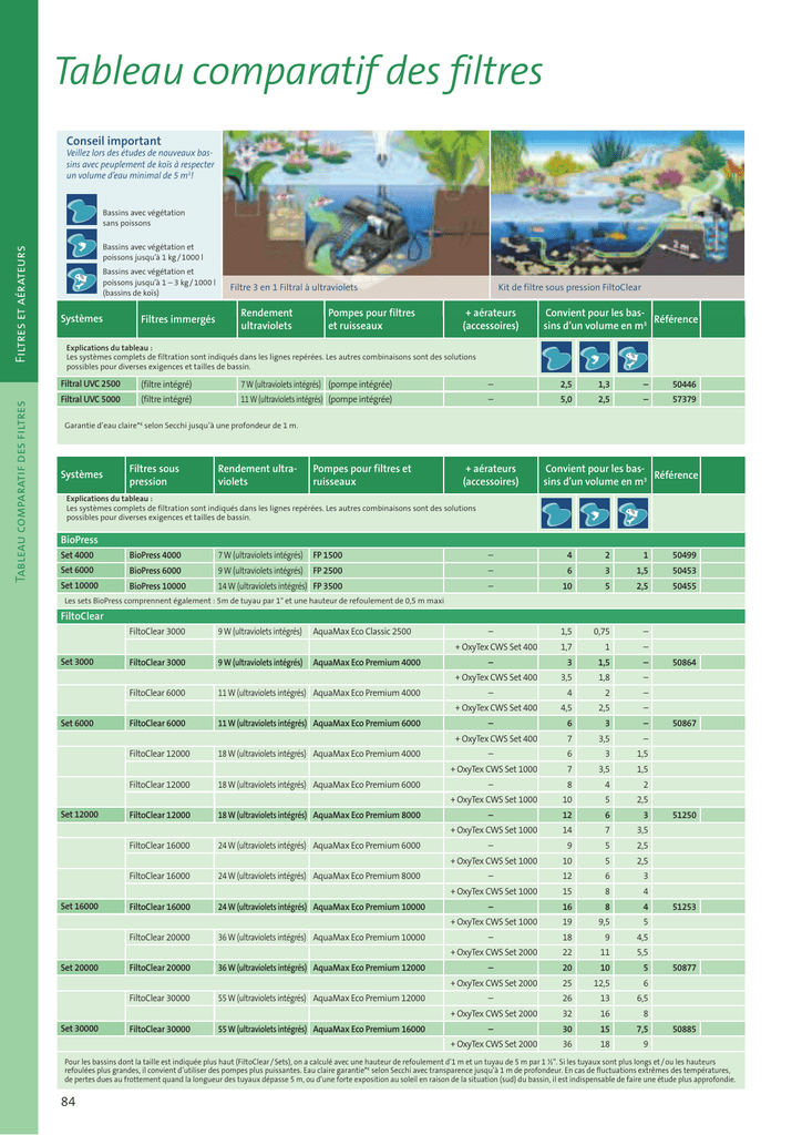 Tableau comparatif des filtres Conseil important Veillez lors des études de nouveaux bassins avec peuplement de koïs à respecter un volume d’eau minimal de 5 m3! TABLEAU COMPARATIF DES FILTRES FILTRES ET AÉRATEURS Bassins avec végétation sans poissons Bassins avec végétation et poissons jusqu’à 1 kg / 1000 l Bassins avec végétation et poissons jusqu’à 1 – 3 kg / 1000 l (bassins de koïs) Systèmes Filtres immergés Filtre 3 en 1 Filtral à ultraviolets Rendement ultraviolets Pompes pour filtres et ruisseaux Kit de filtre sous pression FiltoClear + aéra aérateurs teurs teu (accessoires) Convient pour les basRéférence Réfé sins d’un volume en m3 Explications du tableau : Les systèmes complets de filtration sont indiqués dans les lignes repérées. Les autres combinaisons sont des solutions possibles pour diverses exigences et tailles de bassin. Filtral UVC 2500 (filtre intégré) 7 W (ultraviolets intégrés) (pompe intégrée) – 2,5 1,3 – 50446 Filtral UVC 5000 (filtre intégré) 11 W (ultraviolets intégrés) (pompe intégrée) – 5,0 2,5 – 57379 Garantie d’eau claire*K selon Secchi jusqu’à une profondeur de 1 m. Systèmes Filtres sous pression Rendement ultraviolets Pompes pour filtres et ruisseaux + aérateurs (accessoires) Convient pour les basRéférence sins d’un volume en m3 Explications du tableau : Les systèmes complets de filtration sont indiqués dans les lignes repérées. Les autres combinaisons sont des solutions possibles pour diverses exigences et tailles de bassin. BioPress Set 4000 BioPress 4000 7 W (ultraviolets intégrés) FP 1500 – 4 2 1 50499 Set 6000 BioPress 6000 9 W (ultraviolets intégrés) FP 2500 – 6 3 1,5 50453 Set 10000 BioPress 10000 14 W (ultraviolets intégrés) FP 3500 – 10 5 2,5 50455 – 1,5 0,75 – 1,7 1 – 3 1,5 – 3,5 1,8 – Les sets BioPress comprennent également : 5m de tuyau par 1" et une hauteur de refoulement de 0,5 m maxi FiltoClear FiltoClear 3000 9 W (ultraviolets intégrés) AquaMax Eco Classic 2500 + OxyTex CWS Set 400 Set 3000 FiltoClear 3000 9 W (ultraviolets intégrés) AquaMax Eco Premium 4000 – + OxyTex CWS Set 400 FiltoClear 6000 11 W (ultraviolets intégrés) AquaMax Eco Premium 4000 – + OxyTex CWS Set 400 Set 6000 FiltoClear 6000 11 W (ultraviolets intégrés) AquaMax Eco Premium 6000 – + OxyTex CWS Set 400 FiltoClear 12000 18 W (ultraviolets intégrés) AquaMax Eco Premium 4000 – + OxyTex CWS Set 1000 FiltoClear 12000 18 W (ultraviolets intégrés) AquaMax Eco Premium 6000 – + OxyTex CWS Set 1000 Set 12000 FiltoClear 12000 18 W (ultraviolets intégrés) AquaMax Eco Premium 8000 – + OxyTex CWS Set 1000 FiltoClear 16000 24 W (ultraviolets intégrés) AquaMax Eco Premium 6000 – + OxyTex CWS Set 1000 FiltoClear 16000 24 W (ultraviolets intégrés) AquaMax Eco Premium 8000 – + OxyTex CWS Set 1000 Set 16000 FiltoClear 16000 24 W (ultraviolets intégrés) AquaMax Eco Premium 10000 – + OxyTex CWS Set 1000 FiltoClear 20000 36 W (ultraviolets intégrés) AquaMax Eco Premium 10000 – + OxyTex CWS Set 2000 Set 20000 FiltoClear 20000 36 W (ultraviolets intégrés) AquaMax Eco Premium 12000 – + OxyTex CWS Set 2000 FiltoClear 30000 55 W (ultraviolets intégrés) AquaMax Eco Premium 12000 – + OxyTex CWS Set 2000 Set 30000 FiltoClear 30000 55 W (ultraviolets intégrés) AquaMax Eco Premium 16000 – + OxyTex CWS Set 2000 4 2 – 4,5 2,5 – 6 3 – 7 3,5 – 6 3 1,5 7 3,5 1,5 8 4 2 10 5 2,5 12 6 3 14 7 3,5 9 5 2,5 10 5 2,5 12 6 3 15 8 4 16 8 4 19 9,5 5 18 9 4,5 22 11 5,5 20 10 5 25 12,5 6 26 13 6,5 32 16 8 30 15 7,5 36 18 9 50864 50867 51250 51253 50877 50885 Pour les bassins dont la taille est indiquée plus haut (FiltoClear / Sets), on a calculé avec une hauteur de refoulement d’1 m et un tuyau de 5 m par 1 ½“. Si les tuyaux sont plus longs et / ou les hauteurs refoulées plus grandes, il convient d’utiliser des pompes plus puissantes. Eau claire garantie*K selon Secchi avec transparence jusqu’à 1 m de profondeur. En cas de fluctuations extrêmes des températures, de pertes dues au frottement quand la longueur des tuyaux dépasse 5 m, ou d’une forte exposition au soleil en raison de la situation (sud) du bassin, il est indispensable de faire une étude plus approfondie. 84 PROFICLEAR PREMIUM Voir tous les détails à partir de la page 114 Filtre gravitaire BioSmart Systèmes Filtres gravitaires Appareil à ultraviolets Pompes pour filtres Rendement ultraviolets et ruisseaux FILTRES ET AÉRATEURS • Système idéal pour les bassins de koïs, les bassins de baignade et autres plans d’eau de grande envergure • Nouveau système modulaire de filtration pour une qualité professionnelle de l’eau • Système intelligent d’autonettoyage et d’autocontrôle Filtres gravitaires FiltoMatic CWS + aérateurs (accessoires) Convient pour les basRéférence sins d’un volume en m3 Explications du tableau : Les systèmes complets de filtration sont indiqués dans les lignes repérées. Les autres combinaisons sont des solutions possibles pour diverses exigences et tailles de bassin. BioSmart 5000 7 W (ultraviolets intégrés) FP 1500 – 5 2,5 1,3 50525 Set 7000 BioSmart 7000 9 W (ultraviolets intégrés) FP 2500 – 7 3,5 1,7 50449 Set 14000 BioSmart 14000 11 W (ultraviolets intégrés) FP 3500 – 14 7 3,5 50451 BioSmart UVC 16000 11 W (ultraviolets intégrés) AquaMax Eco Classic 2500 – 8 4 2 BioSmart UVC 16000 11 W (ultraviolets intégrés) AquaMax Eco Classic 3500 – 12 6 3 BioSmart UVC 16000 11 W (ultraviolets intégrés) AquaMax Eco Classic 5500 – 16 8 4 BioSmart 30000 Bitron C 24 W AquaMax Eco Classic 3500 – 14 7 3,5 BioSmart 30000 Bitron C 24 W AquaMax Eco Classic 5500 – 20 10 5 BioSmart 30000 Bitron C 36 W AquaMax Eco Classic 5500 – 24 12 6 Set 20000 BioSmart 20000 18 W (ultraviolets intégrés) AquaMax Eco Classic 5500 – 20 10 5 51238 Set 30000 BioSmart 30000 36 W (ultraviolets intégrés) AquaMax Eco Classic 8500 – 30 15 7,5 51240 TA