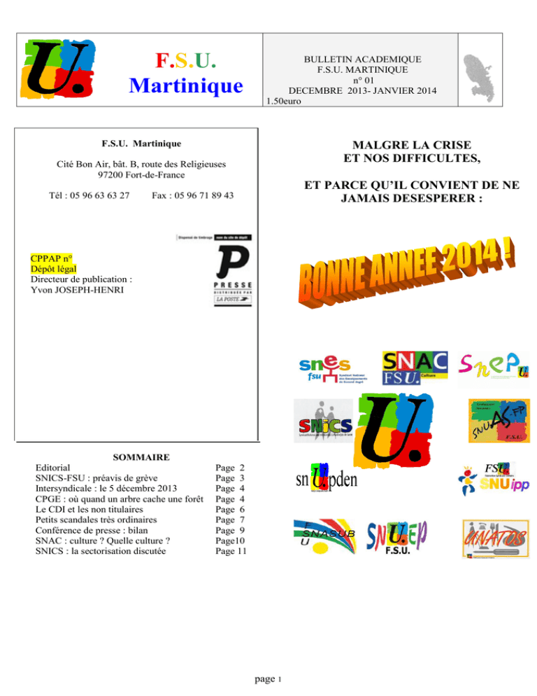 F.S.U. Martinique BULLETIN ACADEMIQUE F.S.U. MARTINIQUE n° 01 DECEMBRE 2013- JANVIER 2014 1.50euro F.S.U. Martinique MALGRE LA CRISE ET NOS DIFFICULTES, Cité Bon Air, bât. B, route des Religieuses 97200 Fort-de-France Tél : 05 96 63 63 27 ET PARCE QU’IL CONVIENT DE NE JAMAIS DESESPERER : Fax : 05 96 71 89 43 CPPAP n° Dépôt légal Directeur de publication : Yvon JOSEPH-HENRI SOMMAIRE Editorial SNICS-FSU : préavis de grève Intersyndicale : le 5 décembre 2013 CPGE : où quand un arbre cache une forêt Le CDI et les non titulaires Petits scandales très ordinaires Conférence de presse : bilan SNAC : culture ? Quelle culture ? SNICS : la sectorisation discutée Page 2 Page 3 Page 4 Page 4 Page 6 Page 7 Page 9 Page10 Page 11 page 1 Certes, nous disposons d’outils d’analyse de la situation particulièrement complets et pertinents en commissions techniques ou paritaires, certes cela permet à certains chefs de paraître dominer la situation de l’école dans l’île, mais cela ne saurait nous impressionner. Nous savons bien la part de vent de tout cela, et le fait qu’il s’agisse de faire croire à Paris, que l’académie fonctionne grâce à qui vous savez… EDITORIAL Faut-il le dire, rien ne va plus au rectorat ! Depuis quelques années, nous assistons à des mesures sans précédent au rectorat qui aboutissent à désorganiser les services, à faire que plus rien ne fonctionne. A qui profite la situation ? Or, ce qui compte bien plutôt par exemple est que ce qui doit fonctionner… fonctionne ! Ainsi avons-nous le sentiment que le rectorat se fourvoie dans l’incompétence. La faute à qui ? Aux déplacements de personnels, aux promotions des uns, aux mises au placard des autres. Avec pour conséquence que le savoir, le savoir-faire a disparu. Le bilan de la mandature du recteur SIGANOS est, en effet, plus qu’en demi-teinte : des effets d’annonce, mais peu de concret sinon pour faire passer les pilules amères des suppressions de postes et de baisse du budget. Parallèlement, il a laissé la bride sur le cou au secrétaire général notamment, laissant entendre que ce n’était pas sa fonction que de gérer disons les affaires courantes! A lui les grands projets, les relations avec les grands corps institutionnels, à chacun, à la place qu’il occupe, de faire son travail, et bien. De là des colères mémorables contre ceux qui échouaient dans cette tâche. Allez réclamer un CDI ! On vous promène en vous renvoyant d’abord vers un autre interlocuteur que l’habituel. On vous donne un calcul qui ne correspond en rien à celui que vous avez pu faire, mais surtout qui repose sur une connaissance erronée de la loi. Toutefois pas d’inquiétude, votre cas est bon, vous serez « Cdisé » bientôt, patience ! les services sont débordés. Et lorsque le temps passe, on vous indique que non, vous n’avez pas droit à un Cdi parce que vous n’aviez pas la quotité de service suffisante, en s’appuyant sur un texte de loi erroné ! En confondant la titularisation des contractuels et leur « cdisation ». Le résultat : après avoir vainement tenté d’éviter les paperasses du tribunal administratif, la FSU vous y aidera car entretemps vous avez perdu la possibilité – qui était un droit – de vous inscrire au concours réservé. Le problème est que, syndicalement, nous avons manqué d’arbitre lorsque surgissaient des conflits avec tel ou tel service, tel ou tel individu. Difficile aussi dans de telles conditions de silence, d’opacité, de comprendre le sens de la politique menée par le rectorat, si tant est qu’elle ait un sens. On a plutôt eu l’impression d’une navigation à vue et d’un louvoiement permanent pour parer les attaques les plus violentes. En même temps, et malgré une politique menée et par Paris sur les suppressions de postes et l’étouffement de notre académie par des restrictions budgétaires, et par le secrétaire général concernant la redistribution des tâches et fonctions dans les services, le recteur a mis le doigt sur les problèmes les plus forts de notre école, en Martinique : le problème du transport scolaire et son corollaire de l’étendue colossale de la journée de classe, la défaillance lamentable de l’informatique dans notre île, le bâti en piteux état, la baisse inquiétante pour nos métiers et l’avenir du pays du nombre d’enfants scolarisés. Vous en voulez d’autres ? Ce courrier du ministère qui donne une volée de bois vert au secrétaire général pour avoir malmené le droit en tentant de mettre à la retraite d’office une collègue dont on voulait se débarrasser et pour laquelle on a demandé une expertise et un passage en commission médicale pour statuer sur son état. Or l’expert était juge et partie puisqu’il avait été pris au sein même de la commission. Sait-on qu’un collègue contractuel en CDI a – grâce à l’appui du SNES – obtenu de haute lutte devant le Tribunal administratif que son licenciement scandaleux soit annulé et qu’il soit réintégré ? Mais sait-on que ce collègue est aujourd’hui placé dans un placard ? Il est certes payé, mais sans poste, sans activité. La nouvelle rectrice que nous avons rencontrée, en audience FSU à notre demande, nous paraît bien peu aguerrie aux problèmes de l’Education d’une part et de la Martinique d’autre part. Cela fait la part belle aux tripatouillages au cœur des services et aux déplacements peut-être plus liés à des besoins de réseaux qu’a une volonté de performance. Or ce genre de mise au placard tend à se généraliser et cela même est intolérable. Nous avons dénoncé dans la presse – sans que cela émeuve qui que ce soit au rectorat – la situation des élèves les plus fragiles, les plus difficiles aussi (enfants en situation de handicap, enfants des classes relais). On assiste, à la mainmise de l’incompétence, avec des individus qui, au mépris des fonctionnements d