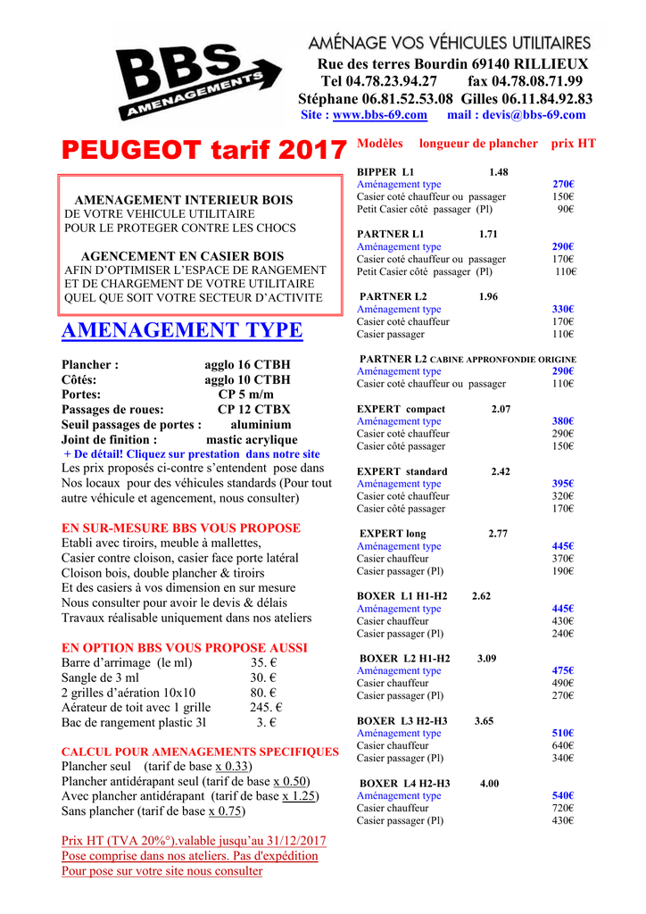 Rue des terres Bourdin 69140 RILLIEUX Tel 04.78.23.94.27 fax 04.78.08.71.99 Stéphanewww.bbs-69.com 06.81.52.53.08 [email protected] Gilles 06.11.84.92.83 Site : www.bbs-69.com PEUGEOT tarif 2017 AMENAGEMENT INTERIEUR BOIS DE VOTRE VEHICULE UTILITAIRE POUR LE PROTEGER CONTRE LES CHOCS AGENCEMENT EN CASIER BOIS AFIN D’OPTIMISER L’ESPACE DE RANGEMENT ET DE CHARGEMENT DE VOTRE UTILITAIRE QUEL QUE SOIT VOTRE SECTEUR D’ACTIVITE AMENAGEMENT TYPE Plancher : agglo 16 CTBH Côtés: agglo 10 CTBH Portes: CP 5 m/m Passages de roues: CP 12 CTBX Seuil passages de portes : aluminium Joint de finition : mastic acrylique + De détail! Cliquez sur prestation dans notre site Les prix proposés ci-contre s’entendent pose dans Nos locaux pour des véhicules standards (Pour tout autre véhicule et agencement, nous consulter) EN SUR-MESURE BBS VOUS PROPOSE Etabli avec tiroirs, meuble à mallettes, Casier contre cloison, casier face porte latéral Cloison bois, double plancher & tiroirs Et des casiers à vos dimension en sur mesure Nous consulter pour avoir le devis & délais Travaux réalisable uniquement dans nos ateliers EN OPTION BBS VOUS PROPOSE AUSSI Barre d’arrimage (le ml) 35. € Sangle de 3 ml 30. € 2 grilles d’aération 10x10 80. € Aérateur de toit avec 1 grille 245. € Bac de rangement plastic 3l 3. € CALCUL POUR AMENAGEMENTS SPECIFIQUES Plancher seul (tarif de base x 0.33) Plancher antidérapant seul (tarif de base x 0.50) Avec plancher antidérapant (tarif de base x 1.25) Sans plancher (tarif de base x 0.75) Prix HT (TVA 20%°).valable jusqu’au 31/12/2017 Pose comprise dans nos ateliers. Pas d'expédition Pour pose sur votre site nous consulter Modèles mail : [email protected] longueur de plancher prix HT BIPPER L1 1.48 Aménagement type Casier coté chauffeur ou passager Petit Casier côté passager (Pl) 270€ 150€ 90€ PARTNER L1 1.71 Aménagement type Casier coté chauffeur ou passager Petit Casier côté passager (Pl) 290€ 170€ 110€ PARTNER L2 Aménagement type Casier coté chauffeur Casier passager 330€ 170€ 110€ 1.96 PARTNER L2 CABINE APPRONFONDIE ORIGINE Aménagement type 290€ Casier coté chauffeur ou passager 110€ EXPERT compact Aménagement type Casier coté chauffeur Casier côté passager 2.07 EXPERT standard Aménagement type Casier coté chauffeur Casier côté passager 2.42 EXPERT long Aménagement type Casier chauffeur Casier passager (Pl) 2.77 BOXER L1 H1-H2 Aménagement type Casier chauffeur Casier passager (Pl) 380€ 290€ 150€ 395€ 320€ 170€ 445€ 370€ 190€ 2.62 445€ 430€ 240€ BOXER L2 H1-H2 Aménagement type Casier chauffeur Casier passager (Pl) 3.09 BOXER L3 H2-H3 Aménagement type Casier chauffeur Casier passager (Pl) 3.65 BOXER L4 H2-H3 Aménagement type Casier chauffeur Casier passager (Pl) 475€ 490€ 270€ 510€ 640€ 340€ 4.00 540€ 720€ 430€