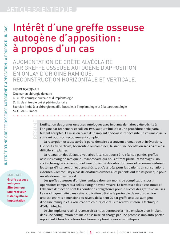 SCIENTIFIQUE Intérêt d’une greffe osseuse autogène d’apposition : à propos d’un cas Augmentation de crête alvéolaire par greffe osseuse autogène d’apposition en onlay d’origine ramique. Reconstruction horizontale et verticale. Henri Tordjman Docteur en chirurgie dentaire D. U. de chirurgie buccale et d’implantologie D. U. de chirurgie pré et péri-implantaire Exercice limité à la chirurgie maxillo-buccale, à l’implantologie et à la parodontologie MEULAN – France ............................... Résumé Intérêt d’une greffe osseuse autogène d’apposition : à propos d’un cas ARTICLE SCIENTIFIQUE ARTICLE Mots clés Greffe osseuse autogène Site donneur Site receveur Ostéosynthèse Implantation L’utilisation des greffes osseuses autologues avec implants dentaires a été décrite à l’origine par Branemark et coll. en 1975; aujourd’hui, c’est une procédure orale parfai tement acceptée. La mise en place d’un implant endo-osseux nécessite un volume osseux suffisant pour son recouvrement complet. La résorption osseuse après la perte dentaire est souvent dramatique et irréversible. Elle peut être verticale, horizontale ou combinée, laissant une édentation sans os et ainsi difficile à implanter. La réparation des défauts alvéolaires localisés pourra être réalisée par des greffes osseuses d’origine ramique ou symphysaire qui nous offrent plusieurs avantages : un accès chirurgical conventionnel, une proximité des sites donneurs et receveurs réduisant les temps d’intervention et d’anesthésie, et c’est idéal pour les patients en consultations externes. Comme il n’y a pas de cicatrices cutanées, les patients ont moins peur que pour un site donneur extraoral. Les greffes osseuses d’origine ramique donnent moins de complications post opératoires comparées à celles d’origine symphysaire. La fermeture des tissus mous et l’absence d’infection sont les conditions obligatoires pour le succès des greffes osseuses. Le cas clinique traité dans cette publication détaille le protocole de reconstruction osseuse en trois dimensions au niveau de la dent 25 par greffe osseuse autogène d’origine ramique et la voie d’abord chirurgicale du site receveur selon la technique d’Edlan Mejchar. Le site implantaire ainsi reconstruit va nous permettre la mise en place d’un implant dans une configuration optimale et sa mise en charge par une prothèse implanto-portée répondant à tous les critères fonctionnels, phonétiques et esthétiques. JOURNAl de l’ordre des dentistes du québec | 6| volume 47 N o 5 | octobre / novembre 2010 I INTRAORAL AUTOGENOUS BLOCK ONLAY BONE GRAFTING FOR ALVEOLAR RIDGE AUGMENTATION The use of autogenous bone grafts with dental implants was originally described by Branemark et al. in 1975, and today is a well accepted procedure in oral rehabilitation. Insertion of an endosseous implant requires sufficient bone volume for complete bone coverage. Bone resorption after tooth loss can be vertical, horizontal or combined, leaving the area with a bony defect. It is often dramatic and irreversible. In the repair of more localized alveolar defects, bone grafts from the symphysis and ramus present several advantages: conventional surgical access, proximity of donor and recipient sites reduces operation and anesthesia time, and ideal for outpatient implant surgery. Since there is no cutaneous scar, patients are less apprehensive than with extra oral locations. Good bone quality in the ramus means fewer postoperative complications compared with the symphysis area. Primary soft tissue closure and absence of infection are mandatory conditions for successful grafting procedures. ntroduction L’objectif du traitement implantaire est de préserver la santé de nos patients, d’obtenir des implants durables au moyen de l’ostéo intégration et de restaurer la fonction et l’esthétique au moyen de prothèses supra-implantaires. Le succès d’une réhabilitation implantoprothétique est conditionné par le positionnement optimal de l’implant en termes de situation, d’axe et d’émergence. Une des conditions nécessaires est le volume et la qualité osseuse du site implantaire. Malheureusement, nous l’avons tous constaté dans notre exercice quotidien, nous sommes de plus en plus confrontés à des situations de résorption de l’os alvéolaire (pour des raisons diverses) accompagnant la perte de l’organe dentaire. Le volume osseux résiduel ne permet pas de poser l’indication implantaire soit par manque d’épaisseur, soit par absence de hauteur. La reconstruction d’un volume osseux crestal suffisant pourra être réalisée par une greffe osseuse autogène d’apposition en onlay afin de permettre la mise en place d’implants endoosseux et de répondre aux impératifs esthétiques, phonétiques et fonctionnels1, 2. Nous disposons pour ces greffes des sites donneurs intraoraux (le maxillaire et la mandibule) et extraoraux (le pariétal, l’os iliaque). Le maxillaire et la mandibule sont des sites donneurs à proximité des sites receveurs et présentent la possibilité de prélever sous anesthésie locale, ce qui rassure le patient. Le choix du site de prélèvement se fait en considérant le volume, la forme et la localisation sur l’arcade du déficit osseux. Le volume osseux disponible au niveau du site donneur pressenti et la capacité du greffon à résister aux phénomènes de résorption vont guider le praticien dans sa décision thérapeutique. L’objectif de cette publication est de mettre à la disposition du thérapeute un protocole de greffe osseuse autogène reproductible afin de réparer un déficit osseux de faible étendue et de permettre une réhabilitation par une prothèse fixe implantoportée. JOURNAl de l’ordre des dentistes du québec | 7| volume 47 N o 5 | octobre / novembre 2010 Intérêt d’une greffe osseuse autogène d’apposition : à propos d’un cas ABSTR