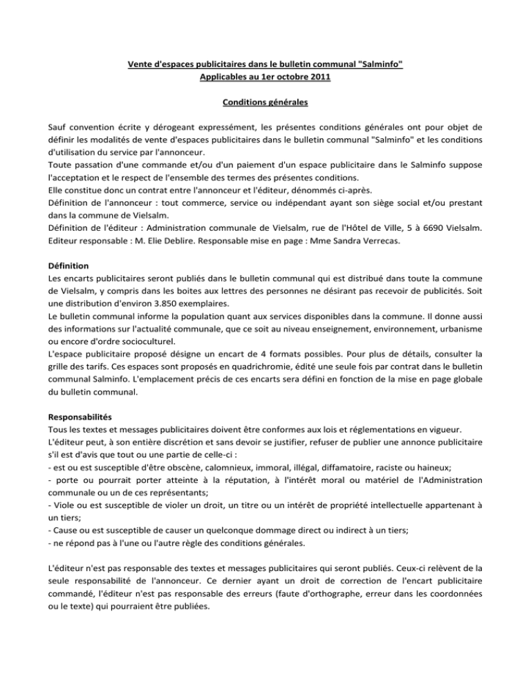 Vente d'espaces publicitaires dans le bulletin communal "Salminfo" Applicables au 1er octobre 2011 Conditions générales Sauf convention écrite y dérogeant expressément, les présentes conditions générales ont pour objet de définir les modalités de vente d'espaces publicitaires dans le bulletin communal "Salminfo" et les conditions d'utilisation du service par l'annonceur. Toute passation d'une commande et/ou d'un paiement d'un espace publicitaire dans le Salminfo suppose l'acceptation et le respect de l'ensemble des termes des présentes conditions. Elle constitue donc un contrat entre l'annonceur et l'éditeur, dénommés ci-après. Définition de l'annonceur : tout commerce, service ou indépendant ayant son siège social et/ou prestant dans la commune de Vielsalm. Définition de l'éditeur : Administration communale de Vielsalm, rue de l'Hôtel de Ville, 5 à 6690 Vielsalm. Editeur responsable : M. Elie Deblire. Responsable mise en page : Mme Sandra Verrecas. Définition Les encarts publicitaires seront publiés dans le bulletin communal qui est distribué dans toute la commune de Vielsalm, y compris dans les boites aux lettres des personnes ne désirant pas recevoir de publicités. Soit une distribution d'environ 3.850 exemplaires. Le bulletin communal informe la population quant aux services disponibles dans la commune. Il donne aussi des informations sur l'actualité communale, que ce soit au niveau enseignement, environnement, urbanisme ou encore d'ordre socioculturel. L'espace publicitaire proposé désigne un encart de 4 formats possibles. Pour plus de détails, consulter la grille des tarifs. Ces espaces sont proposés en quadrichromie, édité une seule fois par contrat dans le bulletin communal Salminfo. L'emplacement précis de ces encarts sera défini en fonction de la mise en page globale du bulletin communal. Responsabilités Tous les textes et messages publicitaires doivent être conformes aux lois et réglementations en vigueur. L'éditeur peut, à son entière discrétion et sans devoir se justifier, refuser de publier une annonce publicitaire s'il est d'avis que tout ou une partie de celle-ci : - est ou est susceptible d'être obscène, calomnieux, immoral, illégal, diffamatoire, raciste ou haineux; - porte ou pourrait porter atteinte à la réputation, à l'intérêt moral ou matériel de l'Administration communale ou un de ces représentants; - Viole ou est susceptible de violer un droit, un titre ou un intérêt de propriété intellectuelle appartenant à un tiers; - Cause ou est susceptible de causer un quelconque dommage direct ou indirect à un tiers; - ne répond pas à l'une ou l'autre règle des conditions générales. L'éditeur n'est pas responsable des textes et messages publicitaires qui seront publiés. Ceux-ci relèvent de la seule responsabilité de l'annonceur. Ce dernier ayant un droit de correction de l'encart publicitaire commandé, l'éditeur n'est pas responsable des erreurs (faute d'orthographe, erreur dans les coordonnées ou le texte) qui pourraient être publiées. Offre de vente Les encarts publicitaires peuvent être réalisés selon deux manières différentes : - Soit l'annonceur possède déjà une mise en page existante. Dans ce cas, celle-ci sera adaptée au format désiré, avec vérification et modification possible. dans ce cas, un délai de 4 semaines avant la parution du Salminfo sera respecté pour l'envoi des éléments graphiques nécessaires à la composition de l'encart publicitaire. - Soit l'annonceur laisse à la personne responsable de la mise en page le soin de réaliser un encart. Auquel cas, l'annonceur sera tenu de lui fournir logo, photo et textes 6 semaines (dans un premier temps)avant la date de parution du Salminfo. Une soumission de projet sera proposée à l'annonceur. Celui-ci peut bien-sûr demander des modifications ou corrections, dans les limites du possible. En cas d'absence de réaction de l'annonceur dans les 7 jours ouvrables, l'éditeur considère que l'annonce est acceptée telle quelle. Le matériel publicitaire devra être transmis par e-mail ou par support informatique. L'éditeur n'engage pas sa responsabilité quant à la qualité d'une annonce dont les logos et photos seraient transmis sur papier. L'éditeur ne peut en aucun cas imposer un style graphique ou de mise en page. Il peut néanmoins soumettre son avis à l'annonceur si le graphisme présente des incohérences. L'éditeur est tenu de présenter au moins une fois un projet d'encart publicitaire à l'annonceur avant validation. L'éditeur a le libre choix de l'emplacement de l'encart publicitaire. Commande L'annonceur confirme sa commande d'espace publicitaire en complétant le bon de commande remis par l'éditeur. Seul ce bon de commande dûment signé et daté fera office de demande du service. Tarifs 1/8 de page (92 x 63 mm) : 60 € 1/4 de page (92 x 130 mm) : 140 € 1/3 de page* (190 x 86 mm) : 200 € 1/2 page (190 x 130 mm) : 280 € Page entière : tarif sur demande * uniquement lorsque la mise en page le permet Ces tarifs s'entendent hors TVA. Ils sont révisables annuellement et de manière plus sporadique durant une période de lancement de 6 mois du système de vente d'encarts publicitaires. Délai L'éditeur est tenu de fournir aux annonceurs les dates de parution du Salminfo 8 semaines avant la parution de celui-ci. L'annonceur devra fournir le matériel nécessaire (voir "offre de vente") à la mise en page de son annonce 6 semaines avant la parution du Salminfo. Ce délai est néanmoins à réviser pour les éditions futures. L'espace prévu pour ces encarts publicitaires est limité à 4 pages au format A4. La règle du premier payeur = premier servi est d'application. Autrement dit, les annonceurs qui seront les premiers à passer commande et à payer leur espace publicitaire seront les premiers à pouvoir en bénéficier. L'éditeur ne peut donc garantir qu'un paiement fera garantie de publication. Dans le c