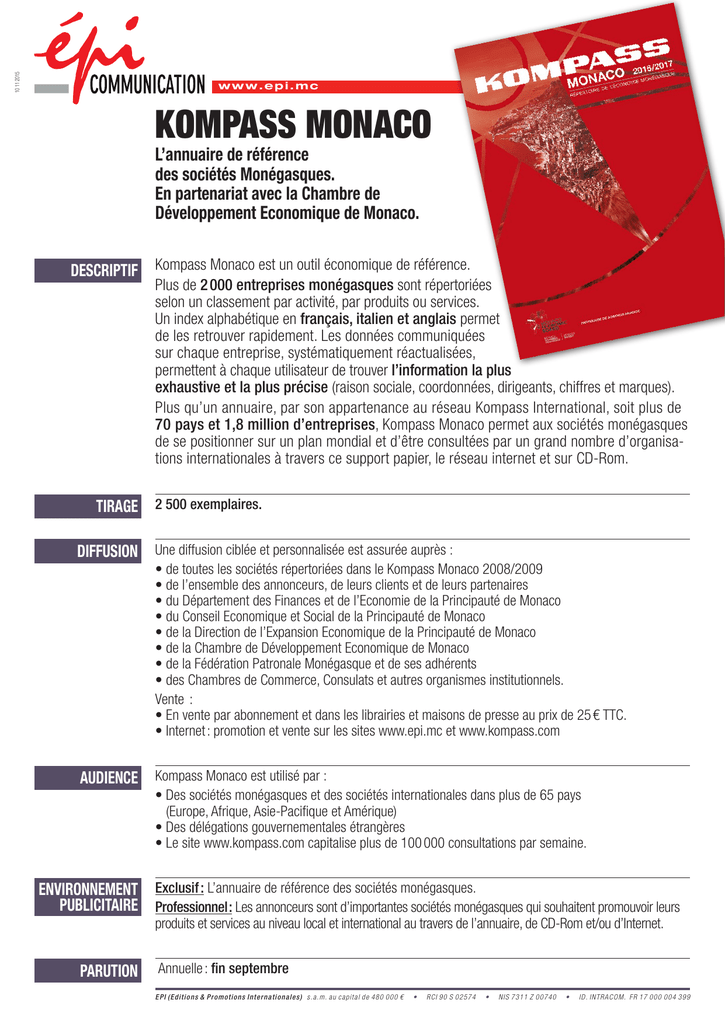 10 11 2015 www.epi.mc Kompass Monaco L’annuaire de référence des sociétés Monégasques. En partenariat avec la Chambre de Développement Economique de Monaco. Descriptif tirage Kompass Monaco est un outil économique de référence. Plus de 2 000 entreprises monégasques sont répertoriées selon un classement par activité, par produits ou services. Un index alphabétique en français, italien et anglais permet de les retrouver rapidement. Les données communiquées sur chaque entreprise, systématiquement réactualisées, permettent à chaque utilisateur de trouver l’information la plus exhaustive et la plus précise (raison sociale, coordonnées, dirigeants, chiffres et marques). Plus qu’un annuaire, par son appartenance au réseau Kompass International, soit plus de 70 pays et 1,8 million d’entreprises, Kompass Monaco permet aux sociétés monégasques de se positionner sur un plan mondial et d’être consultées par un grand nombre d’organisations internationales à travers ce support papier, le réseau internet et sur CD-Rom. 2 500 exemplaires. diffusion Une diffusion ciblée et personnalisée est assurée auprès : • de toutes les sociétés répertoriées dans le Kompass Monaco 2008/2009 • de l’ensemble des annonceurs, de leurs clients et de leurs partenaires • du Département des Finances et de l’Economie de la Principauté de Monaco • du Conseil Economique et Social de la Principauté de Monaco • de la Direction de l’Expansion Economique de la Principauté de Monaco • de la Chambre de Développement Economique de Monaco • de la Fédération Patronale Monégasque et de ses adhérents • des Chambres de Commerce, Consulats et autres organismes institutionnels. Vente : • En vente par abonnement et dans les librairies et maisons de presse au prix de 25 € TTC. • Internet : promotion et vente sur les sites www.epi.mc et www.kompass.com audience Kompass Monaco est utilisé par : • Des sociétés monégasques et des sociétés internationales dans plus de 65 pays (Europe, Afrique, Asie-Pacifique et Amérique) • Des délégations gouvernementales étrangères • Le site www.kompass.com capitalise plus de 100 000 consultations par semaine. environnement publicitaire parution Exclusif : L’annuaire de référence des sociétés monégasques. Professionnel : Les annonceurs sont d’importantes sociétés monégasques qui souhaitent promouvoir leurs produits et services au niveau local et international au travers de l’annuaire, de CD-Rom et/ou d’Internet. Annuelle : fin septembre EPI (Editio ns & Pr omo tions Inter nationale s) s.a . m . a u ca p i ta l d e 4 8 0 0 0 0 € • R C I 9 0 S 0 2 5 7 4 • N I S 7 3 1 1 Z 0 0 7 4 0 • I D . I N T R A C OM . FR 1 7 0 0 0 0 0 4 3 9 9 Kompass Monaco L’annuaire de référence des sociétés Monégasques. En partenariat avec la Chambre de Développement Economique de Monaco. Tarifs annuels de Publicité Athos Palace - 2, rue de la Lüjerneta BP 632 - 98013 Monaco cedex Tél. +377 97 97 60 00 - Fax +377 97 97 60 30 [email protected] www.epi.mc édition En euros hors taxes (+TVA au taux en vigueur) 2016/2017 Page 1 standard (56 x 80 mm vertical) Inscriptions en gras (uniquement dans la partie alphabétique) + Logo (en couleurs) 3 000 1 000 600 2e de couverture 3e de couverture 4e de couverture Signet de lecture (recto-verso) 7 600 6 100 9 500 4 600 Classement par activités Page (sans garantie d’emplacement sur activité sociale) 1 standard (56 x 80 mm vertical) Location fichier 3 000 1 200 sur devis Ces prix s’entendent fichier informatique et Cromalin fournis par vos soins. ® Spécifications techniques • Brochure de plus de 400 pages au format 21 x 29,7 cm. • Impression offset en quadrichromie sur papier couché 90 gr. Couverture sur papier pelliculé 300 gr. Éléments à fournir Fichier numérique type PDF 1.3 Haute Définition (300 dpi), en séparation CMJN, sans aucun ton direct (Pantone), sur CD Rom + épreuve de contrôle (Cromalin numérique, Approval, Matchprint ou Iris). NB : sur l’épreuve doivent figurer barre de contrôle, heure et date identiques au fichier fourni sur CD Rom. Aucun document en Word, PowerPoint, Publisher, Corel ou autres ne sera pris en charge. Dernier délai de remise du fichier numérique : avant le 8 juillet Formats des publicités alphabétique et Activités (largeur x hauteur) Conditions Générales m mSi meliora dies, ut vina, gh poemata reddit, csd scire velim,ds chartis pretium fg quotus arroget annus. scriptor abhinc annos centum qui decidit, csdq inter pergfg gf fectos veteresque referri debet an inter vilis atque novos? ignave multa fatetur, et sapit et mecum facit et Iova iudicat aequo. Non equidem insector delendave carmina Livi esse reor, memini quae plagosum mihi parvo Orbilium dictare; sed emendata videri pulchra Excludat iurgia finis, “Est vetus atque probus, centumsqfdf qui perficit annos.” Quid, qui deperiit minor uno mense vel anno, inter quos referendus erit? Veteresne poetas, an quos et praesens et posteraia finis, “Est vetus atque probus, centumsqfdf qui perficit annos.” Quid, qui deperiit minor uno mense vel anno, inter quos referendus erit? Veteresne poetas, an quos et praesens et postera resp respuat aet sdfds dfd as? “Iste qsfdf quidem veteres efds inter ponetur honeste, qui vel mense brevi vel toto est iunior anno.” Utor permisso, caudaeque pilos ut dfddd equinae paulat. curare videtur,fgdsf quo promissa cadant etrretregg somnia Pythagorea. Naeviuszretz in manibus non est etert mentibus haeret gf paene recens? rtt Adeo sanctum rtretr sanctum rtretr recens? rtt Adeo sanctum rtretr est vetus fsdte omne poema. ambigitur quotiens, gh uter utro sit prior, aufert Pacuvius docti fg famam senis Accius alti, dicitur Afrani toga convenisse Menandro, Plautus fgdf ad exemplar Siculi prope- rare Epicharmi, vincere Caecilius gravitate, Terentius arte. Hos ediscit et hos arto fhh stipata theatro spectat Roma potens; habet hos nume