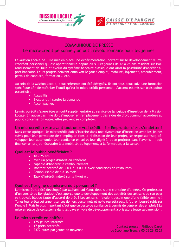 COMMUNIQUE DE PRESSE Le micro-crédit personnel, un outil révolutionnaire pour les jeunes La Mission Locale de Tulle met en place une expérimentation portant sur le développement du microcrédit personnel qui est opérationnelle depuis 2009. Les jeunes de 18 à 25 ans résidant sur l’arrondissement de Tulle et exclus du système bancaire classique ont ainsi la possibilité d’accéder au prêt bancaire. Leurs projets peuvent enfin voir le jour : emploi, mobilité, logement, ameublement, permis de conduire, formation … etc. Au sein de la Mission Locale, deux référents ont été désignés. Ils ont tous deux suivi une formation spécifique afin de maîtriser l’outil qu’est le micro crédit personnel. L’accent est mis sur trois points essentiels : • Accueillir • Evaluer et instruire la demande • Accompagner. Le microcrédit s’avère être un outil supplémentaire au service de la logique d’insertion de la Mission Locale. En aucun cas il ne doit s’imposer en remplacement des aides de droit commun accordées au public concerné. En outre, elles peuvent se compléter. Un microcrédit reste avant tout un « vrai crédit » ! « Emprunter c’est s’endetter ! Dans cette optique, le microcrédit doit s’inscrire dans une dynamique d’insertion avec les jeunes suivis pour leur permettre de s’impliquer dans la réalisation de leur projet, se responsabiliser, développer leur autonomie, leur confiance en soi et leur dignité, et se projeter dans l’avenir. Il doit financer un projet nécessaire à la mobilité, au logement, à la formation, à la santé. Quel est le public bénéficiaire ? • • • • • • 18 – 25 ans avec un projet d’insertion cohérent capable d’honorer le remboursement Montant accordé de 300 € à 3 000 € avec conditions de ressources Remboursable de 6 à 36 mois Taux d’intérêt indexé sur le livret A . Quel est l’origine du micro-crédit personnel ? Le microcrédit a été développé par Muhammad Yunus depuis une trentaine d’années. Ce professeur d’université du Bengladesh s’est aperçu que le développement des activités des artisans de son pays se trouvait bloqué faute d’accord de prêt ! Les artisans n’avaient besoin que d’une faible somme ! Yunus leur prêta cet argent sur ses deniers personnels et ne le regretta pas. Il fut remboursé rubis sur l’ongle ! Mais le plus important c’est que ce geste de confiance à permis de générer des emplois ! La mise en place de ce système dans les pays en voie de développement a pris alors toute sa dimension . Le micro-crédit en chiffres • 175 jeunes informés • 17 prêts accordés • 2372 euros par jeune en moyenne. Contact presse : Philippe Darut ou Stéphane Trencia 05 55 26 92 21 TEMOIGNAGE D’ANAIS Anaïs, diplômée d’un BTS Conseillère en Economie Sociale et Familiale était connue de la Mission Locale depuis début 2009 puisqu’elle s’était appuyée sur nos services dans le cadre de la recherche de solutions à la suite de son BTS. Elle a pu saisir l’opportunité d’une offre d’emploi, dans le cadre d’un CAE Passerelle, débutant mi novembre 2009, pour une durée de 12 mois. Pour pouvoir accepter cet emploi, Anaïs a utilisé sur les premiers jours du contrat la voiture de sa mère, qui s’est elle même alors retrouvée sans véhicule. Elle a sollicité l’étude d’un micro-crédit dans ce cadre, afin de pouvoir envisager l’achat d’une voiture personnelle. Le montant de la demande s’est élevé à 2400 € sur 18 mois. Ce micro-crédit a été accepté dans un délai rapide d’un mois. Ceci a permis à Anaïs de suivre son emploi en CAE Passerelle dans de bonnes conditions, et d’acquérir par cette expérience de nouvelles compétences à l’attention d’un public en difficulté. En parallèle, elle a pu reprendre la poursuite de ses études afin de terminer son cursus par correspondance avec le CNED, en vue de l’obtention du Diplôme d’Etat de conseillère en économie sociale et familiale. Actuellement en fin de contrat CAE Passerelle, elle a recherché activement un nouvel emploi et cela débouche sur un nouveau CDD de 18 mois dans le domaine de l’animation sociale auprès de jeunes en difficultés. Sans l’obtention de ce micro crédit, Anaïs se serait trouvée dans une situation complexe où elle n’aurait pu contracter un prêt au niveau d’une banque et donc n’aurait pu faire l’acquisition d’un véhicule. Elle aurait eu des difficultés pour se rendre sur son lieu de travail ce qui aurait généré une difficulté pour se maintenir sur son poste. Elle a été en capacité d’honorer tous les versements, comme prévu au moment du montage de ce projet. Il lui reste actuellement 8 mensualités qu’elle pourra payer sans difficulté, puisque elle sera salariée sur les prochains mois. TEMOIGNAGE DE FABIEN Fabien avait une expérience dans le domaine de la vente. Son expérience professionnelle passée lui permettait d’être indemnisé au titre de l’allocation de retour vers l’emploi, pour un montant de 725 € / mois. Il s’est adressé à nos services en octobre 2009 avec le projet de se former aux Caces 1-3-5, attestations permettant d’exercer le métier de cariste. Il avait en effet identifié de nombreuses offres d’emploi non pourvues pour lesquelles ces CACES étaient requis. Avec l’aide de la Mission Locale, il a recherché des possibilités de passer les CACES 1,3 et 5 sur la Corrèze. Il a fait établir des devis et a choisi la proposition la moins chère et la plus rapide, pour un montant de 1052 €. Les solutions de financement par Pôle Emploi ou dans le cadre du Dispositif de Professionnalisation vers l’Emploi (DIPE) ont été envisagées mais n’ont pas pu être acceptées car elles auraient nécessité une promesse d’embauche ferme, ce que Fabien n’a pas réussi à obtenir. Le programme de formation financé par le Conseil régional ne proposait une éventuel